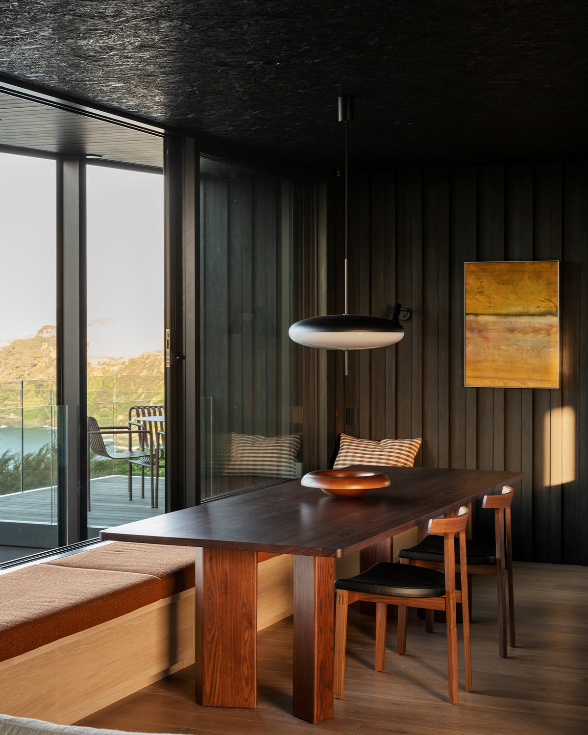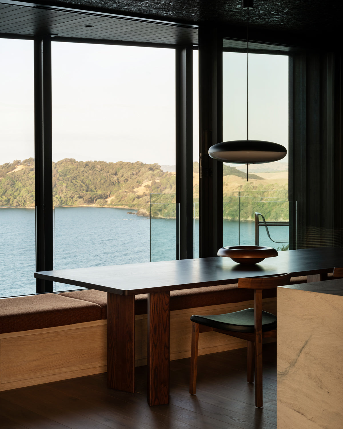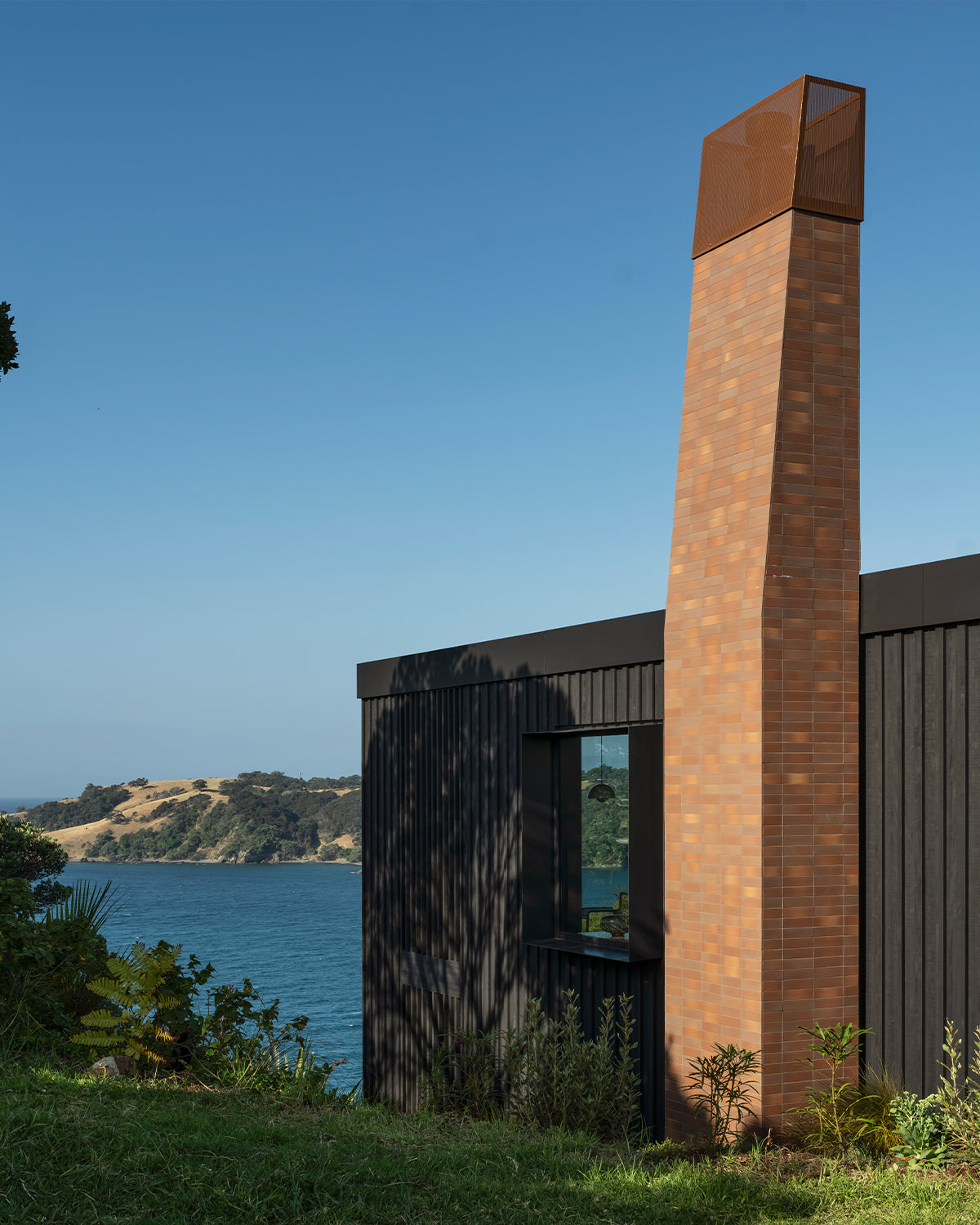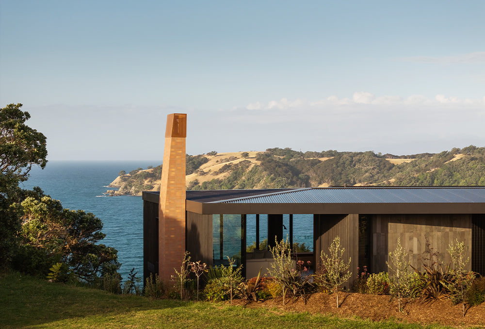 Tucked snuggly into a clifftop site with incomparable views of both ocean and bush, Outpost is striking in its apparent simplicity, composed as a moment of stillness amid the wild beauty of Waiheke Island, a 40-minute ferry ride from Auckland. The project, by Libby Elmore and Oli Booth of Elmore Booth, started a decade ago, with the construction of a 10-square-metre hut, commissioned so the owners could enjoy the island while concentrating on the extensive regeneration of the sloping terrain. This sequence of events provided a singular opportunity, allowing both client and architect to gain a rare familiarity with the site and the climatic conditions, and to design the new, larger-scale home.