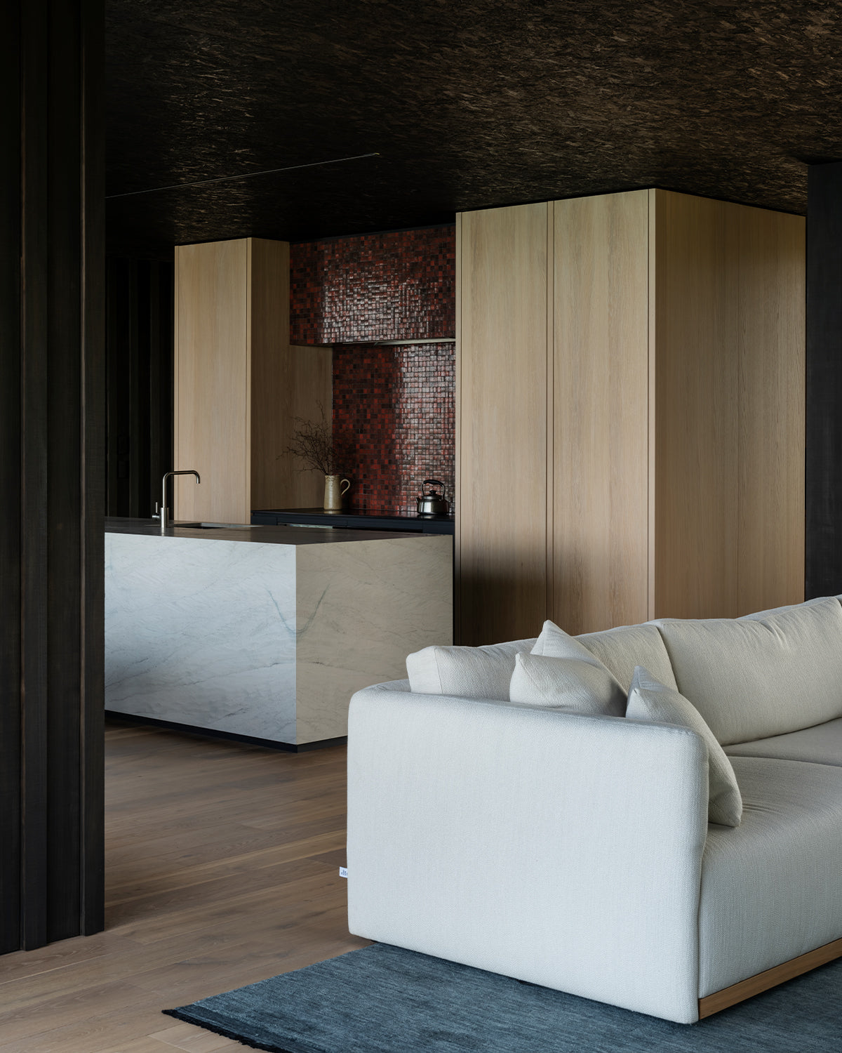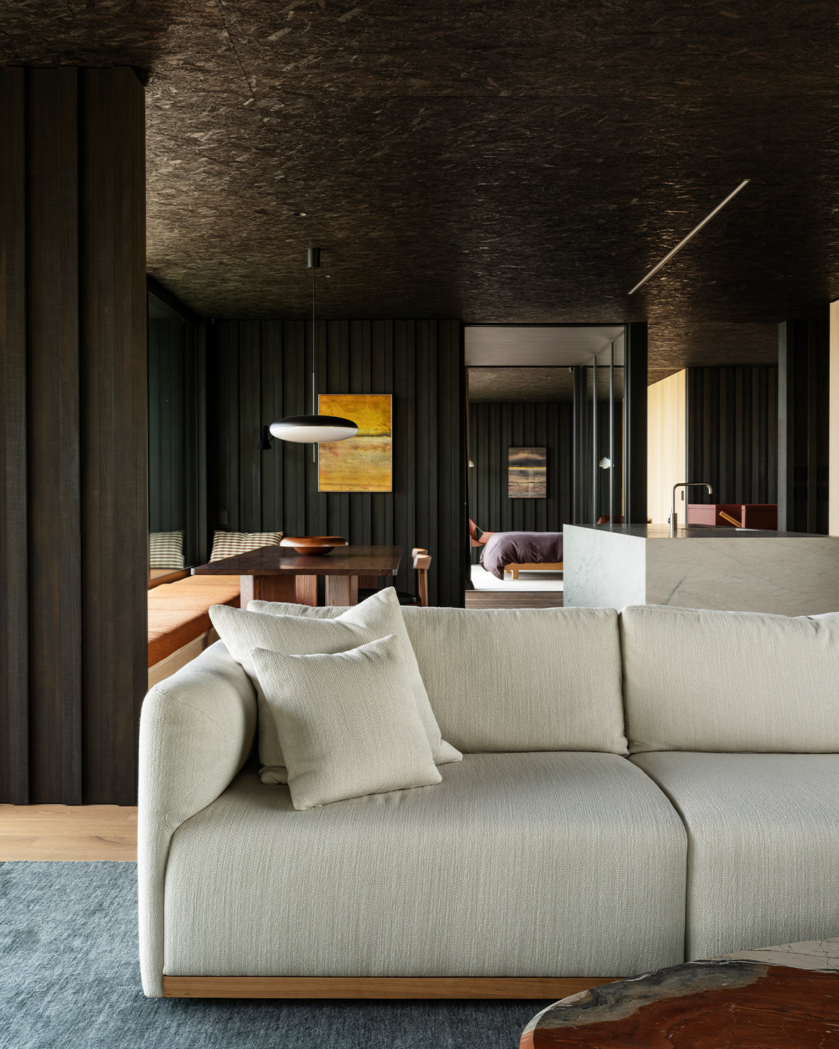 Elmore explains that a goal for this project was to create something that was ‘of’ the land. This was achieved through both the low-lying form and the landscaping by Xanthe White Design that features planted mounds to visually embed the home into the site. “We love how the house appears to oscillate in and out of the landscape from the front facade,” she continues. “It feels deeply embedded into the landscape around. It creates a sense of intrigue for what’s to come when you glimpse views through the house and out the other side.”