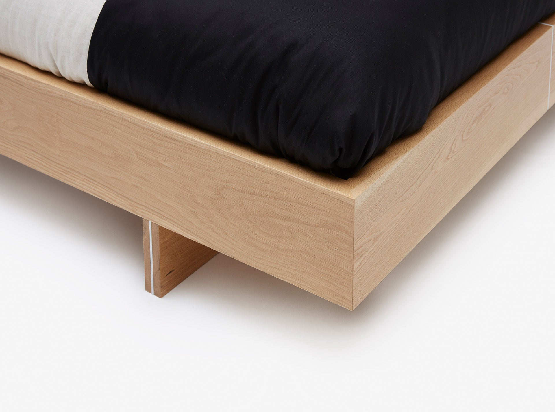 Design details and construction of the Fenton Bed have been carefully considered to create the bed with a miter join at the front corners, rather than the traditional butt join. Powder coated steel inlayed strips at the side of the legs and the end of the bed provide a distinct detail to contrast with the solid timber or HPL laminate.