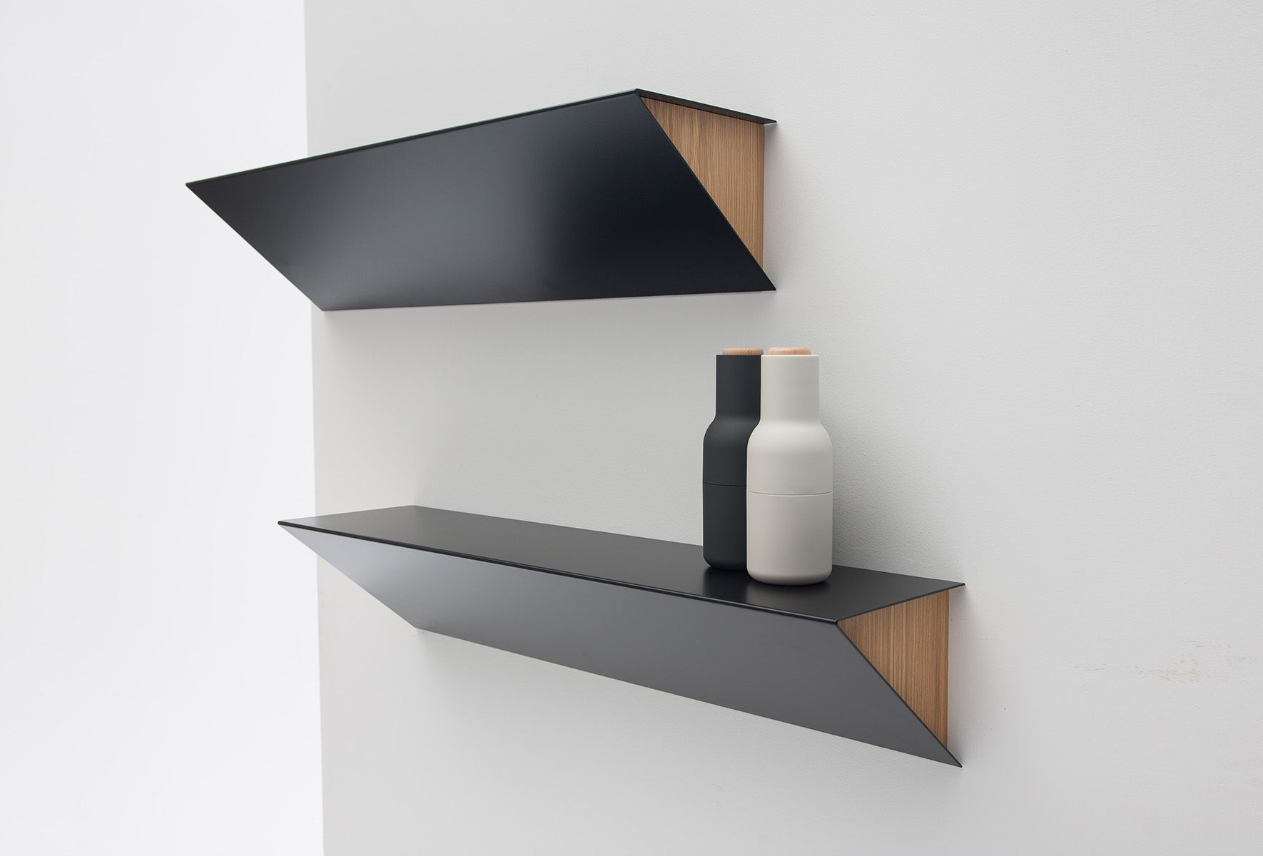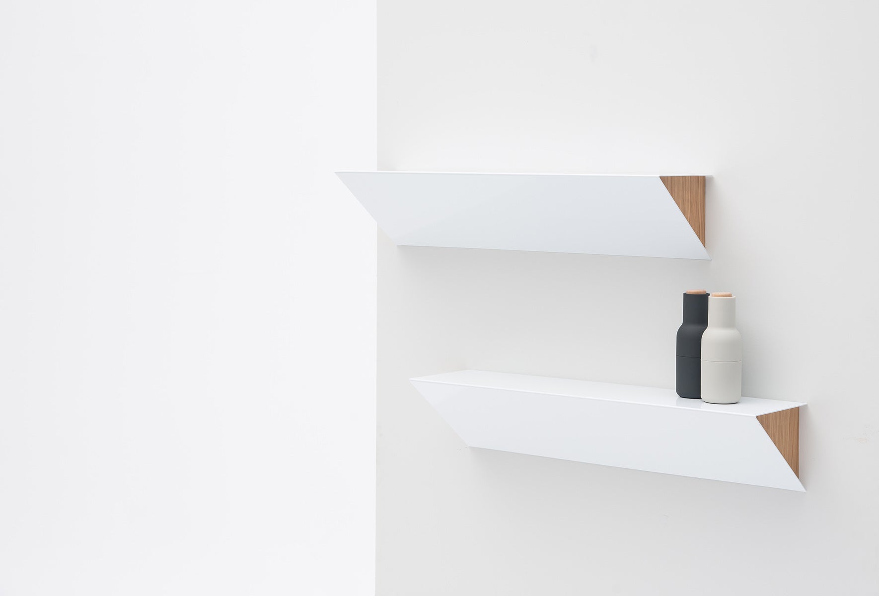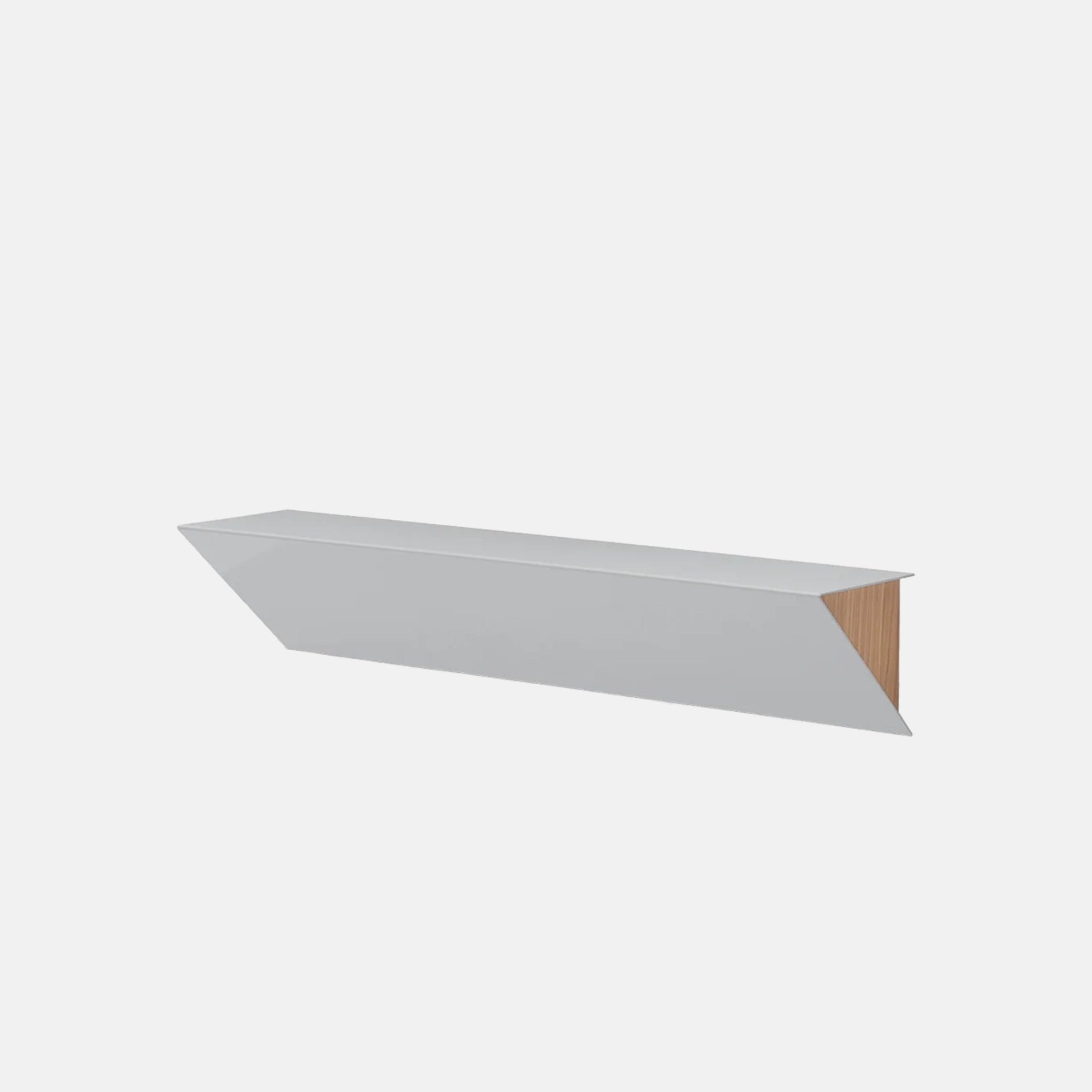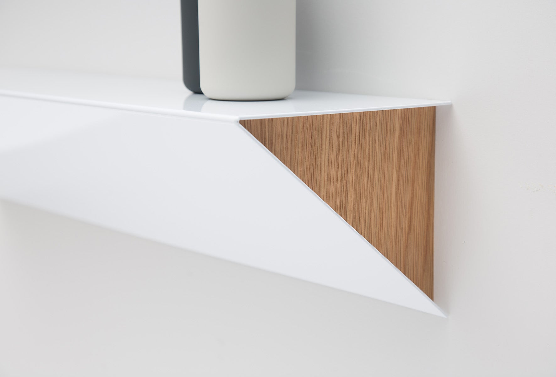 The clean and simple use of folded aluminium and oak timber inserts, creates a shelf that is light yet strong, with a load capability of 30kg. The shelf simply slots onto an aluminium bracket supplied, meaning there is no visible fixings or mounts.