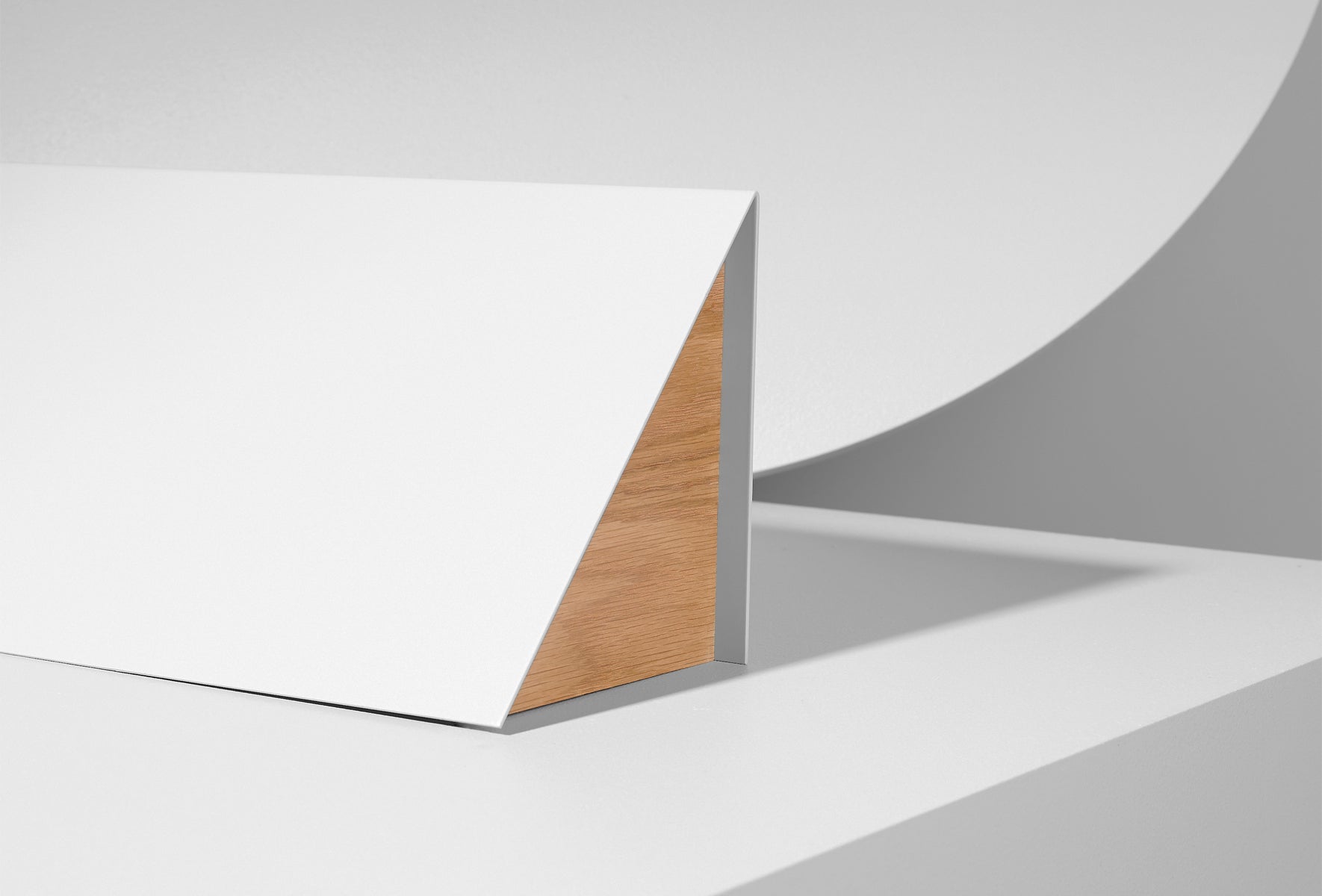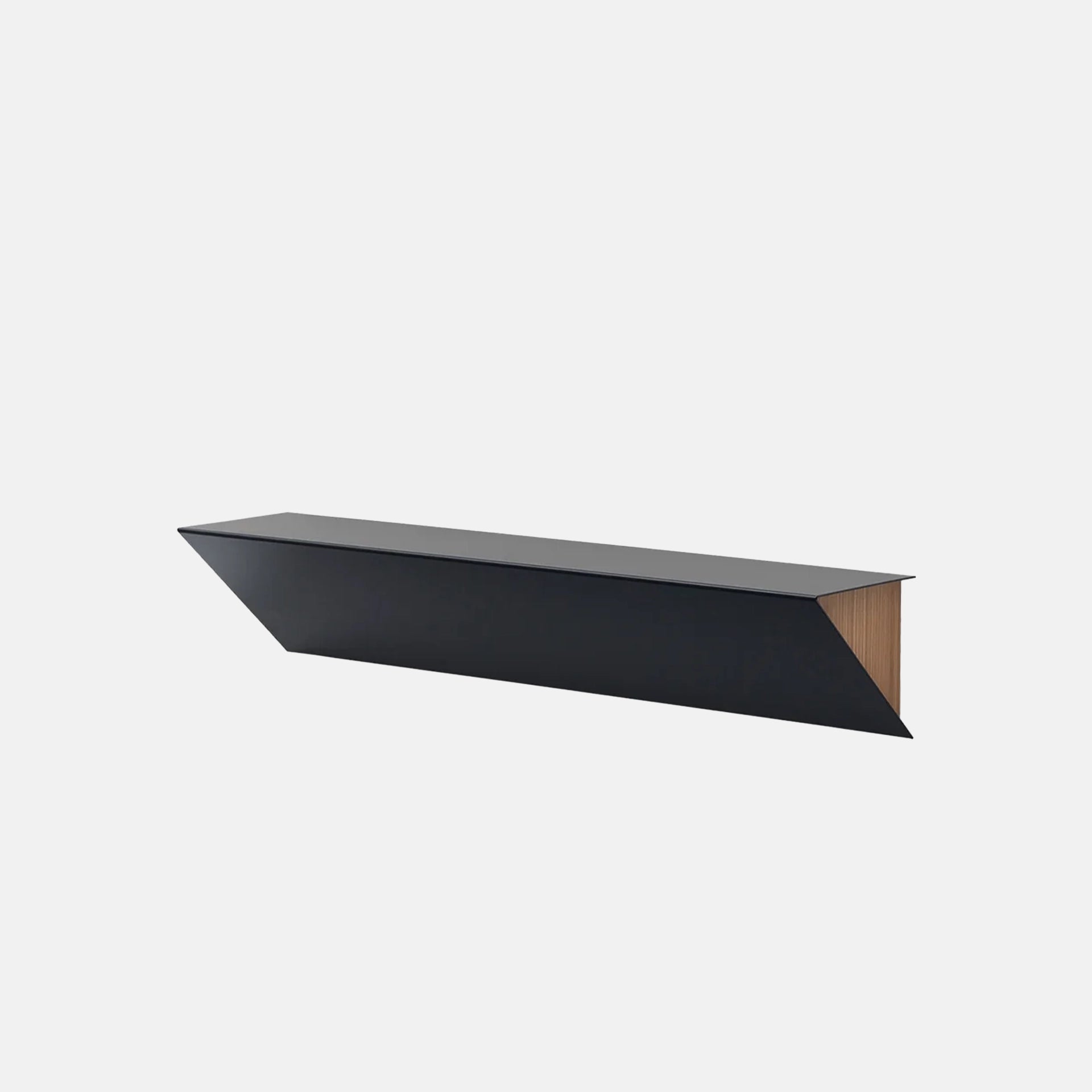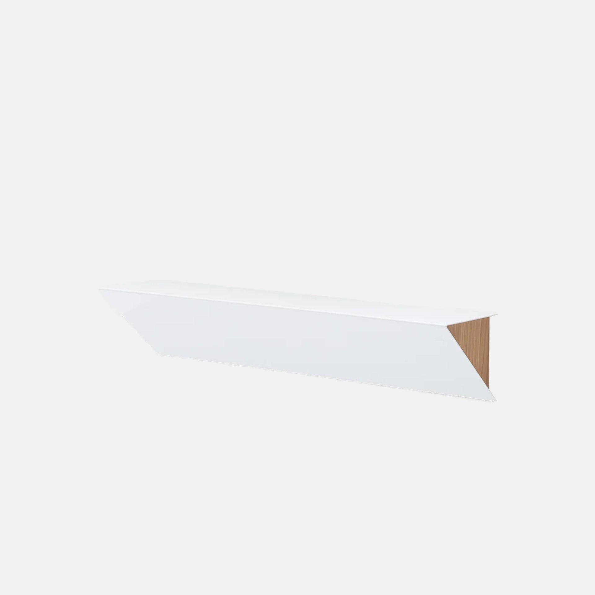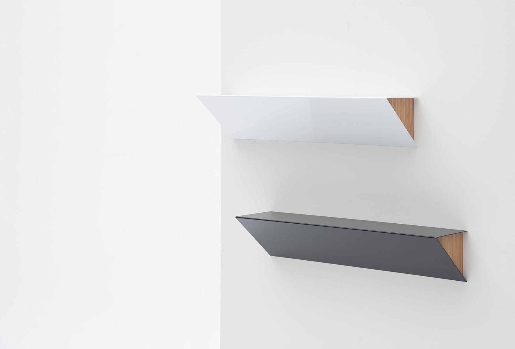 The clean and simple use of folded aluminium and oak timber inserts, creates a shelf that is light yet strong, with a load capability of 30kg. The shelf simply slots onto an aluminium bracket supplied, meaning there is no visible fixings or mounts.