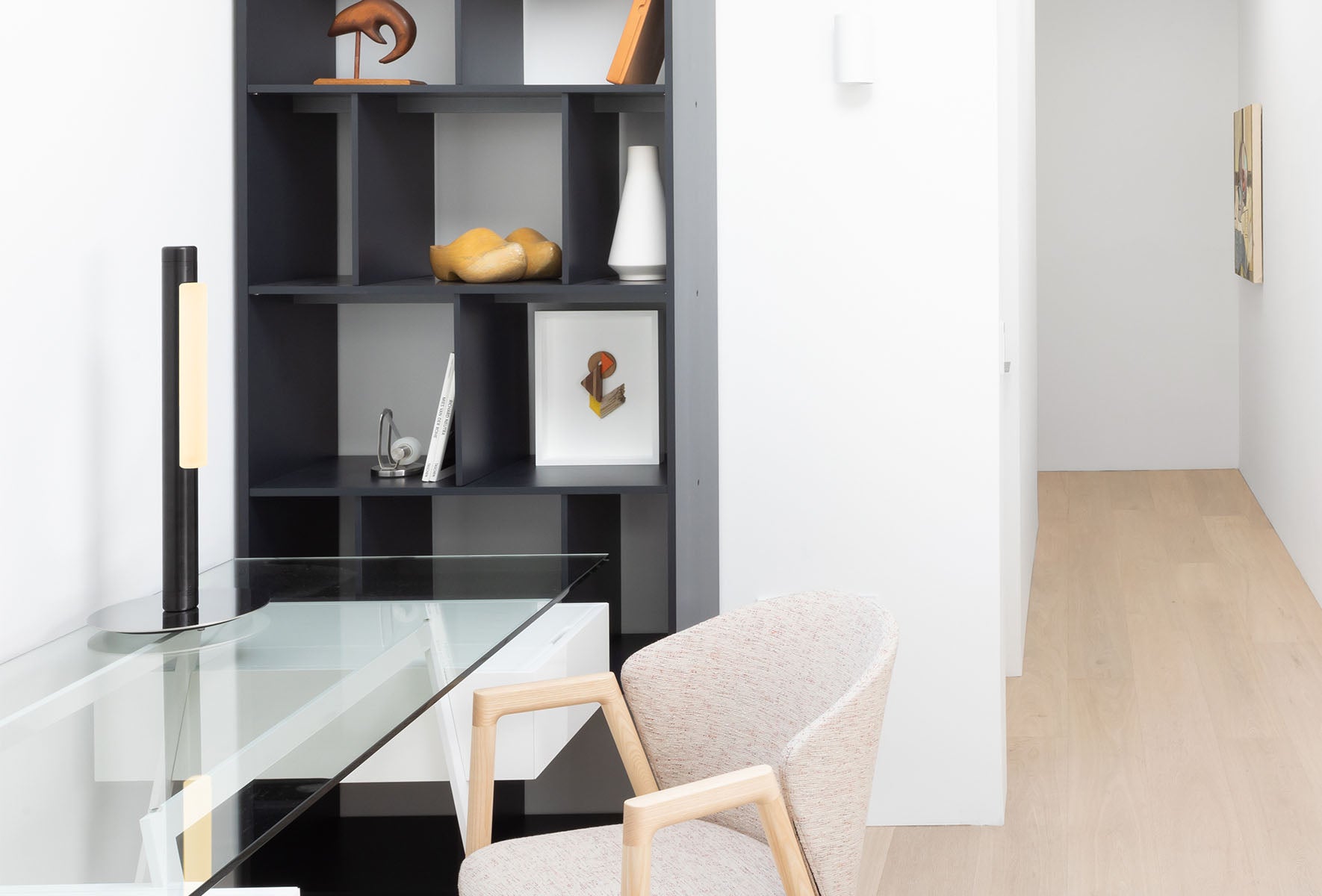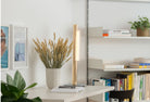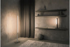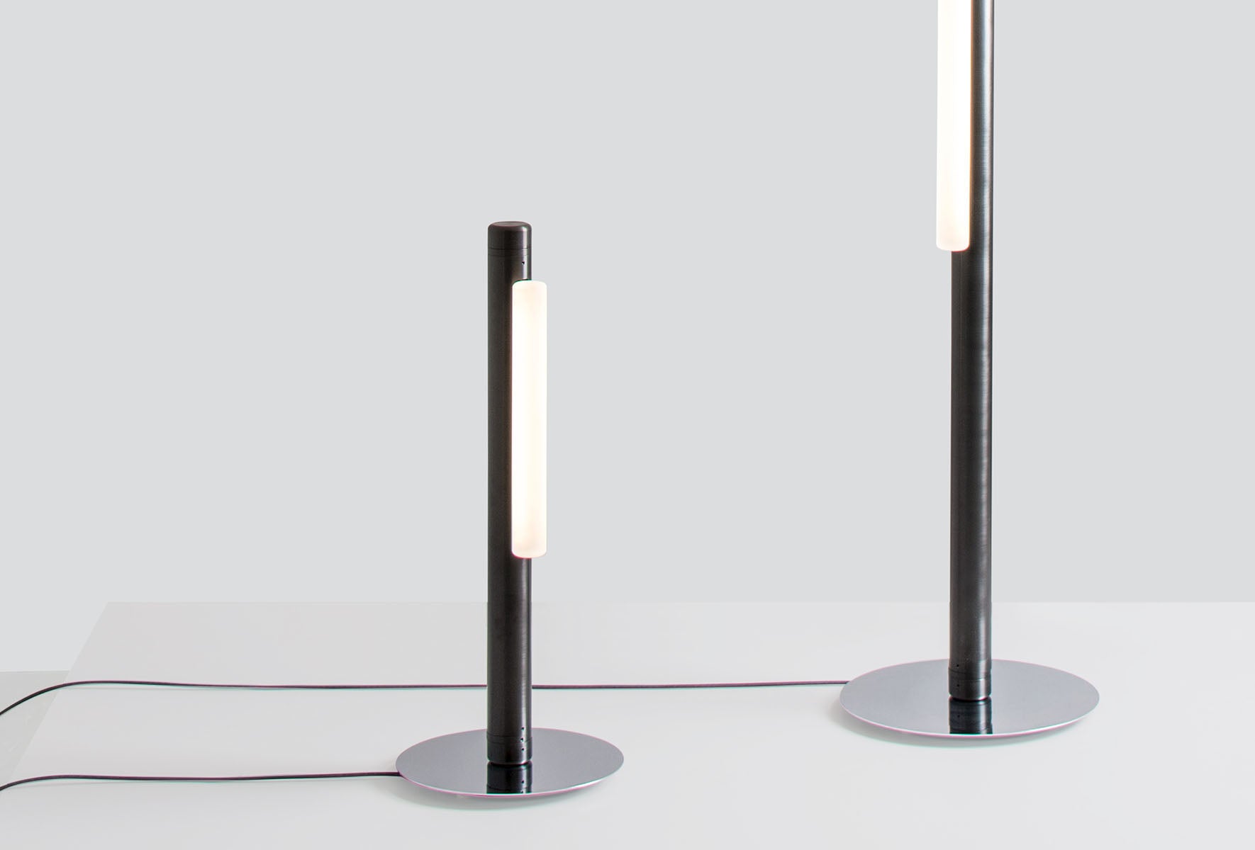 Stark, elegant, and resolute, the Pipeline 40 table lamp and Pipeline 125 floor lamp stand upright, balancing on a chrome mirror weighted base reflecting its stance and creating the illusion of floating.