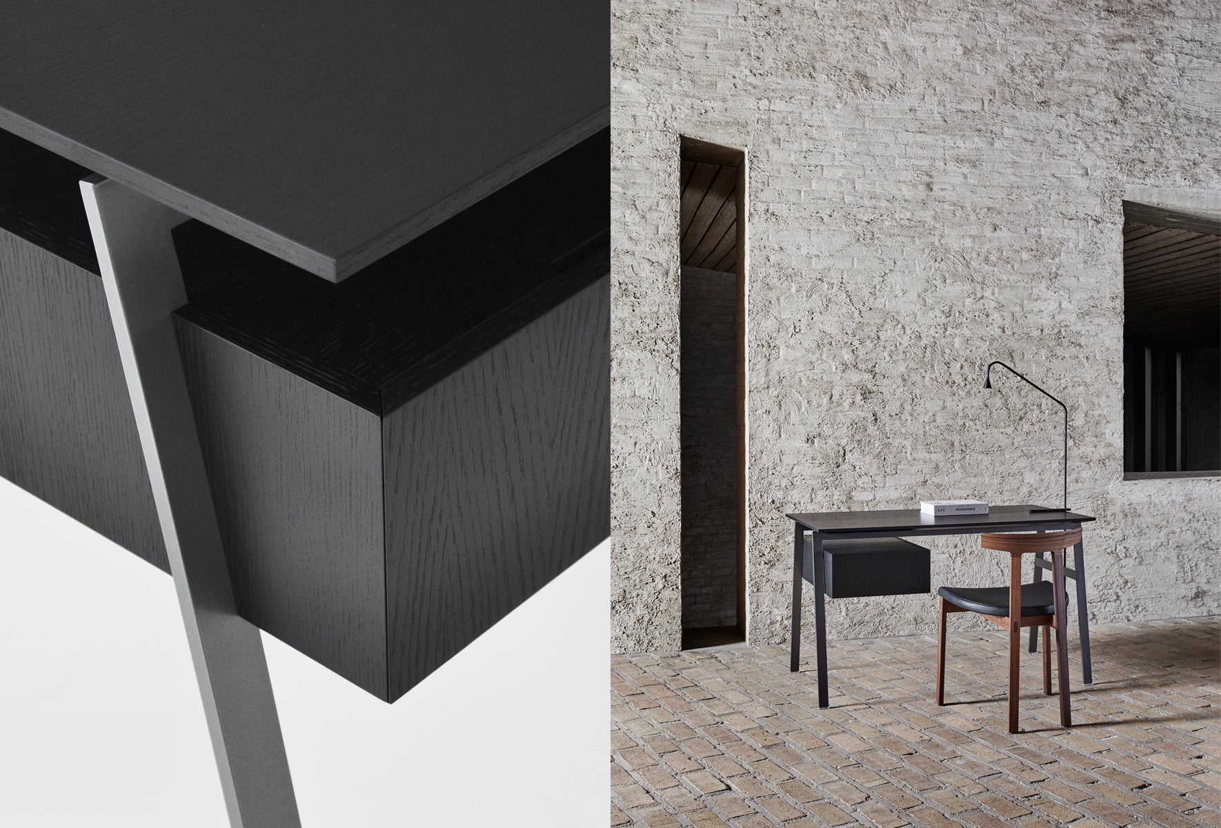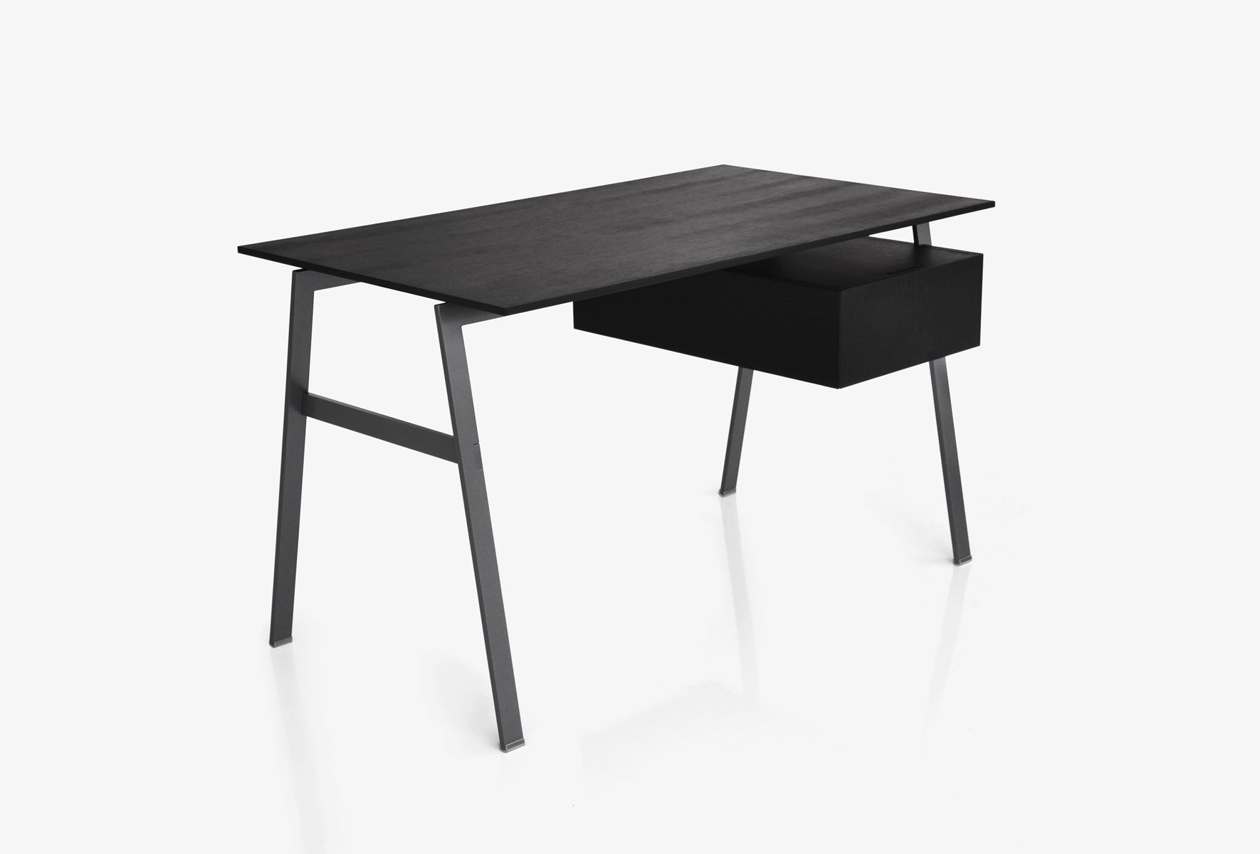 Single or double drawers are available and can be configured to either side of the desk according to individual needs. An innovative construction method allows the drawers to float below the top giving visual lightness to the design while offering rigidity to the construction. The drawers include integrated cable management compartments large enough to neatly organise multiple cables and accessories.