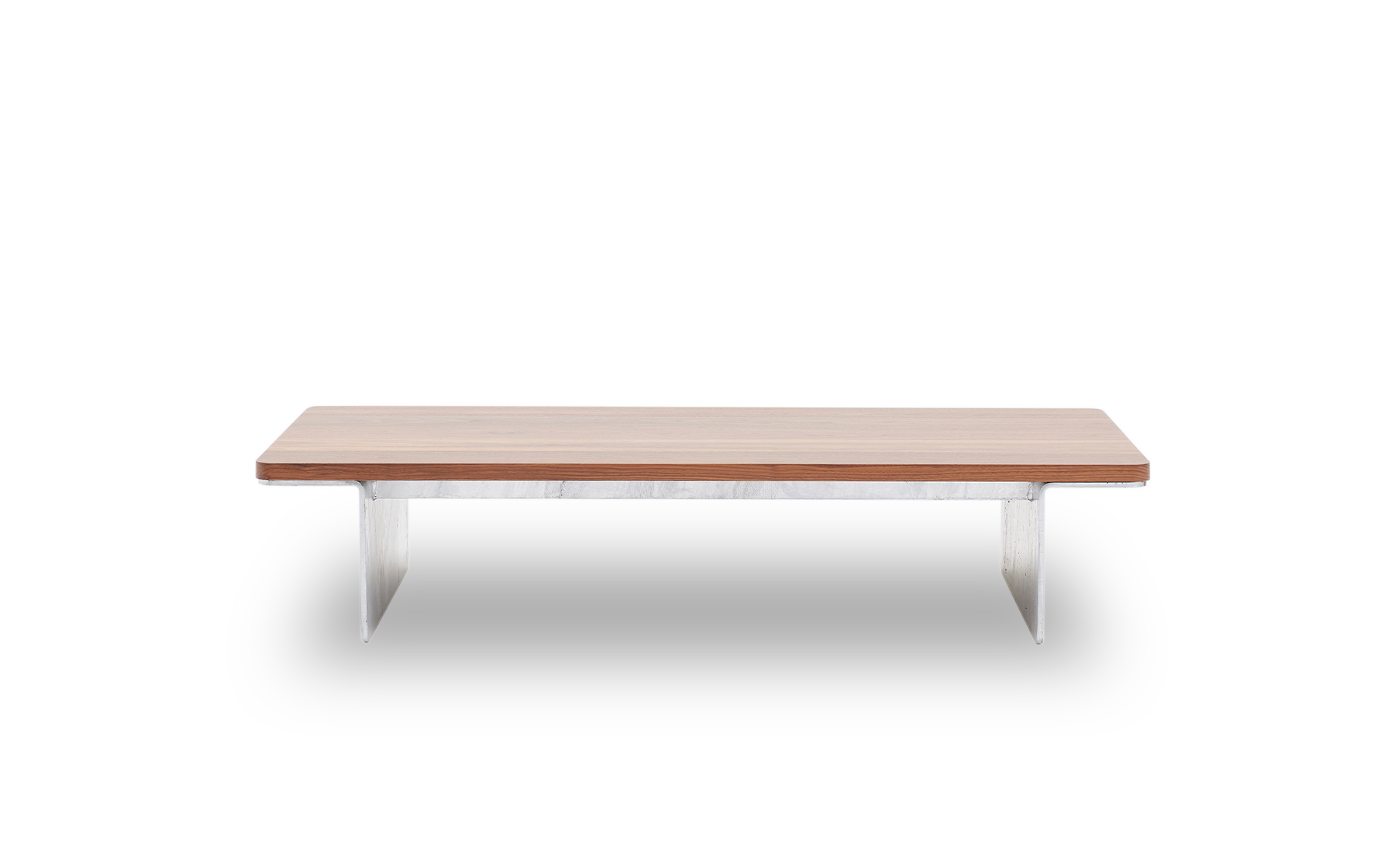 The table features a large rectangular timber top available in either solid oak or American walnut. The base is crafted from folded steel that can be treated with a raw galvanised finish or powder coated white or black.