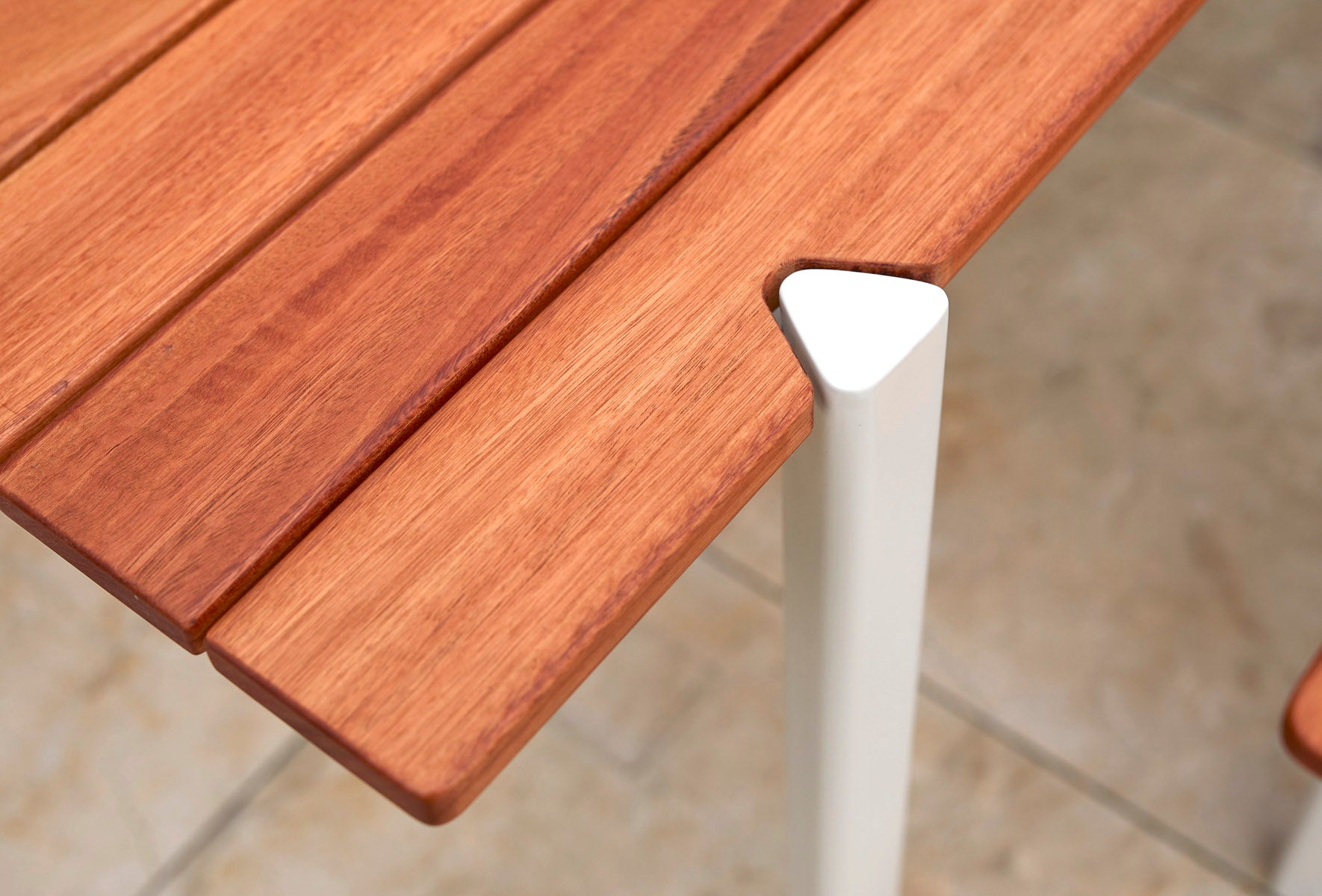 Constructed using a powder-coated stainless steel frame and a table top made from a Garapa timber (pre-oiled).