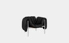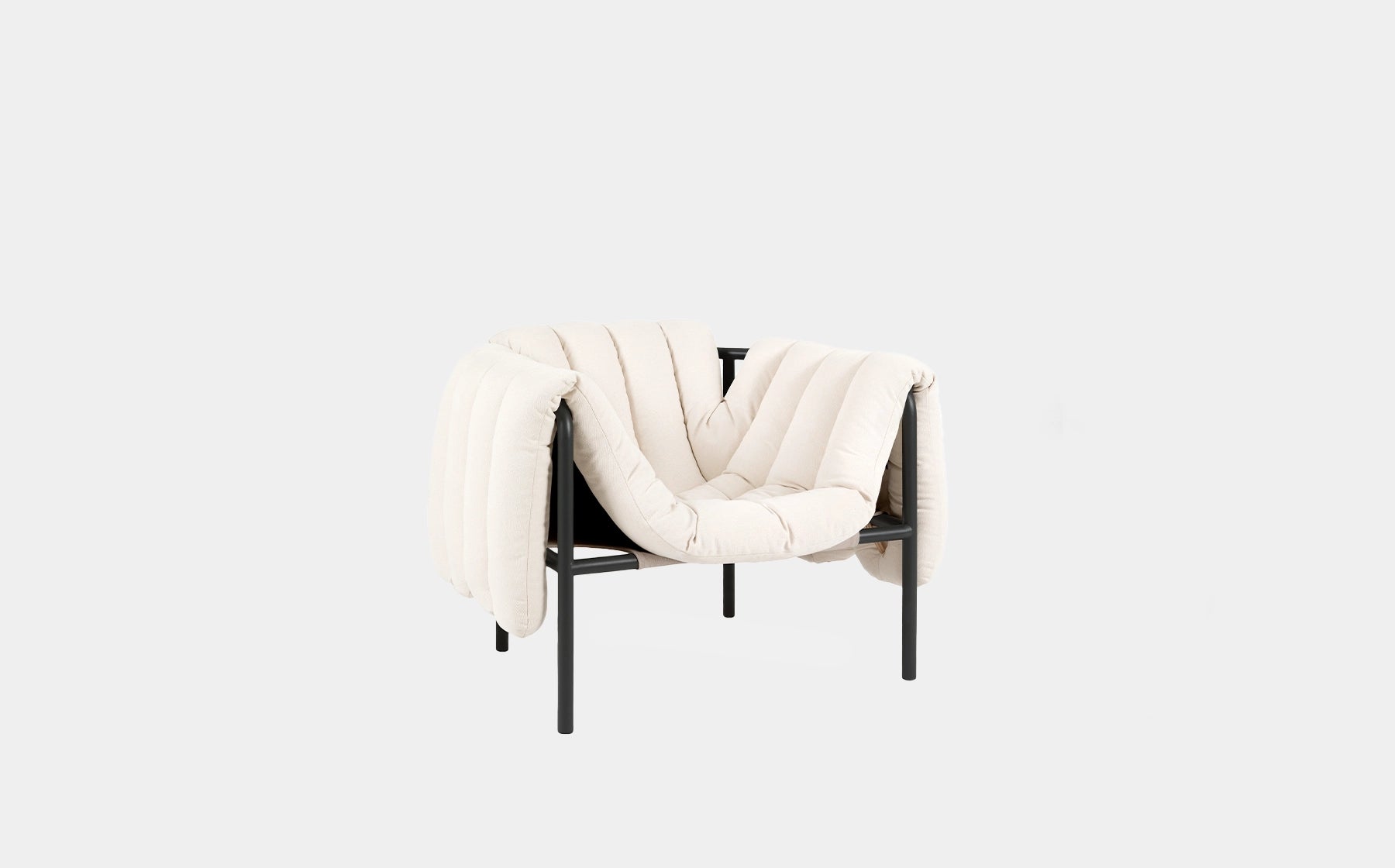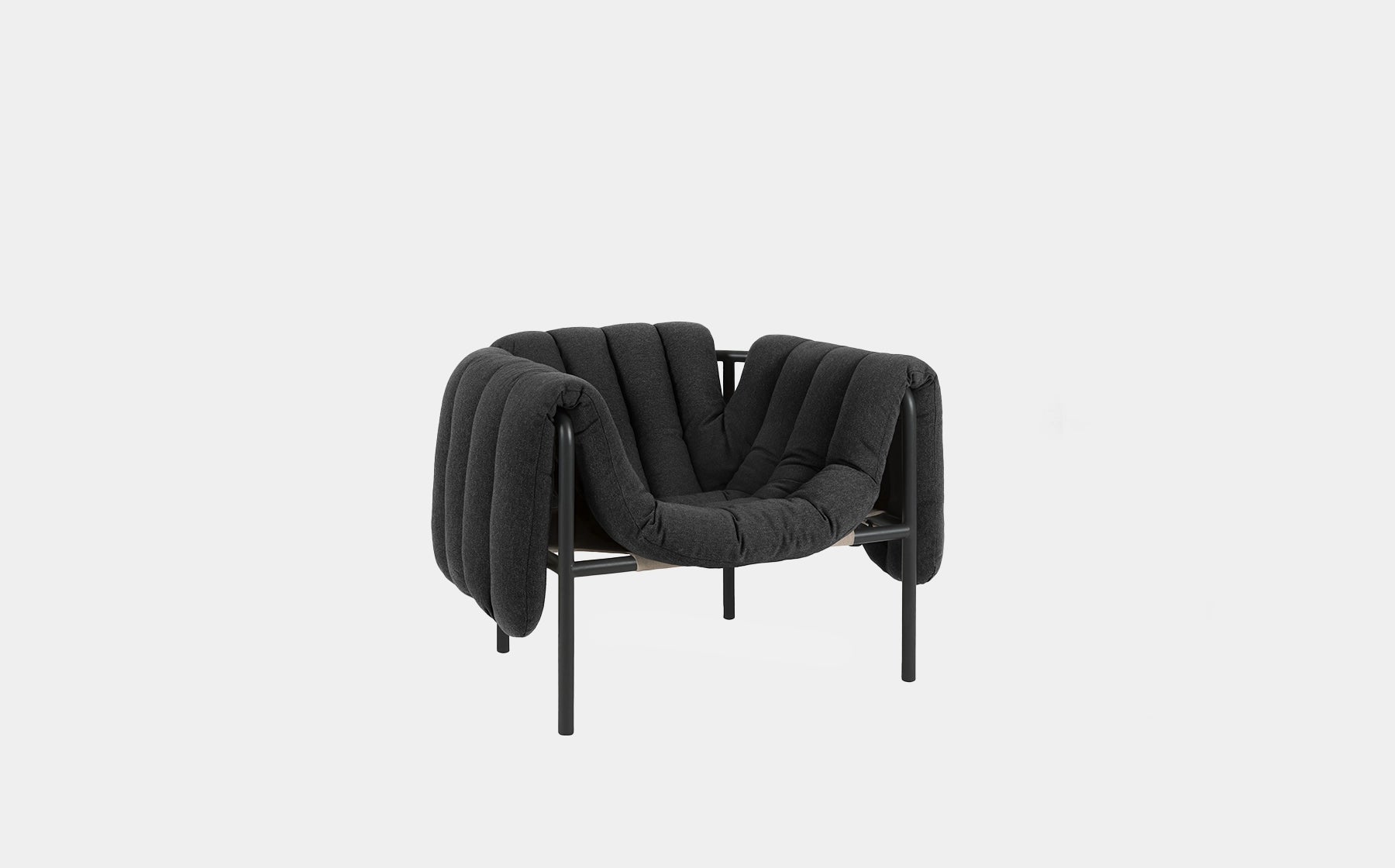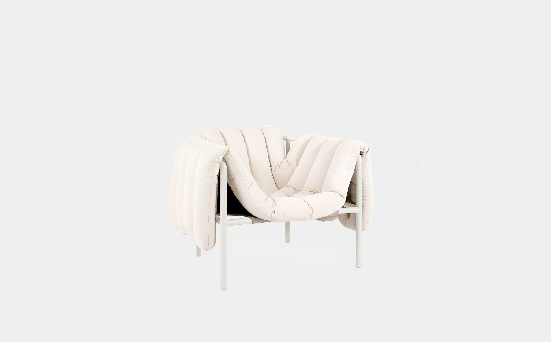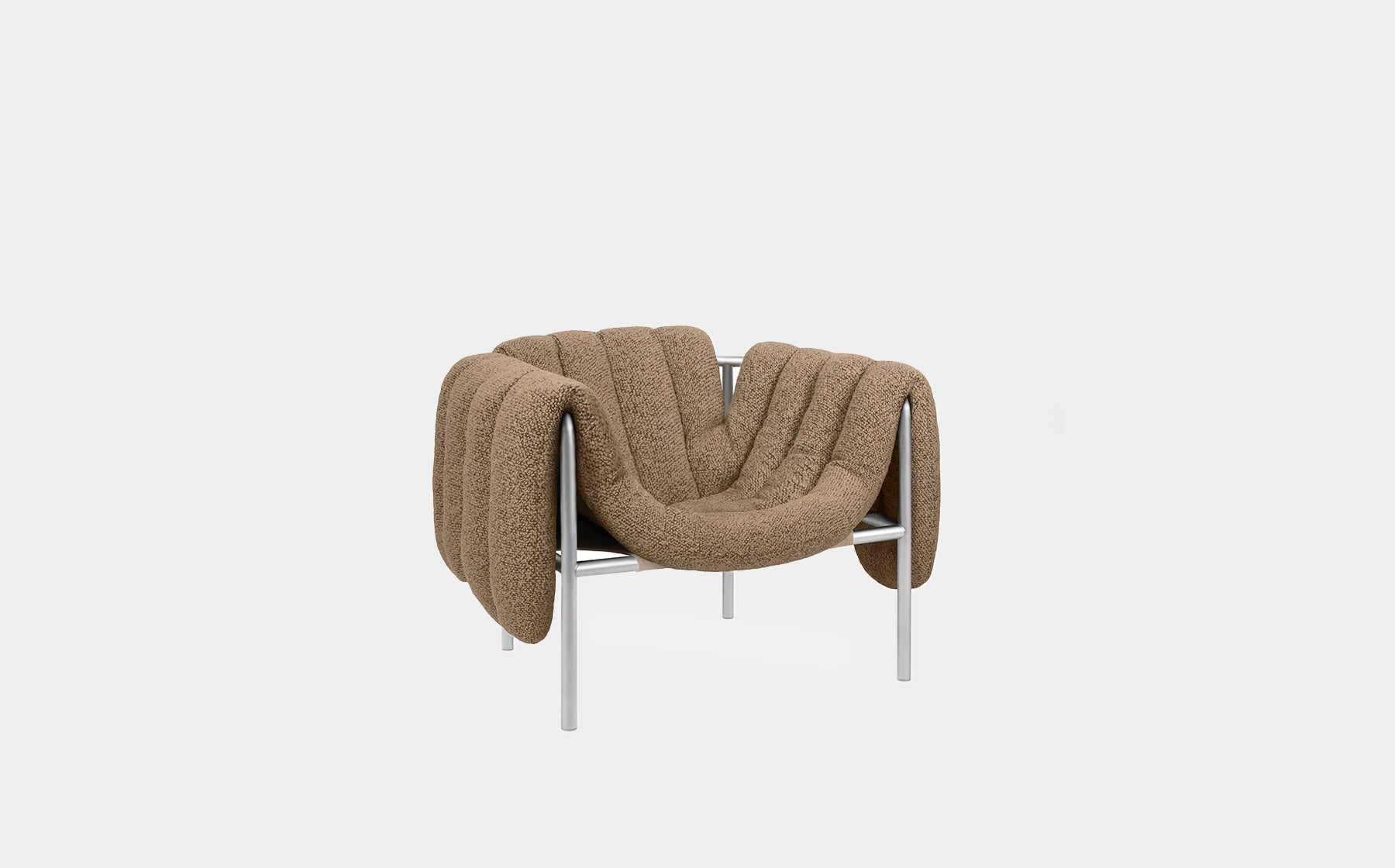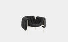 The detachable upholstery of the Puffy Lounge Chair is fat and plump, its generous shape spills freely over the sides of a tubular steel frame which, in stark contrast, is hard-lined and strong. The two key elements of this seating design by Faye Toogood are in purposeful and playful juxtaposition. The elementary frame is inspired by the rational structure of classic modernist design, whilst the extravagant quilt-like upholstery warmly embraces and envelopes, is comforting and reassuring. The Puffy Chair frame is available in powder-coated or sand-blasted steel finishes and a choice of thick canvas, chunky bouclé or luxurious leather upholstery.