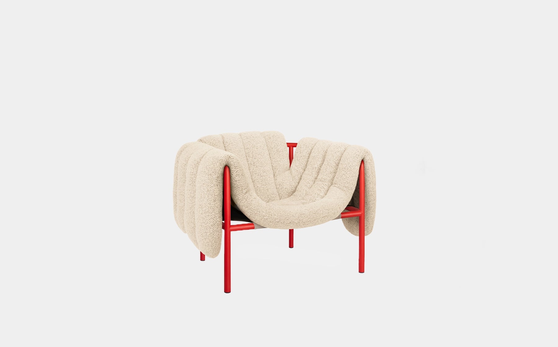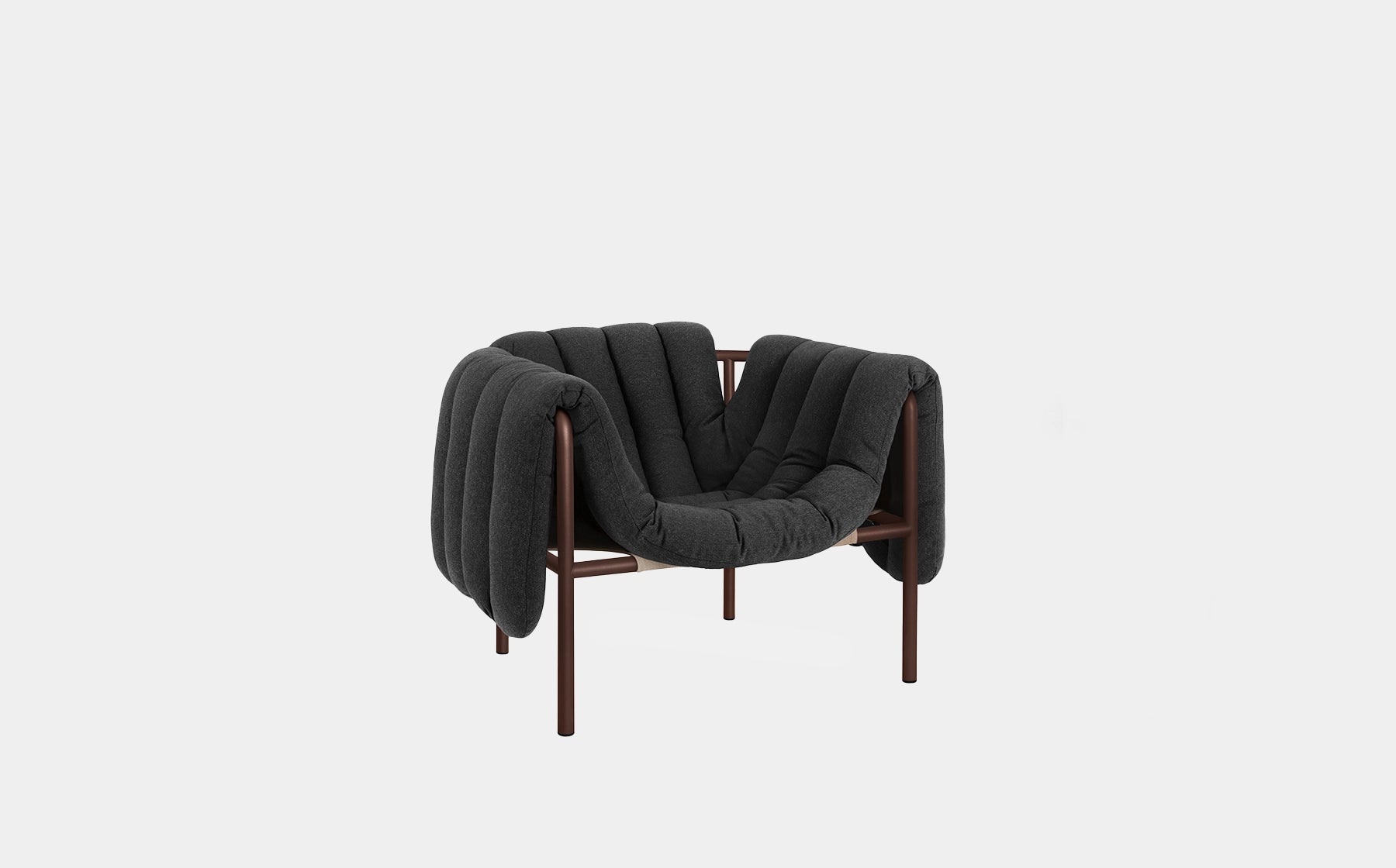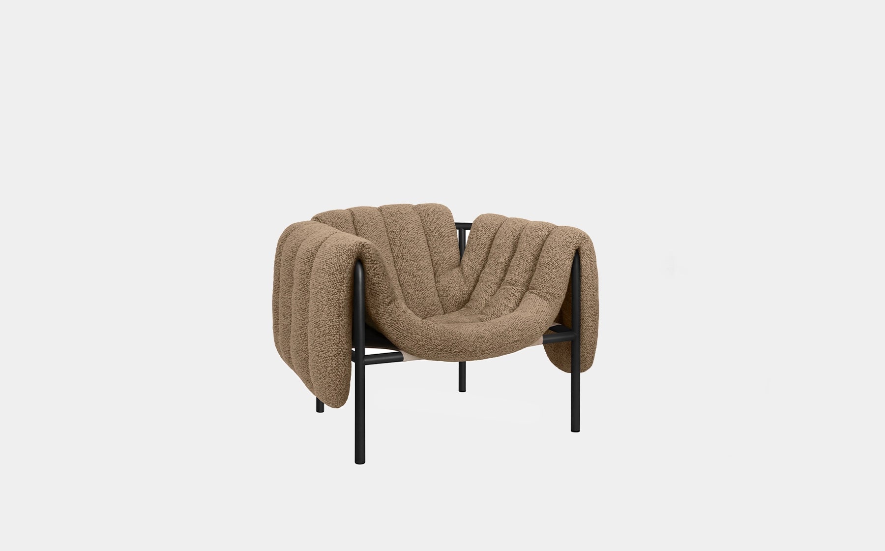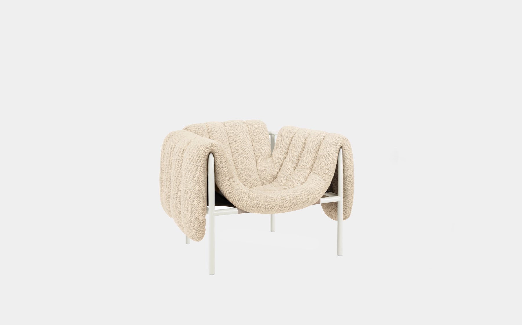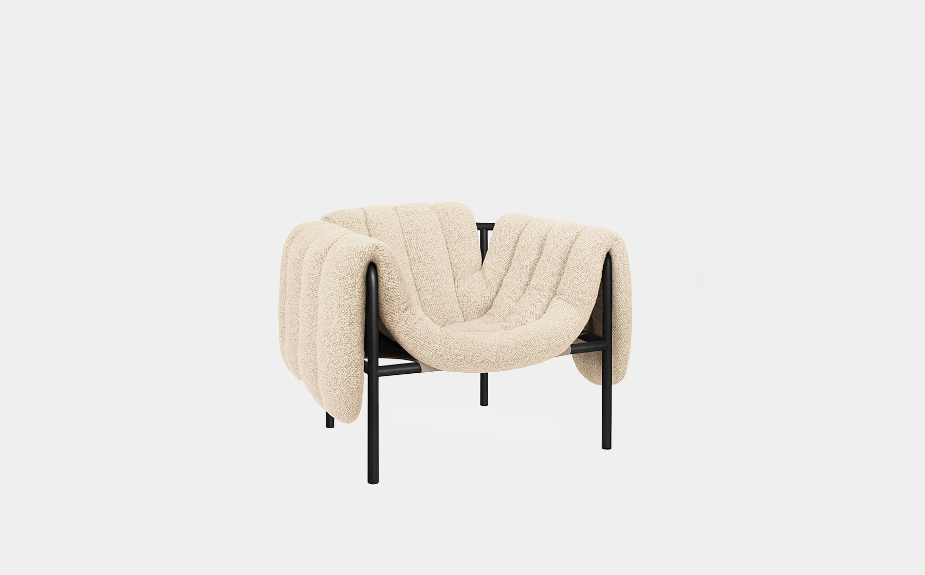 The detachable upholstery of the Puffy Lounge Chair is fat and plump, its generous shape spills freely over the sides of a tubular steel frame which, in stark contrast, is hard-lined and strong. The two key elements of this seating design by Faye Toogood are in purposeful and playful juxtaposition. The elementary frame is inspired by the rational structure of classic modernist design, whilst the extravagant quilt-like upholstery warmly embraces and envelopes, is comforting and reassuring. The Puffy Chair frame is available in powder-coated or sand-blasted steel finishes and a choice of thick canvas, chunky bouclé or luxurious leather upholstery.