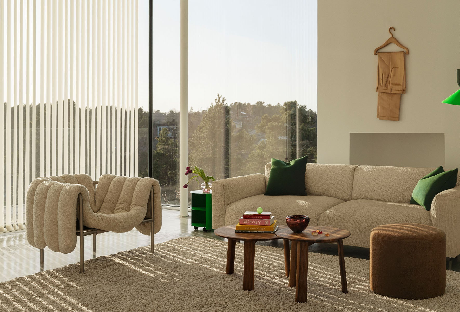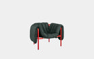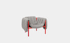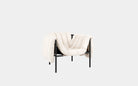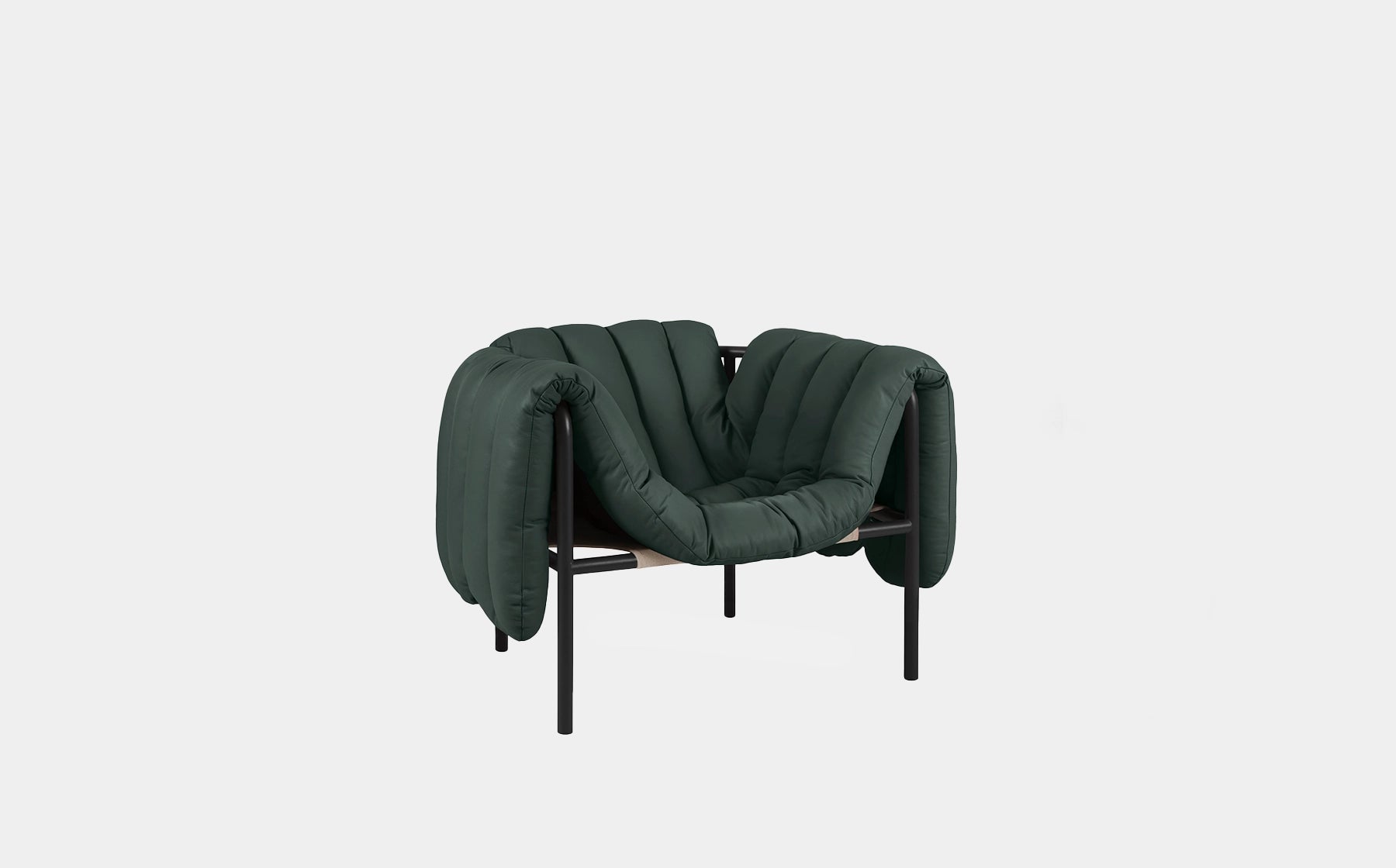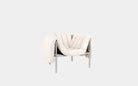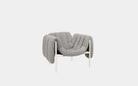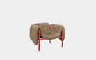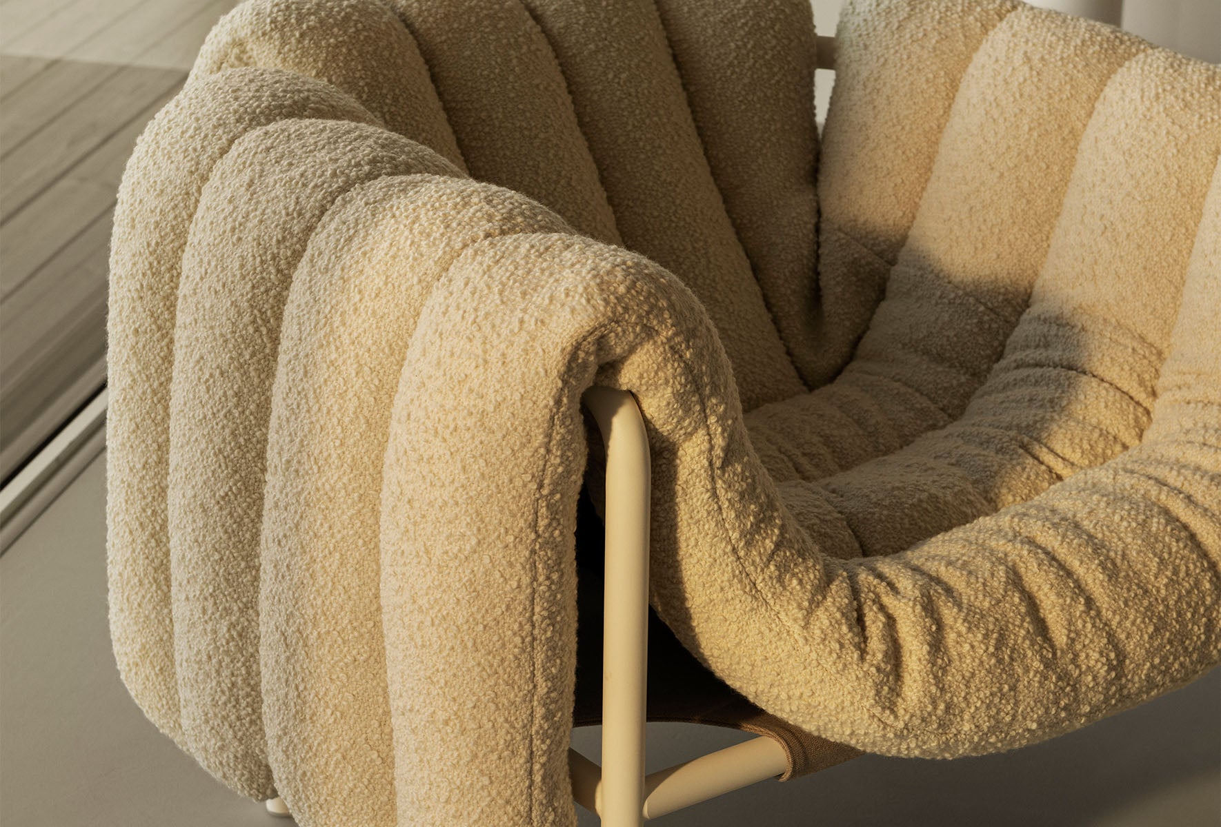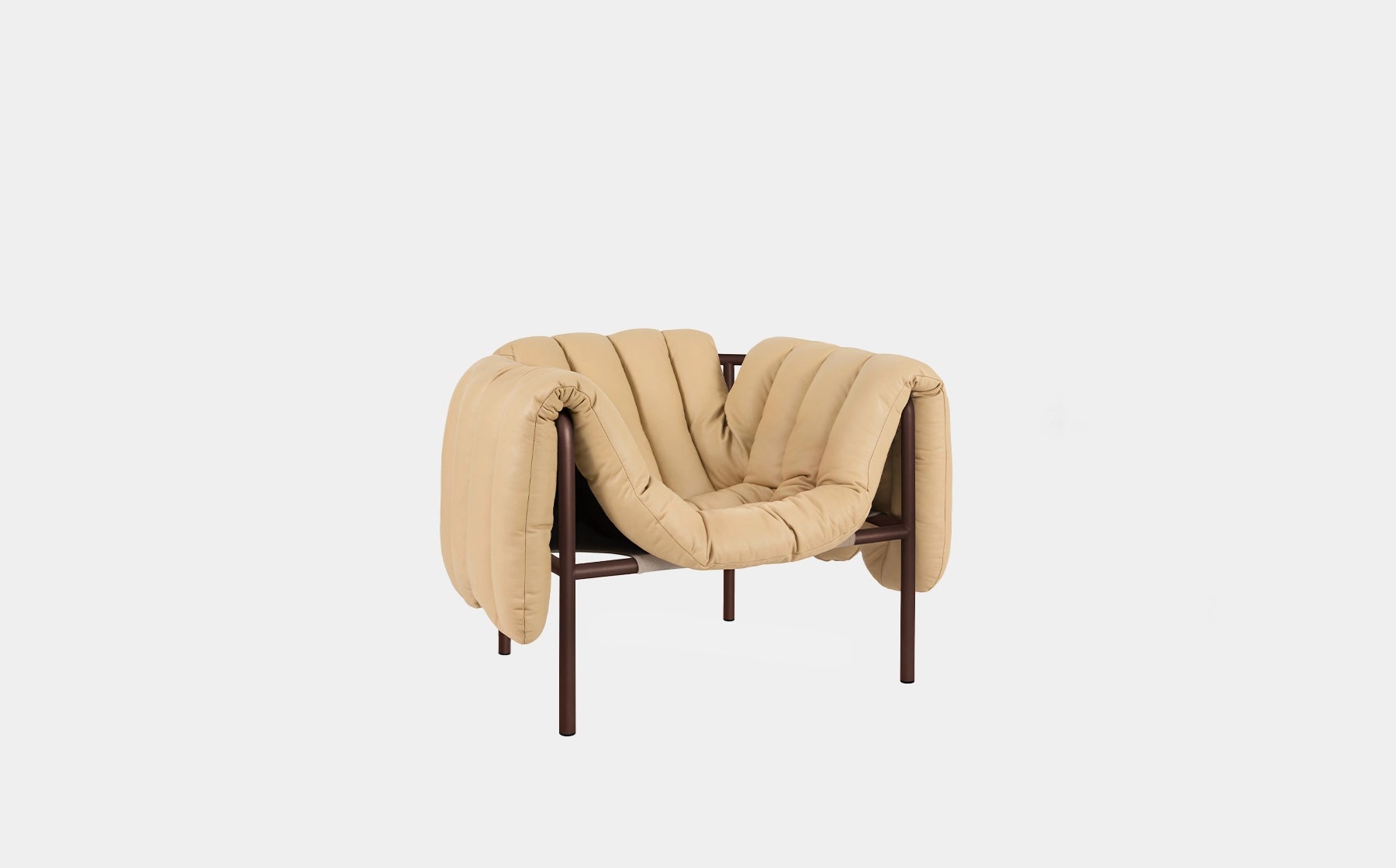 The detachable upholstery of the Puffy Lounge Chair is fat and plump, its generous shape spills freely over the sides of a tubular steel frame which, in stark contrast, is hard-lined and strong. The two key elements of this seating design by Faye Toogood are in purposeful and playful juxtaposition. The elementary frame is inspired by the rational structure of classic modernist design, whilst the extravagant quilt-like upholstery warmly embraces and envelopes, is comforting and reassuring. The Puffy Chair frame is available in powder-coated or sand-blasted steel finishes and a choice of thick canvas, chunky bouclé or luxurious leather upholstery.