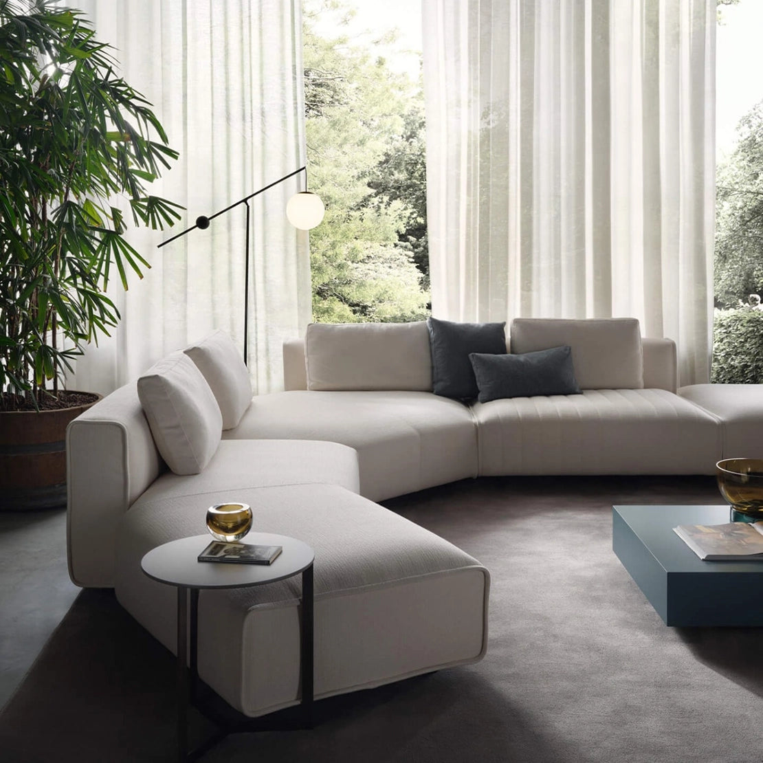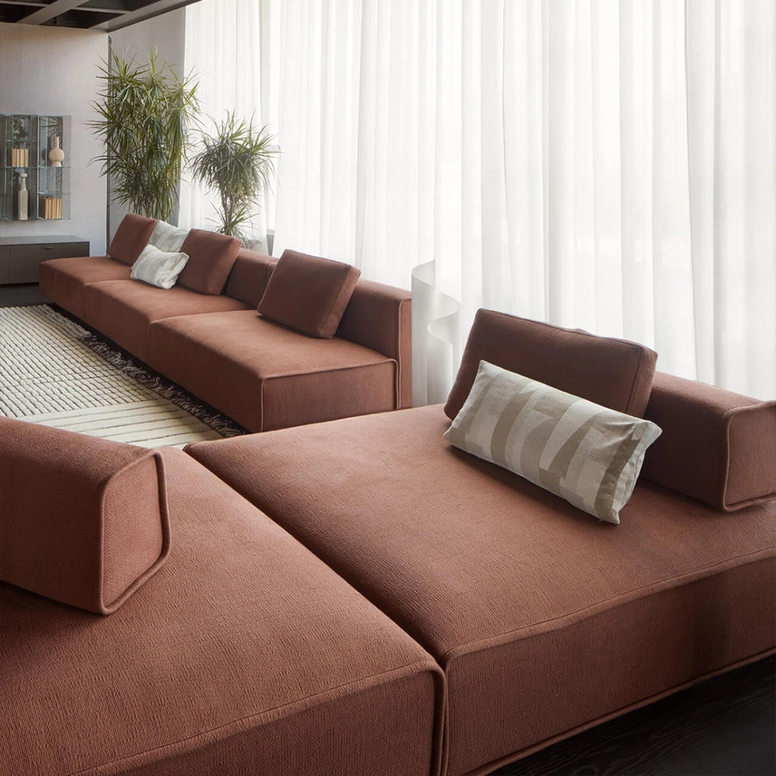 Every element of Niveaux reflects Lema’s signature craftsmanship. Its soft, architectural forms rest lightly on discreet bases, creating an interplay of floating volumes and luxurious comfort. Each module — from deep seats to refined backrests and cushions — can be freely combined, allowing you to compose layouts that express your personal style, from minimalist linear arrangements to dynamic, layered compositions.