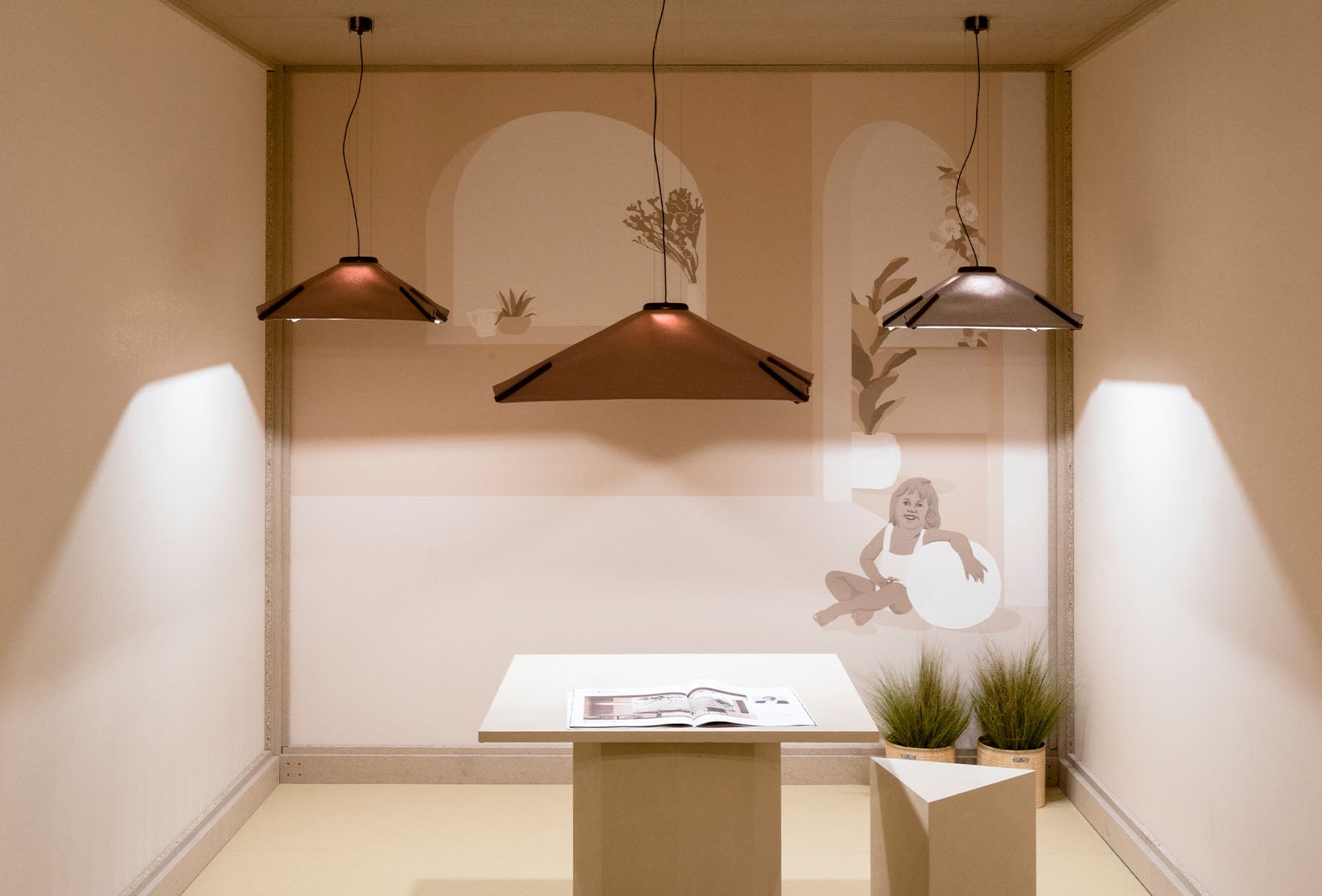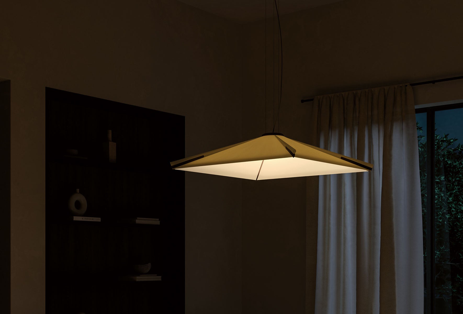 Salina is a lamp that flies: It is created from a square of fabric folded in the corners by 4 pinces which give it the concave shape. The fabric is one moment tense, one moment free in a balance of straight lines and curves that make it move, a play of shadows and light that paint it like a watercolour. The fabric is removable to allow washing of the fabric.