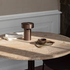 The Column Table Lamp by Audo is inspired by the bollards used to secure vessels to a jetty. It combines technology and mood-setting style in a striking mushroom shape with modern edge and a natural feel. The cylindrical anodised aluminium light is available with either a bronze finish or a brushed aluminum is fully portable thanks to its cordless design that charges via a USB socket.