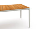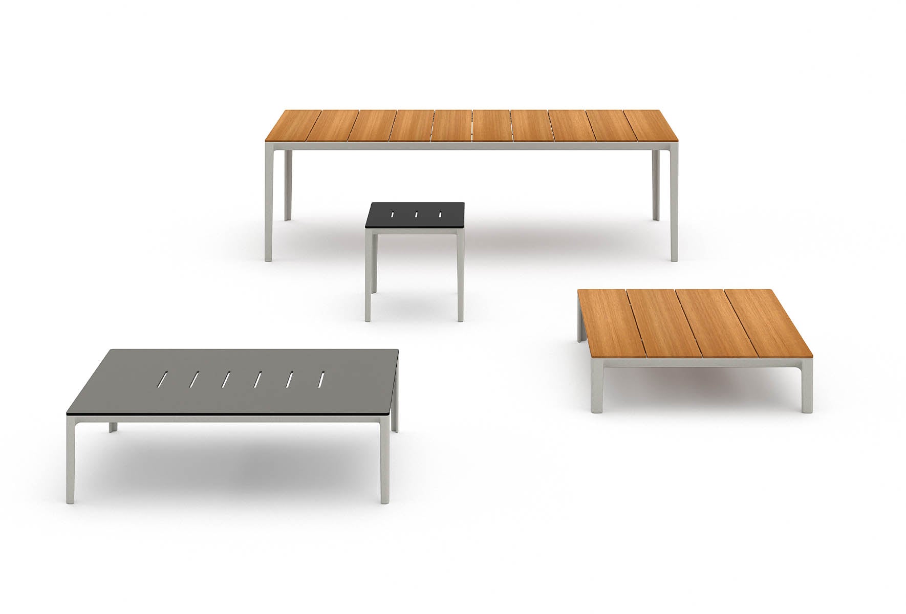 Configured as either a dining or coffee table, the arrangement of outdoor-grade solid Iroko wood slats creates small gaps for effective water drainage. This thoughtful design feature is mirrored in the occasional and low tables, where diminutive linear slits perforate the Polaris surface, enhancing both functionality and aesthetic appeal.
