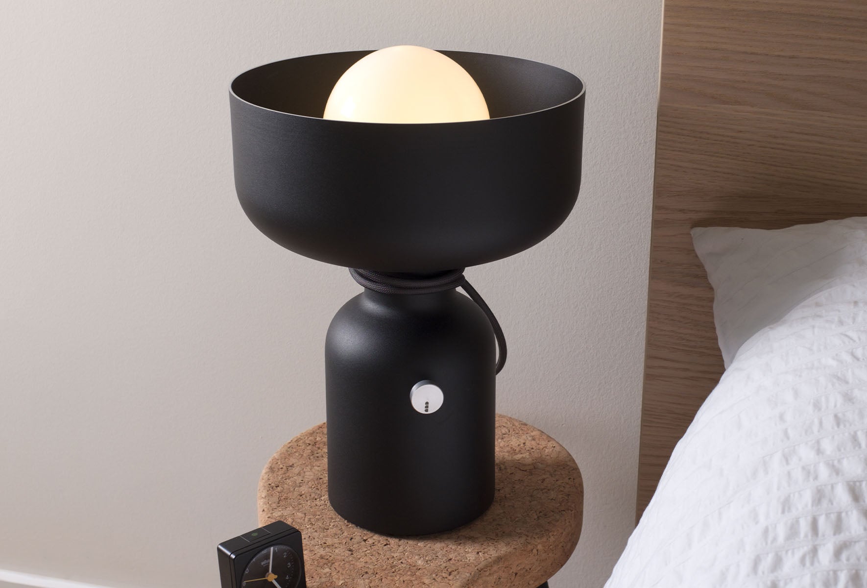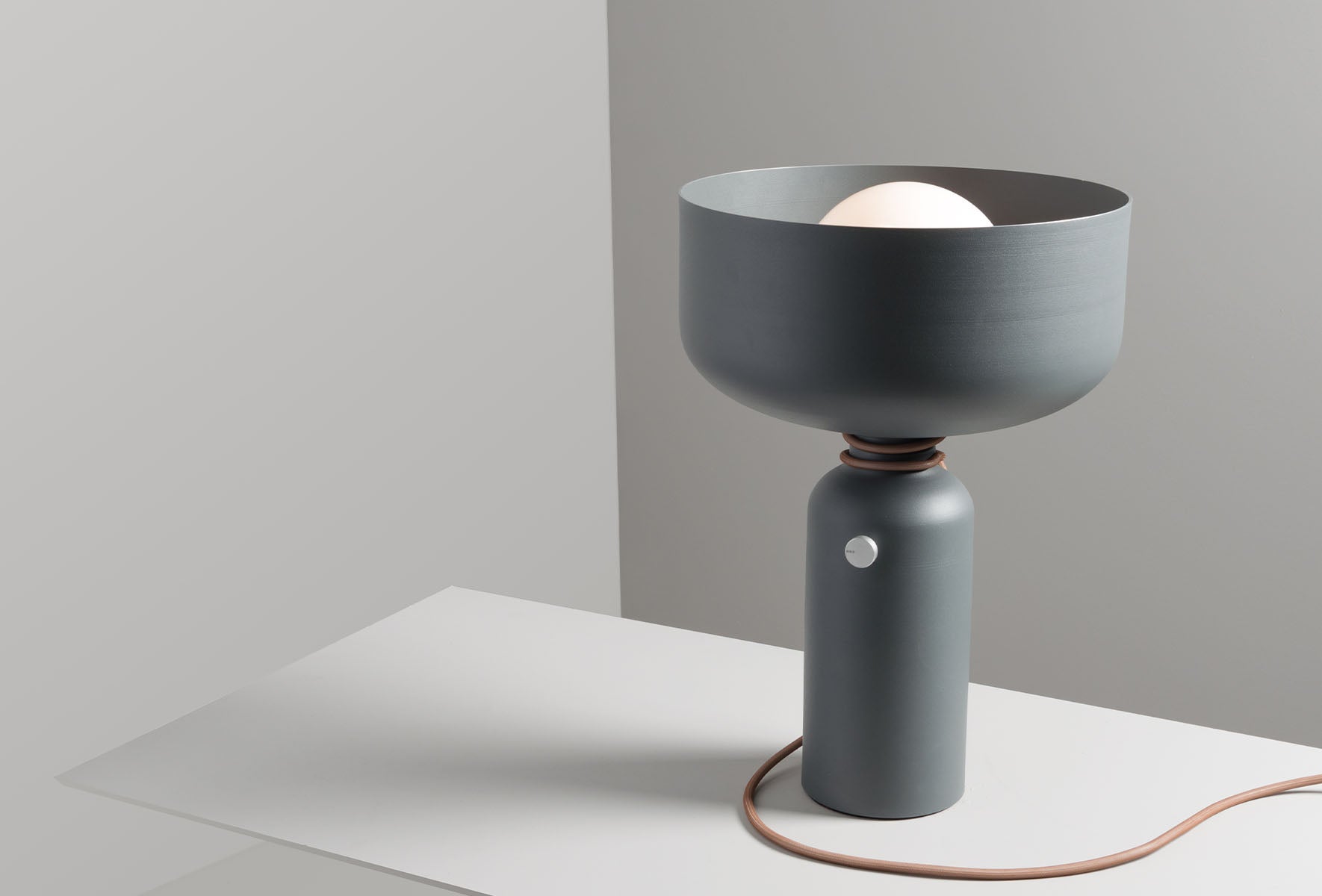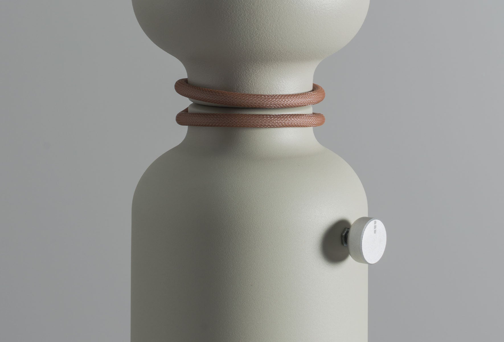 The electrical cord wraps and knots around the fixture’s midsection, to delineate the point of connection between the two joined halves. A weighted base is lined with felt for smooth contact with any surface.