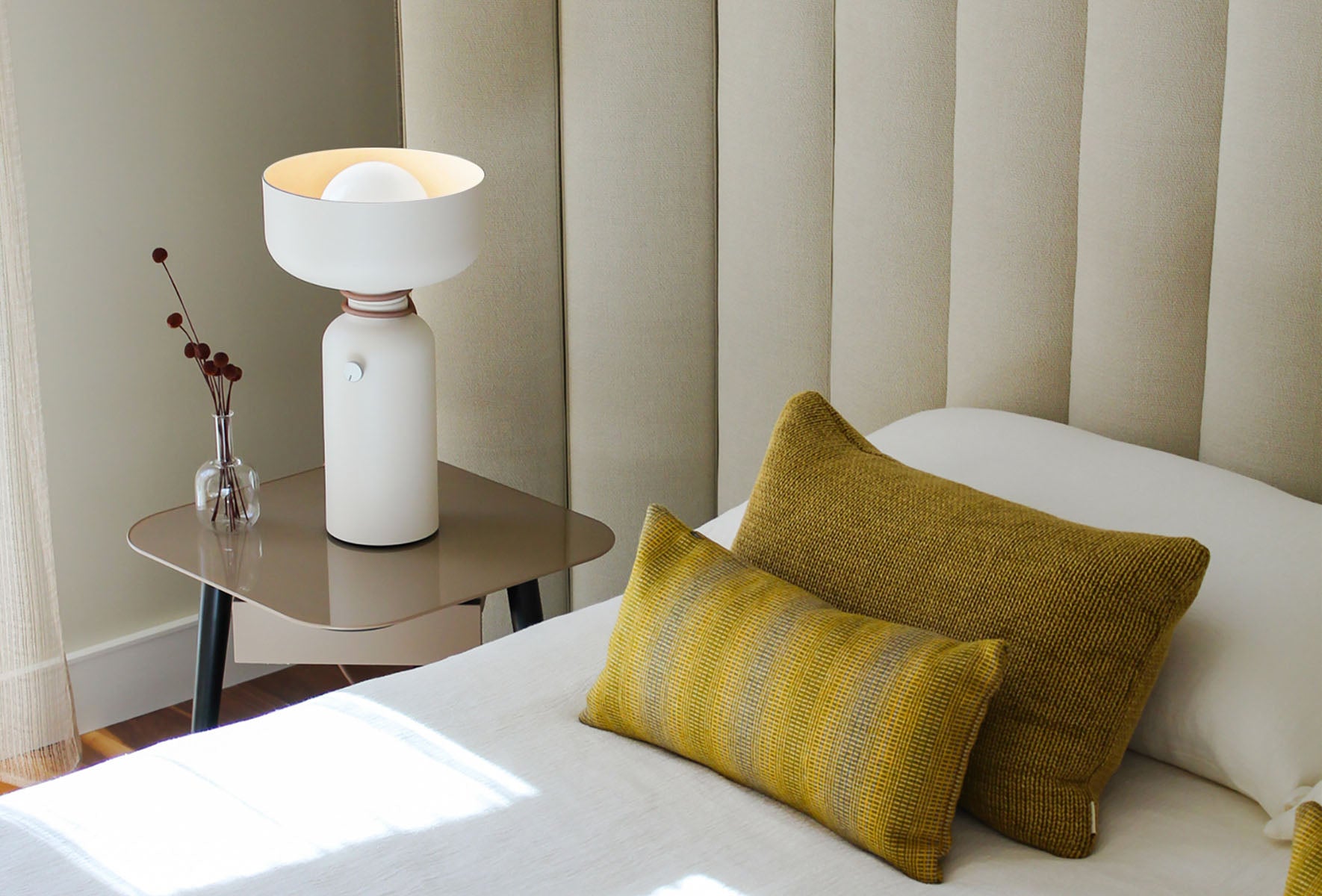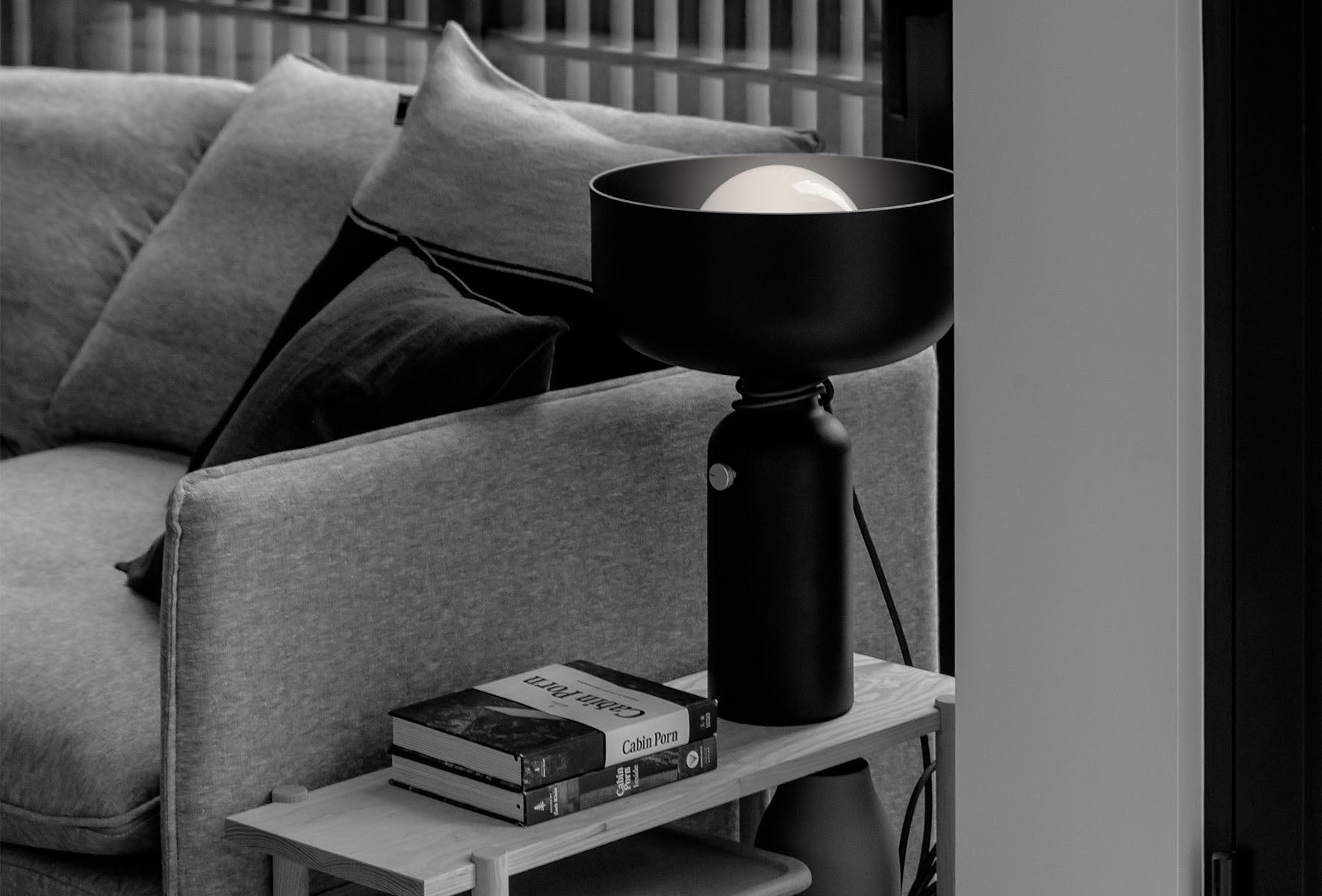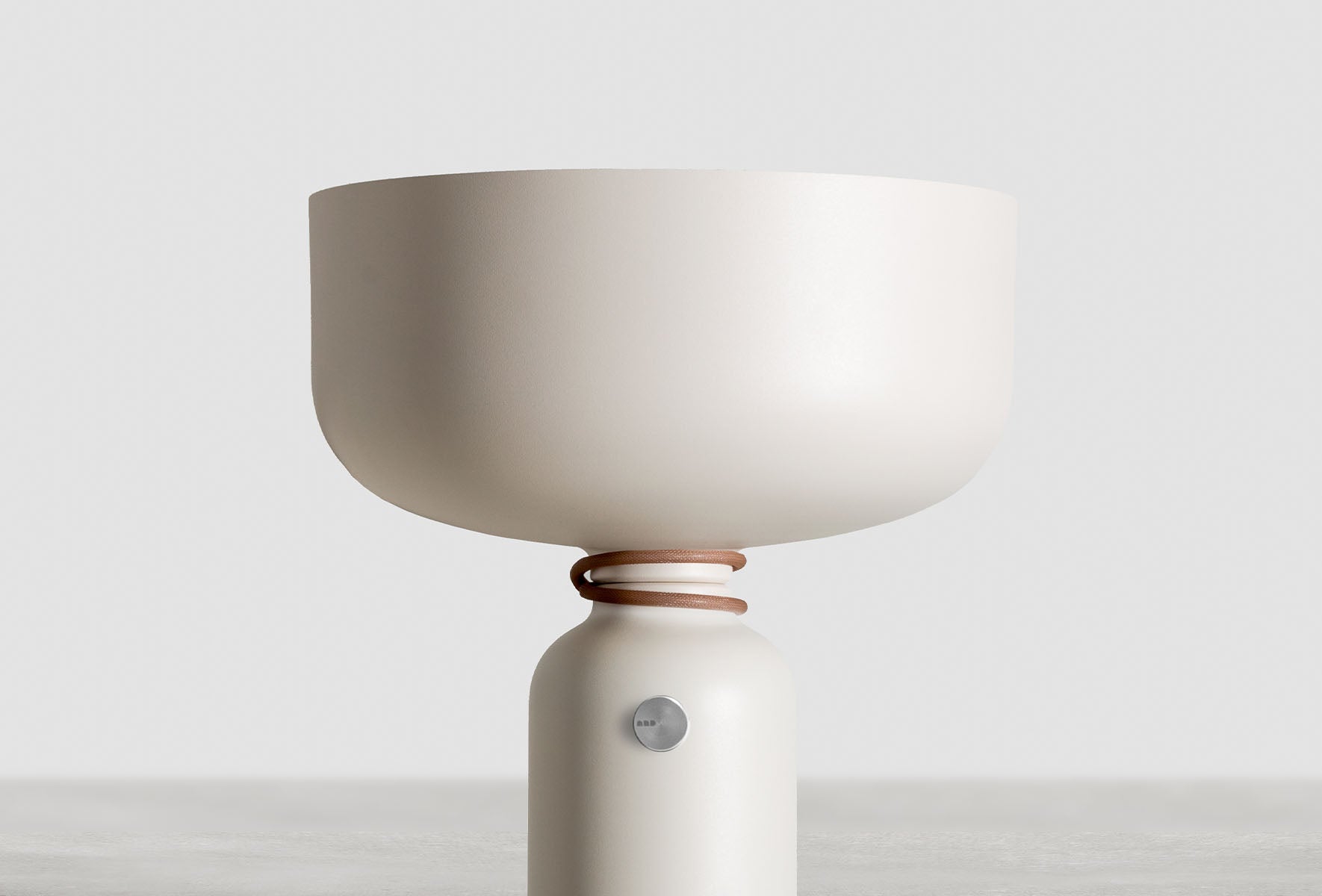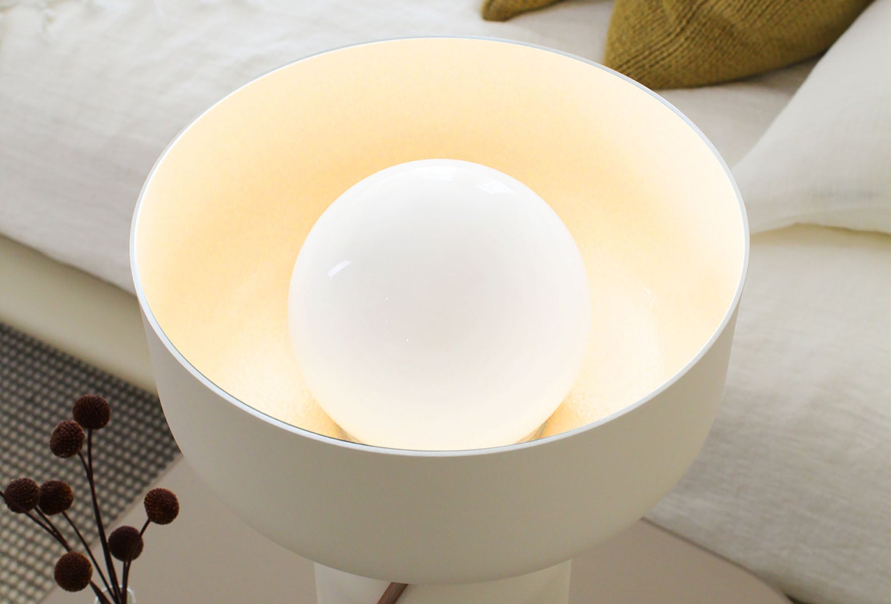 The electrical cord wraps and knots around the fixture’s midsection, to delineate the point of connection between the two joined halves. A weighted base is lined with felt for smooth contact with any surface.