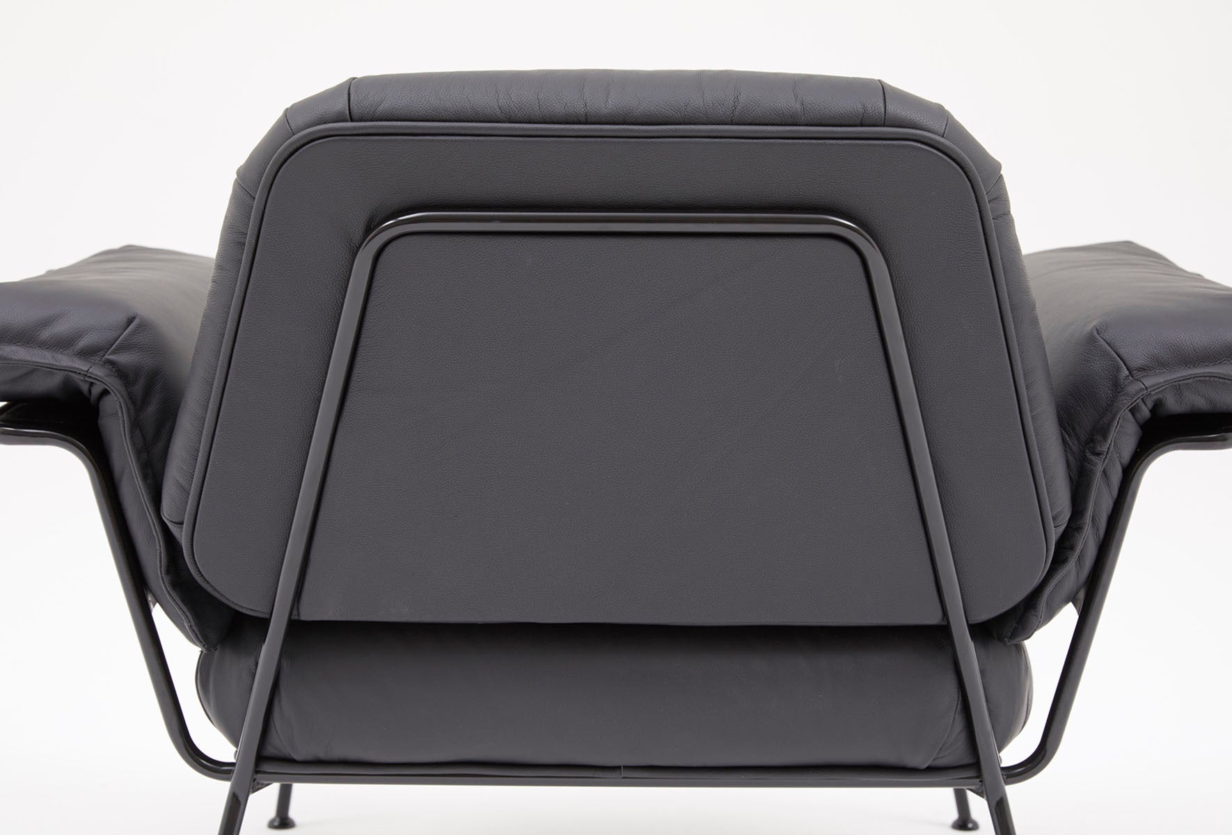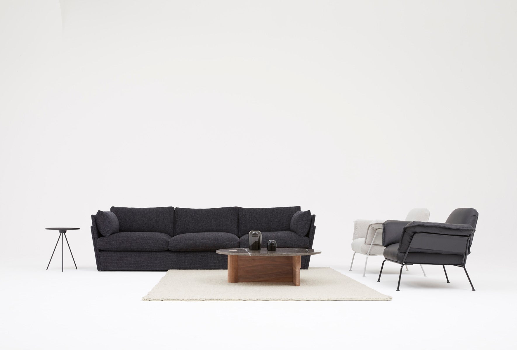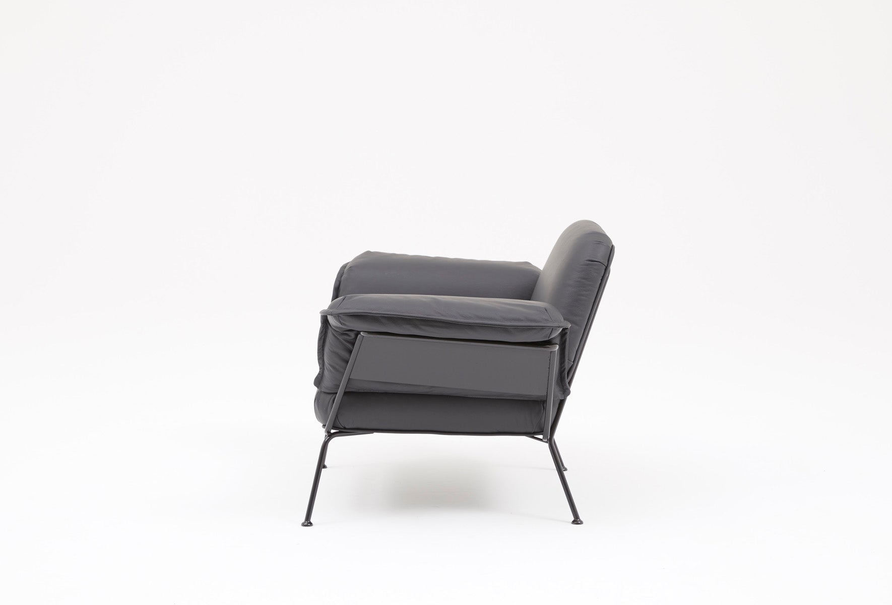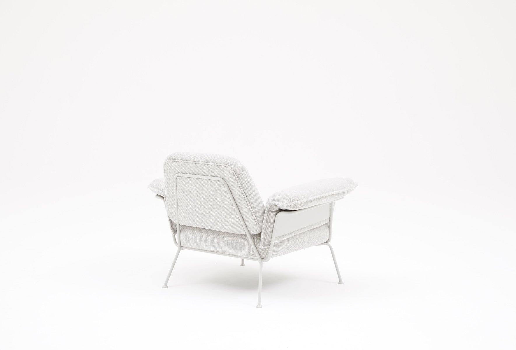 The Walker Chair contrasts the strength of its slim bent steel frame with the large pillowy comfort of the seat cushions and arm rests. An inviting place to sit, be it lounge or reception area, the Walker Chair offers customisable options for both frame and fabric.
