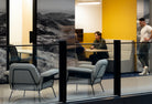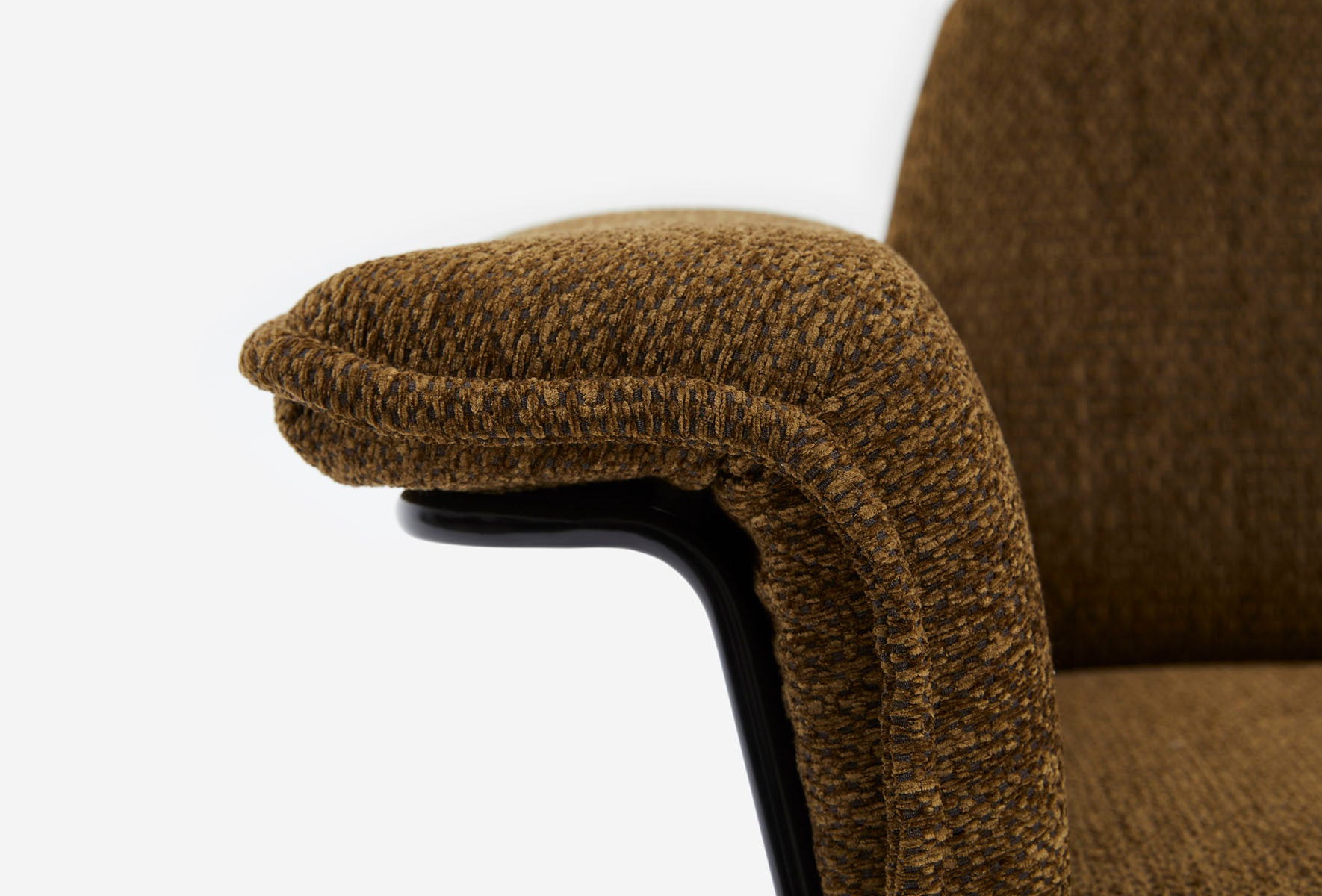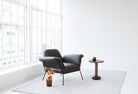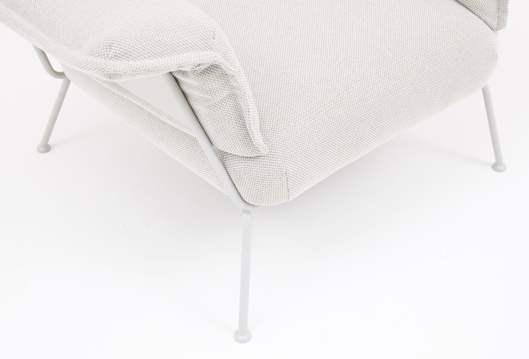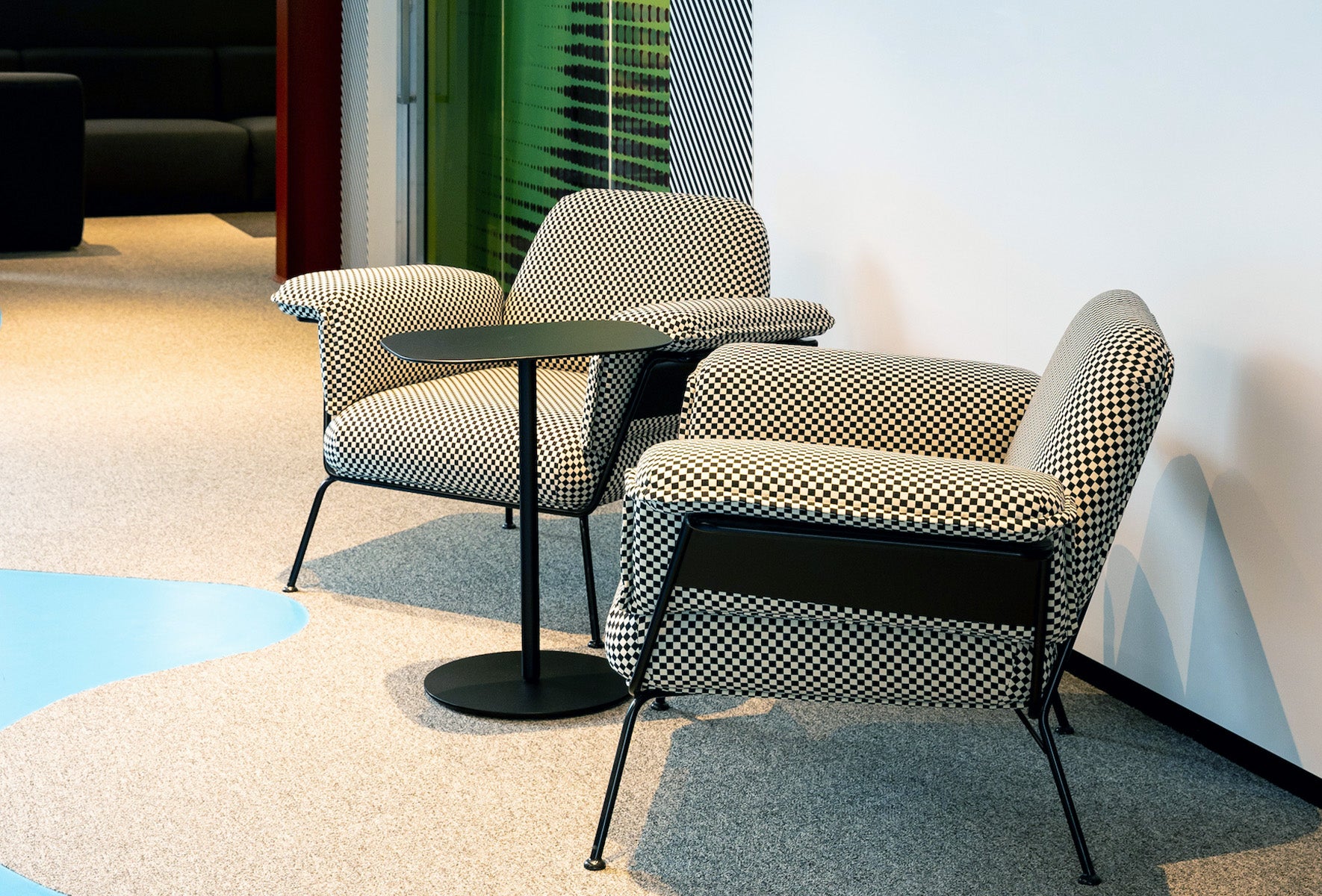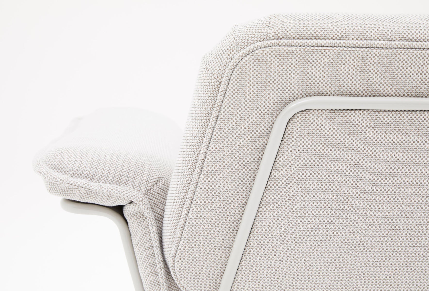 The Walker Chair contrasts the strength of its slim bent steel frame with the large pillowy comfort of the seat cushions and arm rests. An inviting place to sit, be it lounge or reception area, the Walker Chair offers customisable options for both frame and fabric.