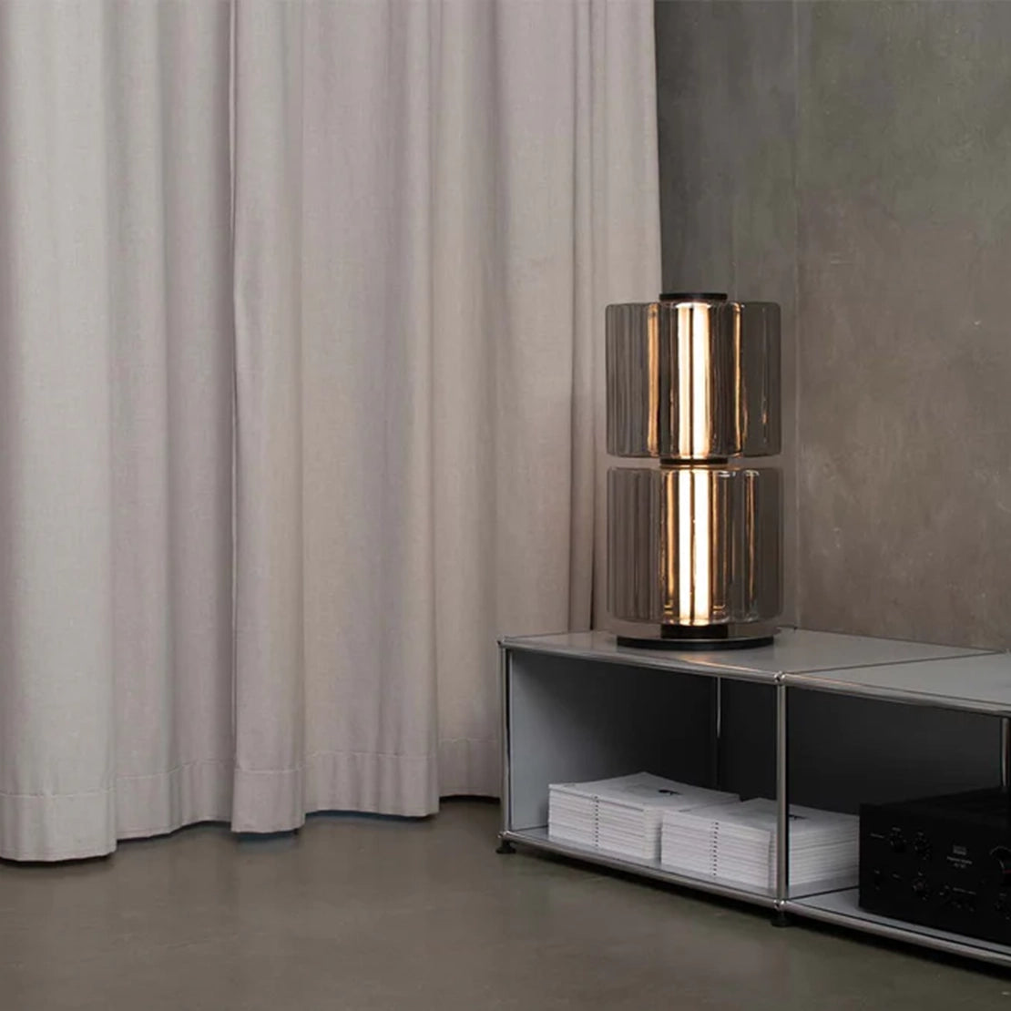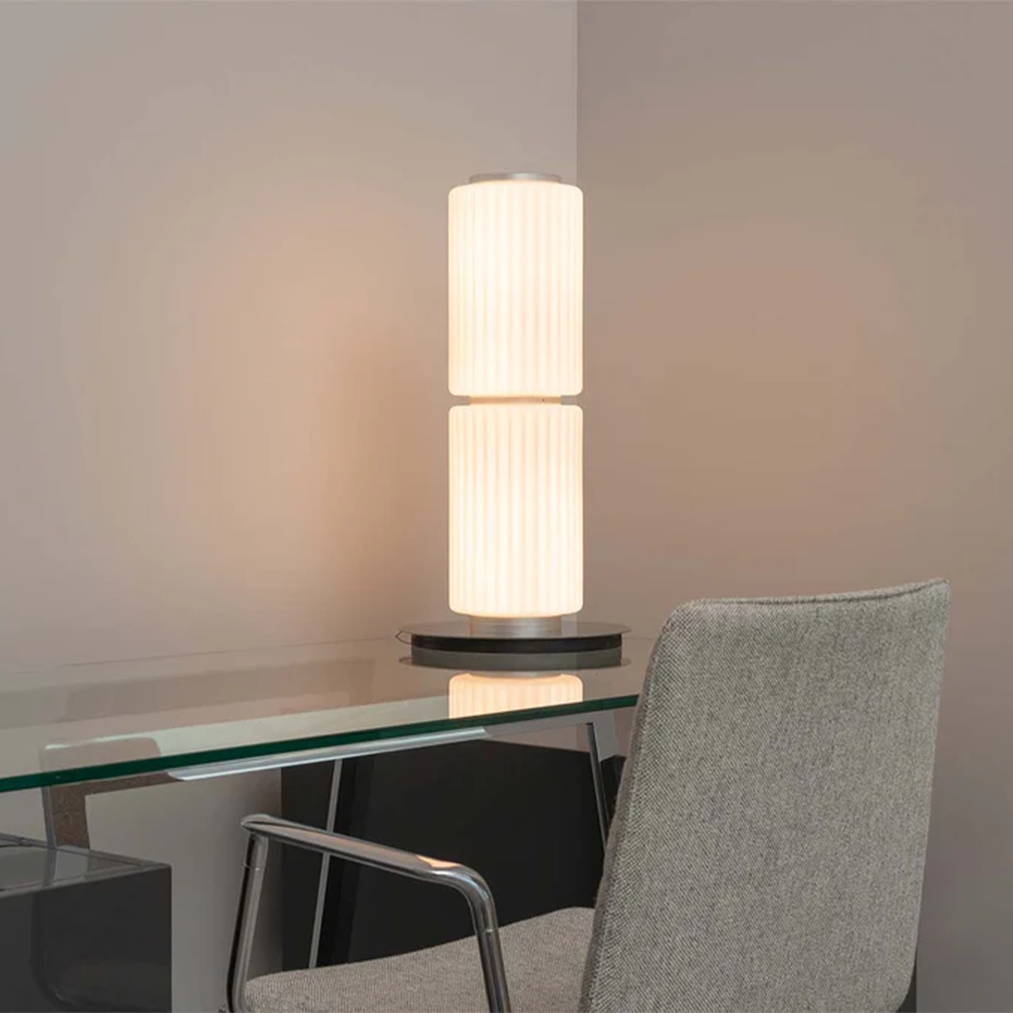 The Column Light by features multiple vertical glass cylinders, each with fluted surfaces that are available in two colour options: a smokey carbon, or frosted ivory.