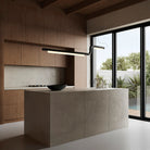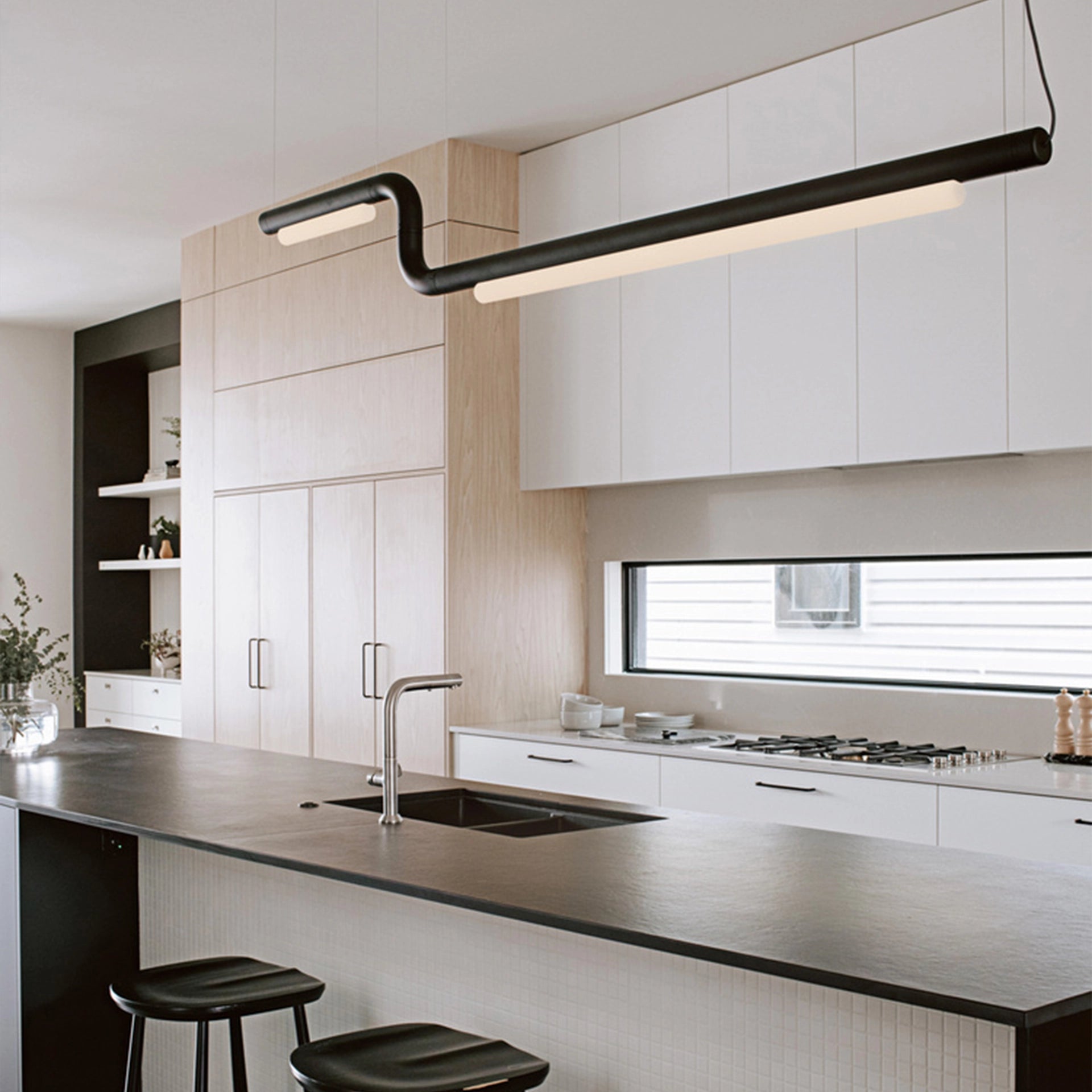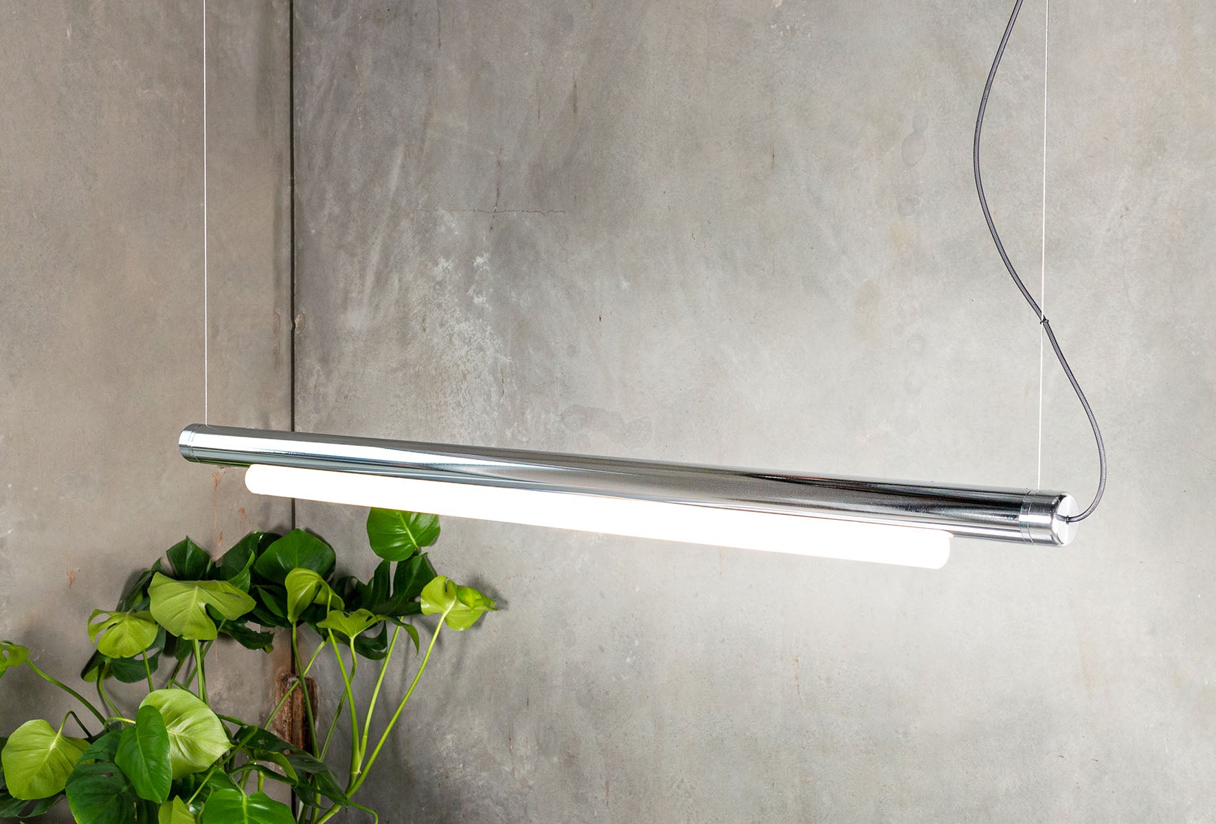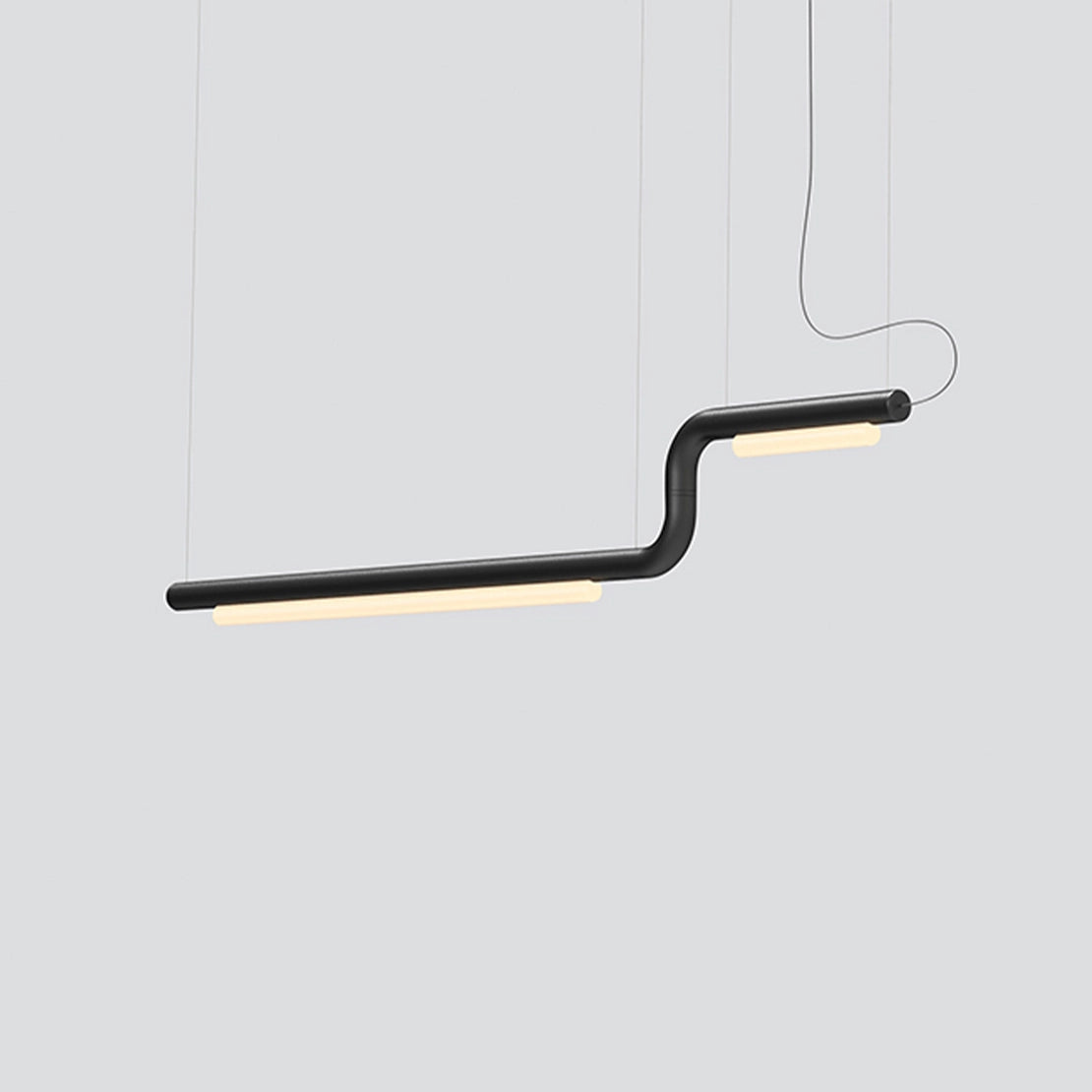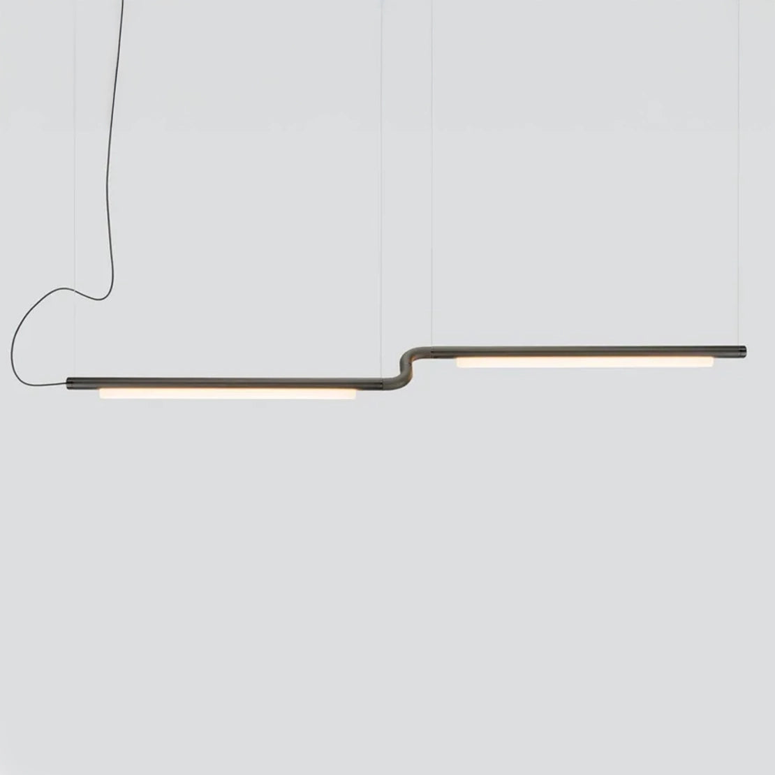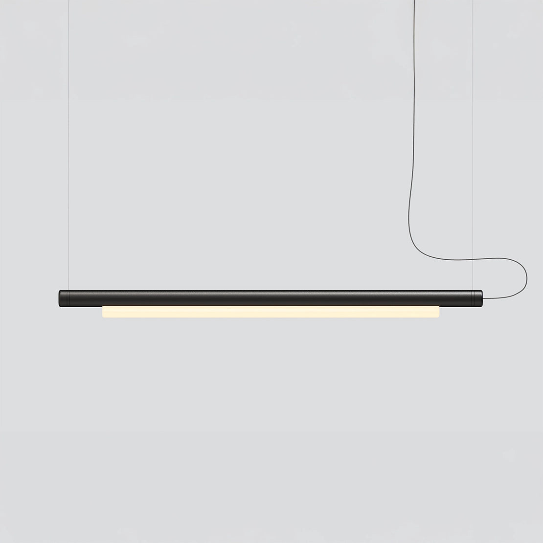 Stark, elegant, and resolute, The Pipeline 40 pendant lamp suspends horizontally from 1mm thin aircraft cables, creating the illusion of floating in air. A wide horizontal beam of light is emitted through a diffuser designed to soften the LED light while maximising output. The Pipeline pendant may suspend horizontally level or at an angle, individually or plurally and within the space it inhabits.
