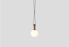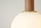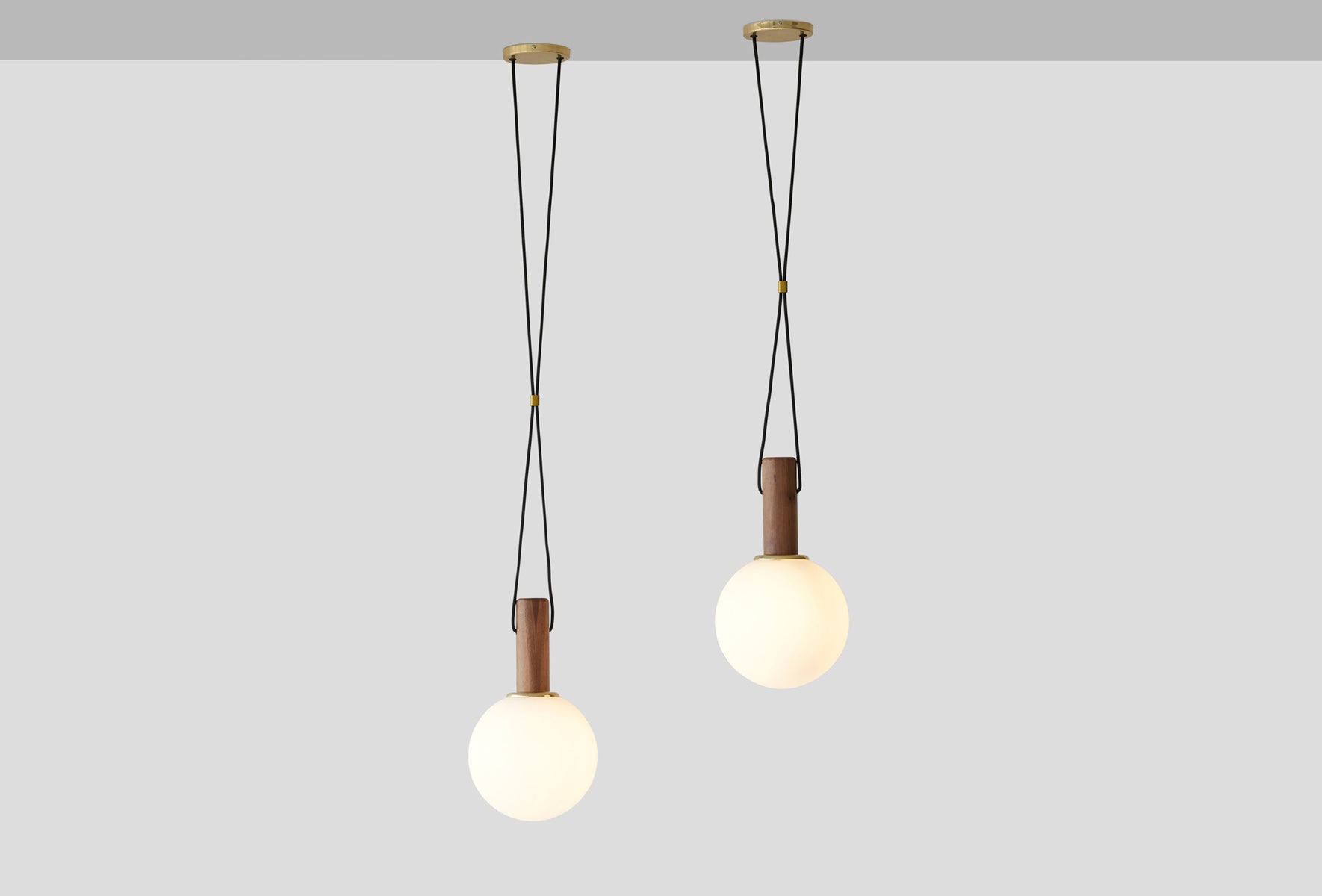 Walnut dowel; Brass; Glass 200mm diameter; Fabric flex cable; Ceiling rose & cable grip - The blown glass globe is produced locally in New Zealand. Due to the handmade nature of the glass blowing process the globes may vary very slightly from pendant to pendant.