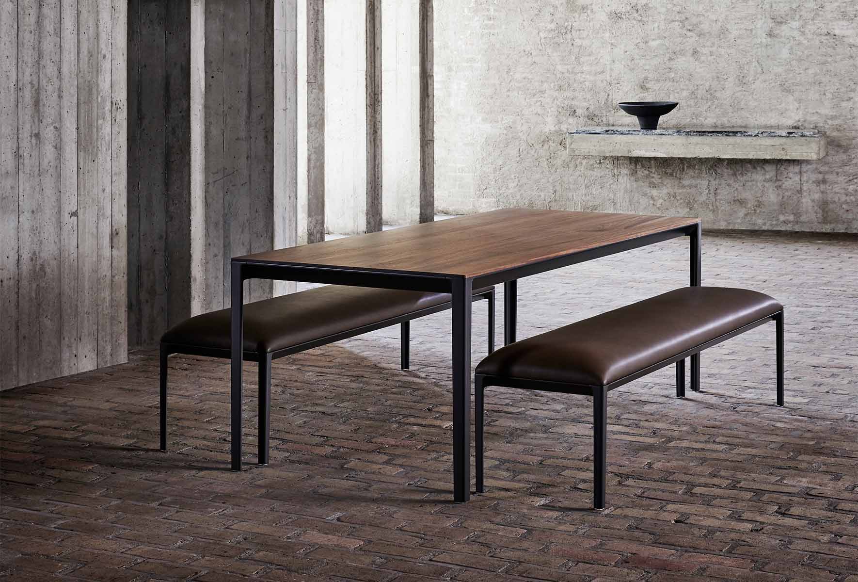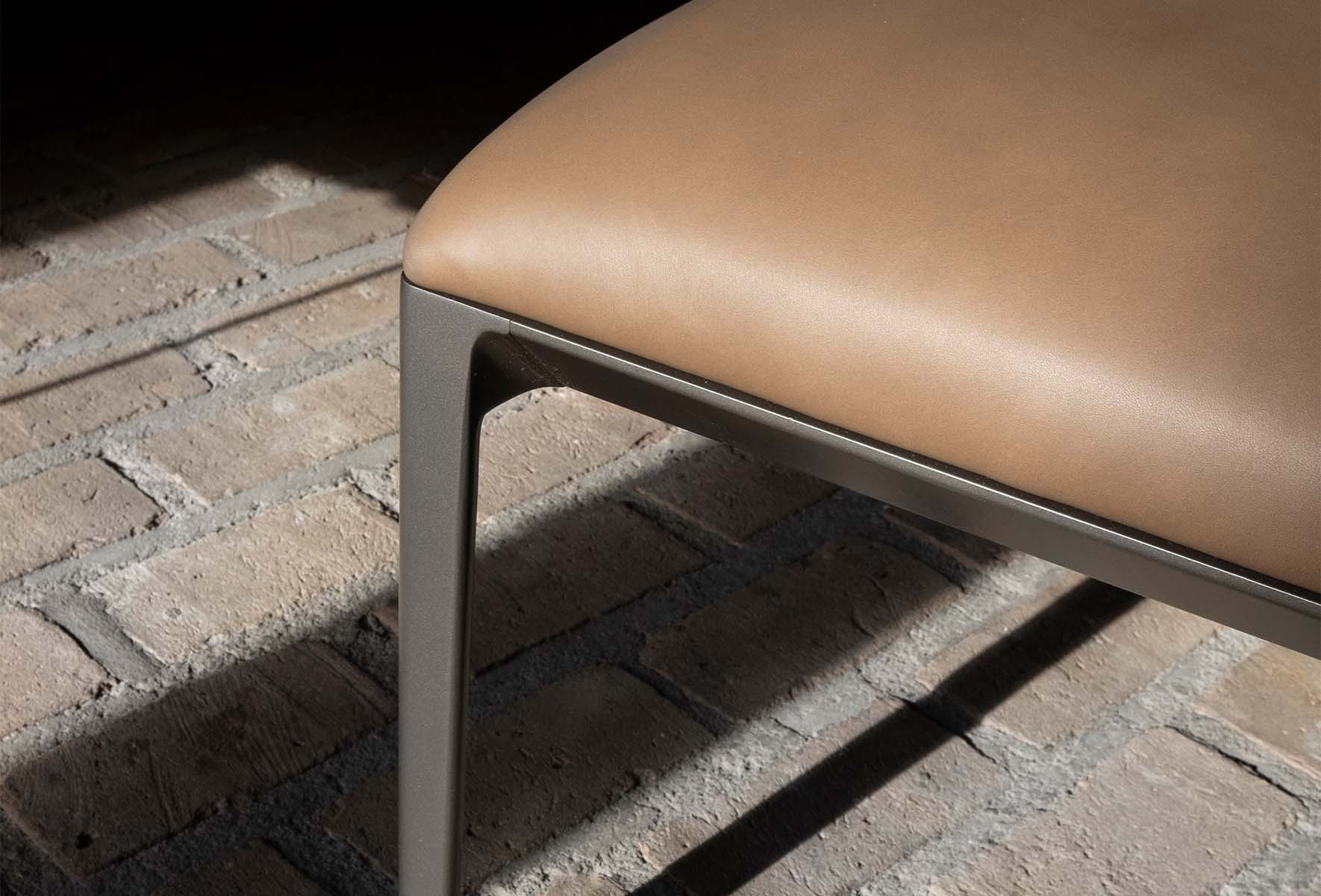 A versatile bench that can be used alone or in conjunction with one of the Able tables, the Able bench is constructed using cast aluminium legs and aluminium rails that support its upholstered bench. The bench is available in four different length options with fabric or leather upholstery and is extremely lightweight.