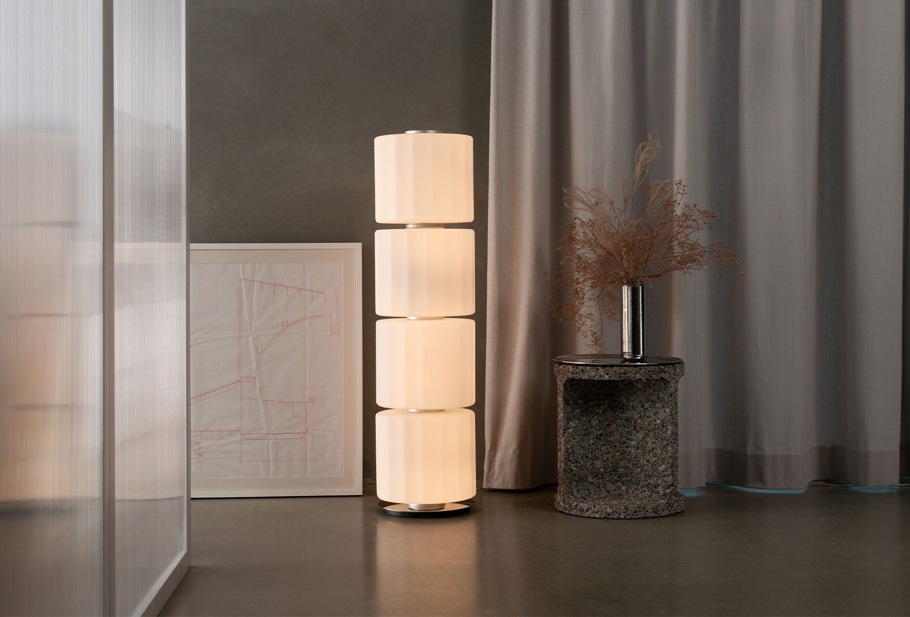 The faceted surface of the Column mimics the fluting used on buildings and temples to create a sense of rhythm, which softly diffuses the light as it radiates into the space.