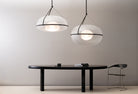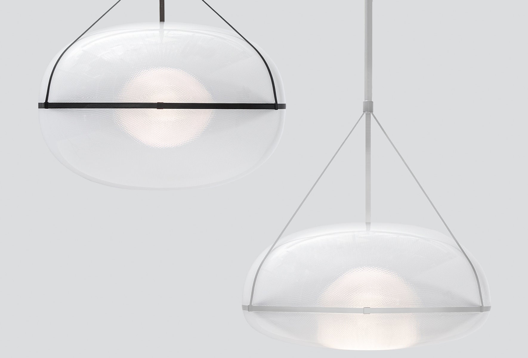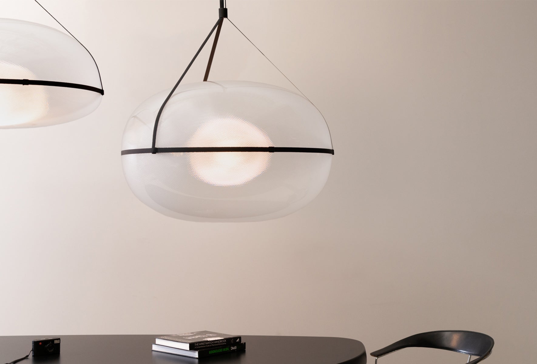 A kaleidoscopic light extends from the orb-like source of the Iris, travelling beyond its crystalline surface. Encased in an elliptical shell, the Iris performs with a weightlessness that lends it an aerial quality. Voluminous and vast, it enters a room with salient scale.