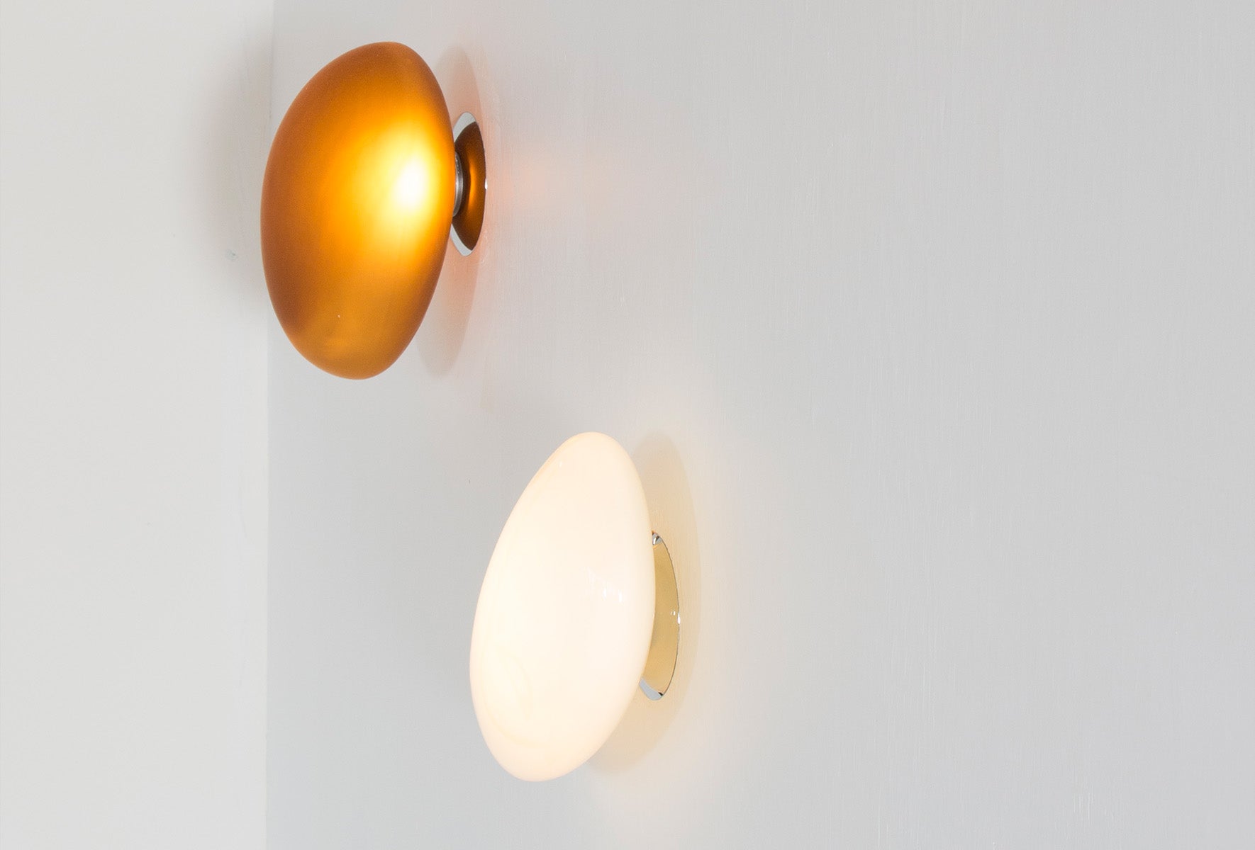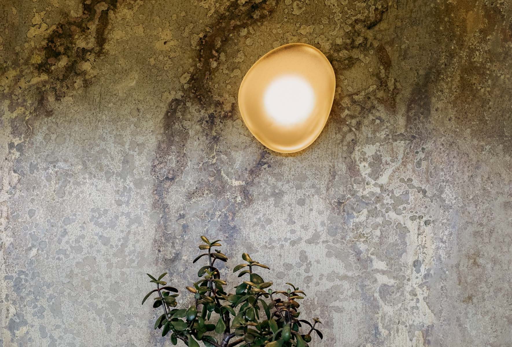 The Pebble series celebrates the primordial beauty of stones. Enhancing their simple yet sculptural form through translucency, the duo of glass-blown shapes enter into dialogue. Two resting river rocks are balanced upon one another— a smooth rounded organic glass form illuminates atop a cast concrete base.