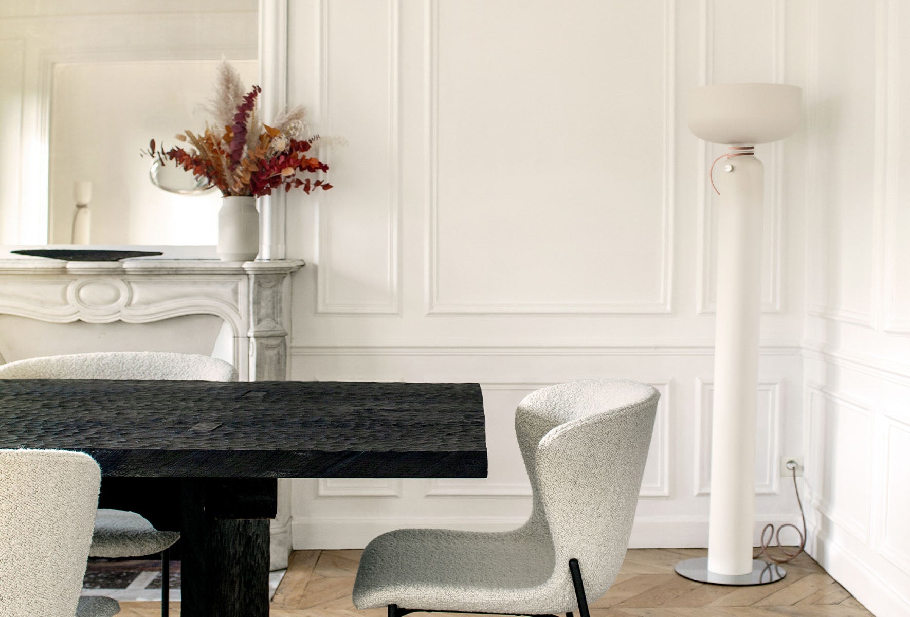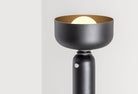 The electrical cord wraps and knots around the fixture under the top shade, to delineate the point of connection between the two elements. A weighted base is lined with felt for smooth contact with any surface.