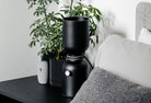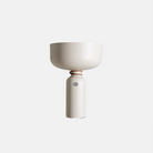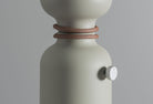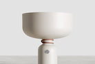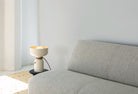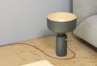The electrical cord wraps and knots around the fixture’s midsection, to delineate the point of connection between the two joined halves. A weighted base is lined with felt for smooth contact with any surface.