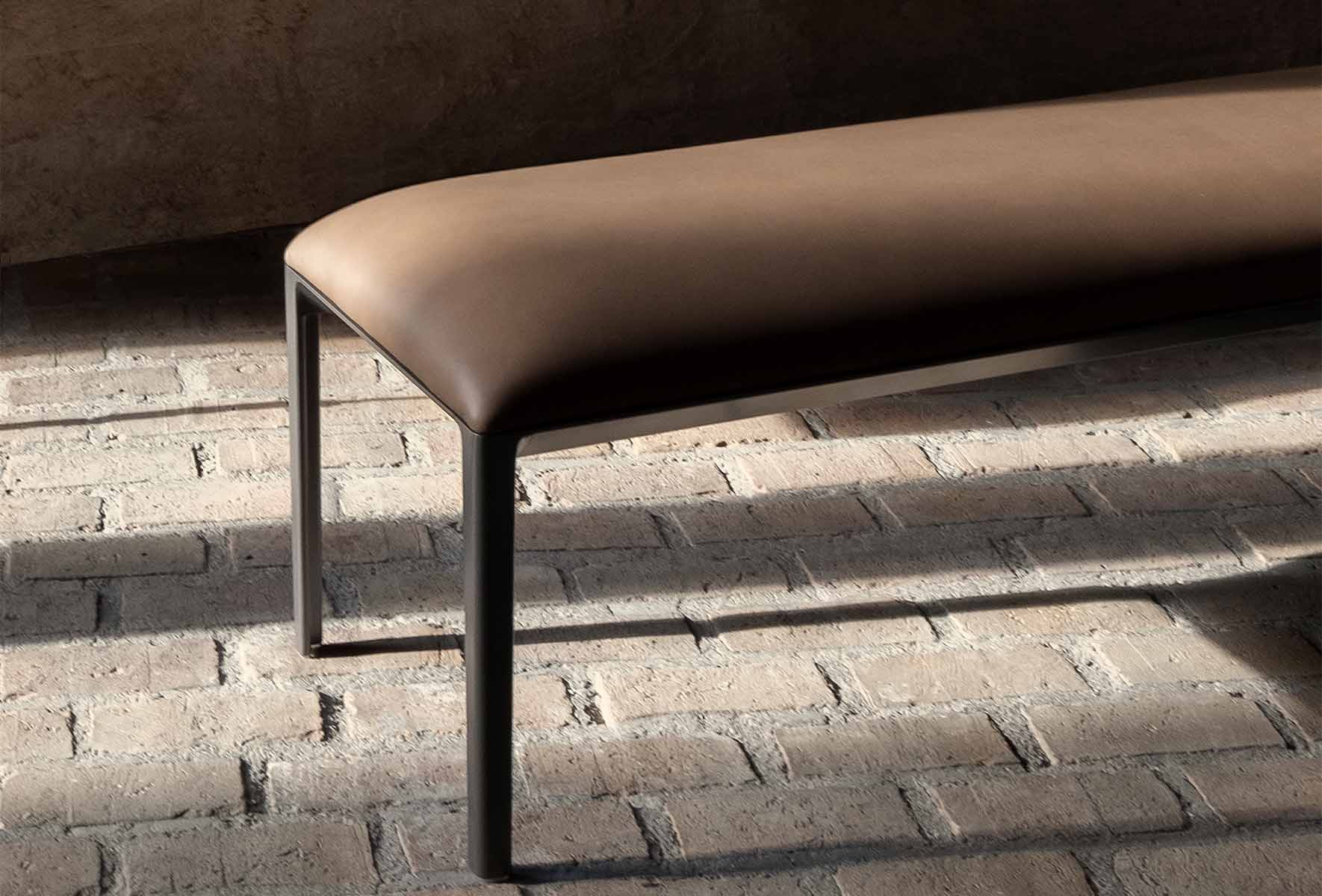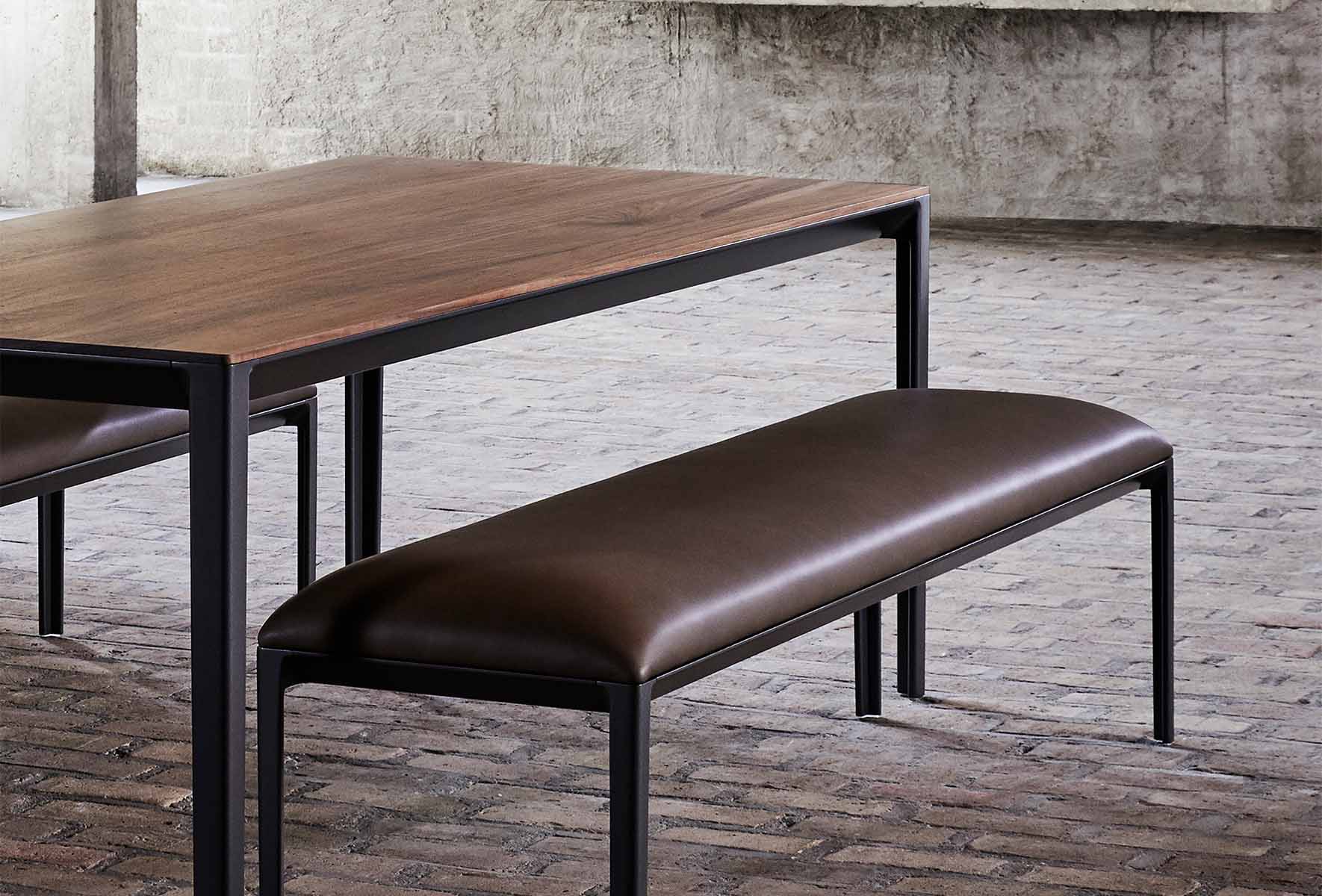 A versatile bench that can be used alone or in conjunction with one of the Able tables, the Able bench is constructed using cast aluminium legs and aluminium rails that support its upholstered bench. The bench is available in four different length options with fabric or leather upholstery and is extremely lightweight.