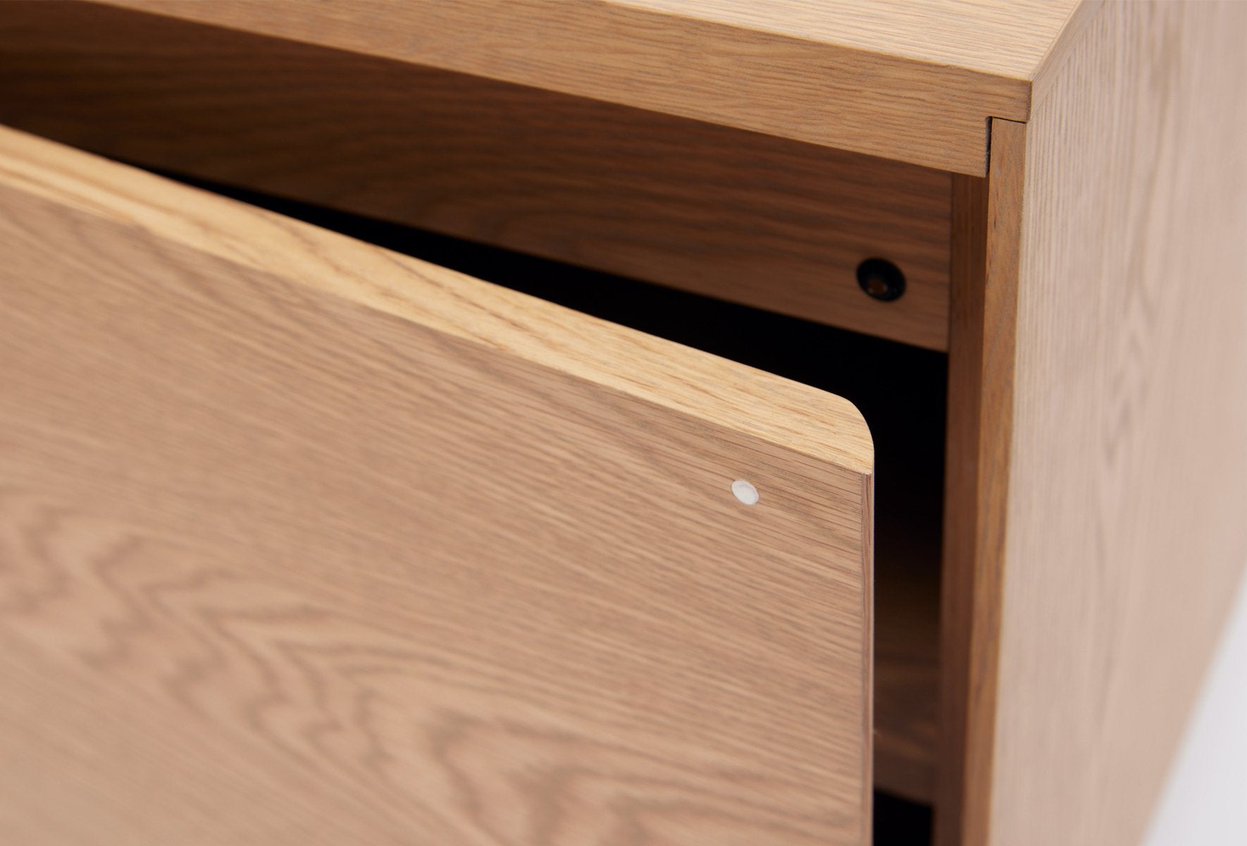 Designed with a thick timber top that nest into a slim side panel, forming varied proportions that creates a solid presence, yet light aesthetic.