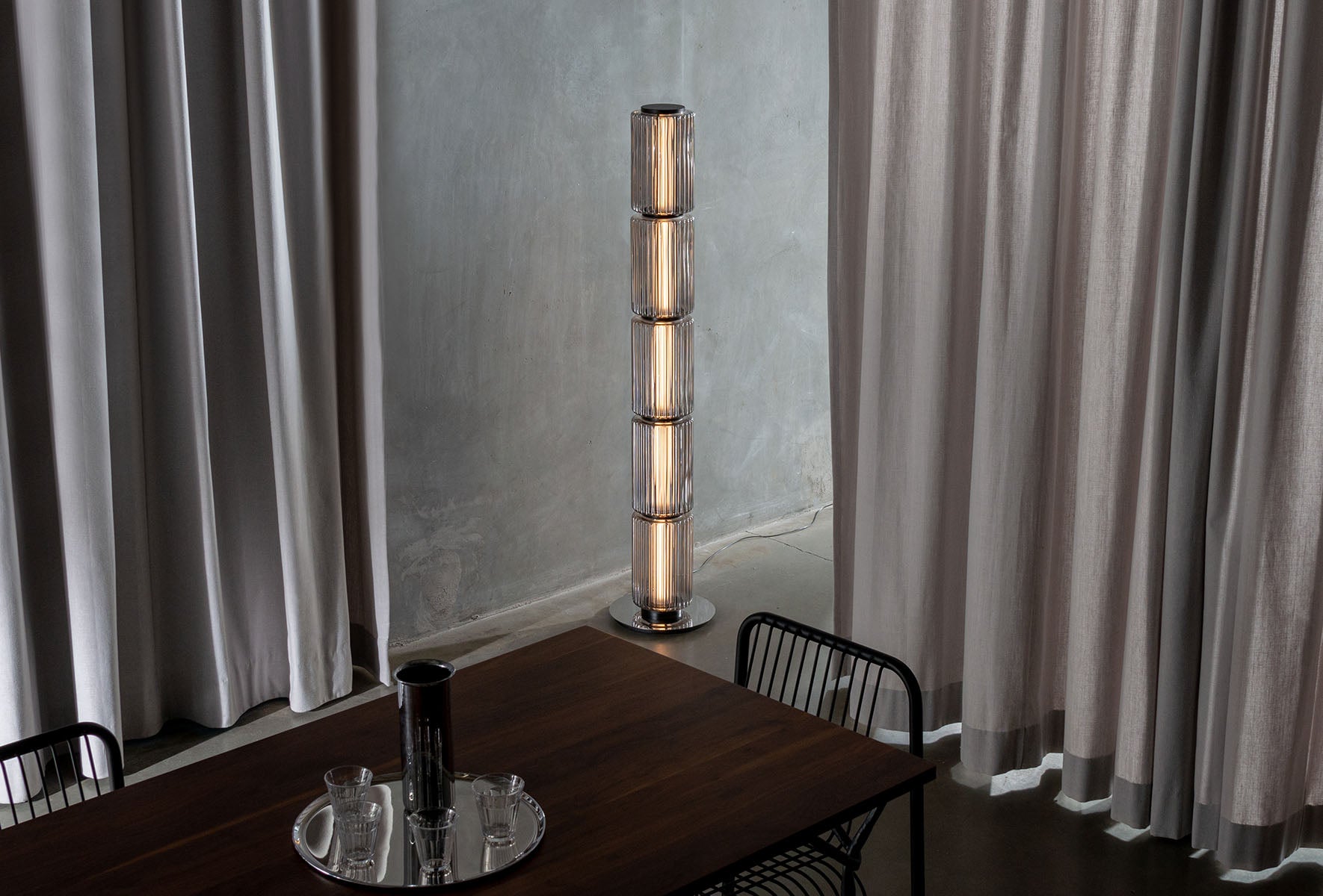 As the Column can be arranged in segments of machine mould-blown glass cylinders, it can lengthen a space. A unit human in scale, the Column was used as a module in the building of ancient temples as it expresses proportion, strength and beauty.