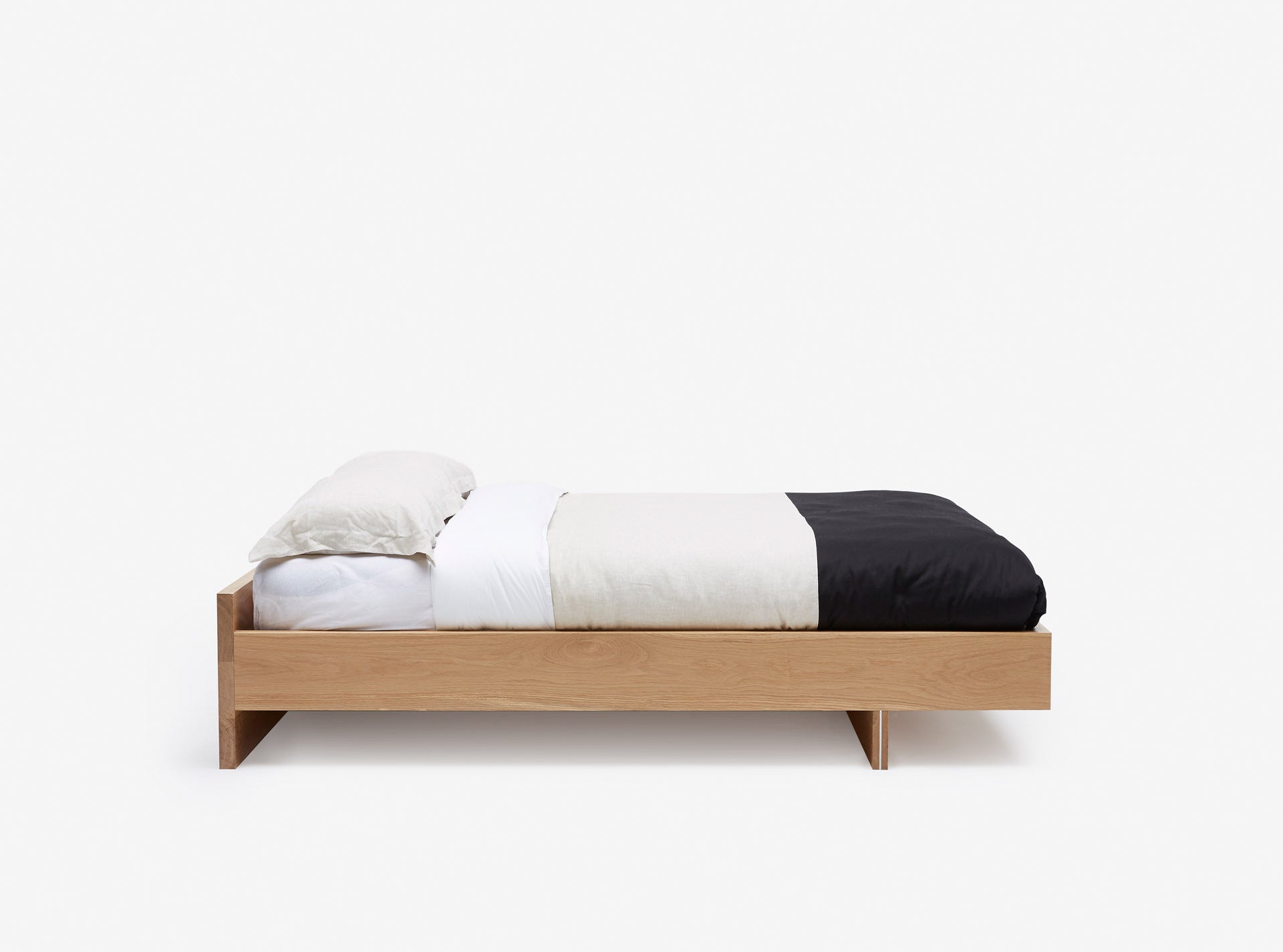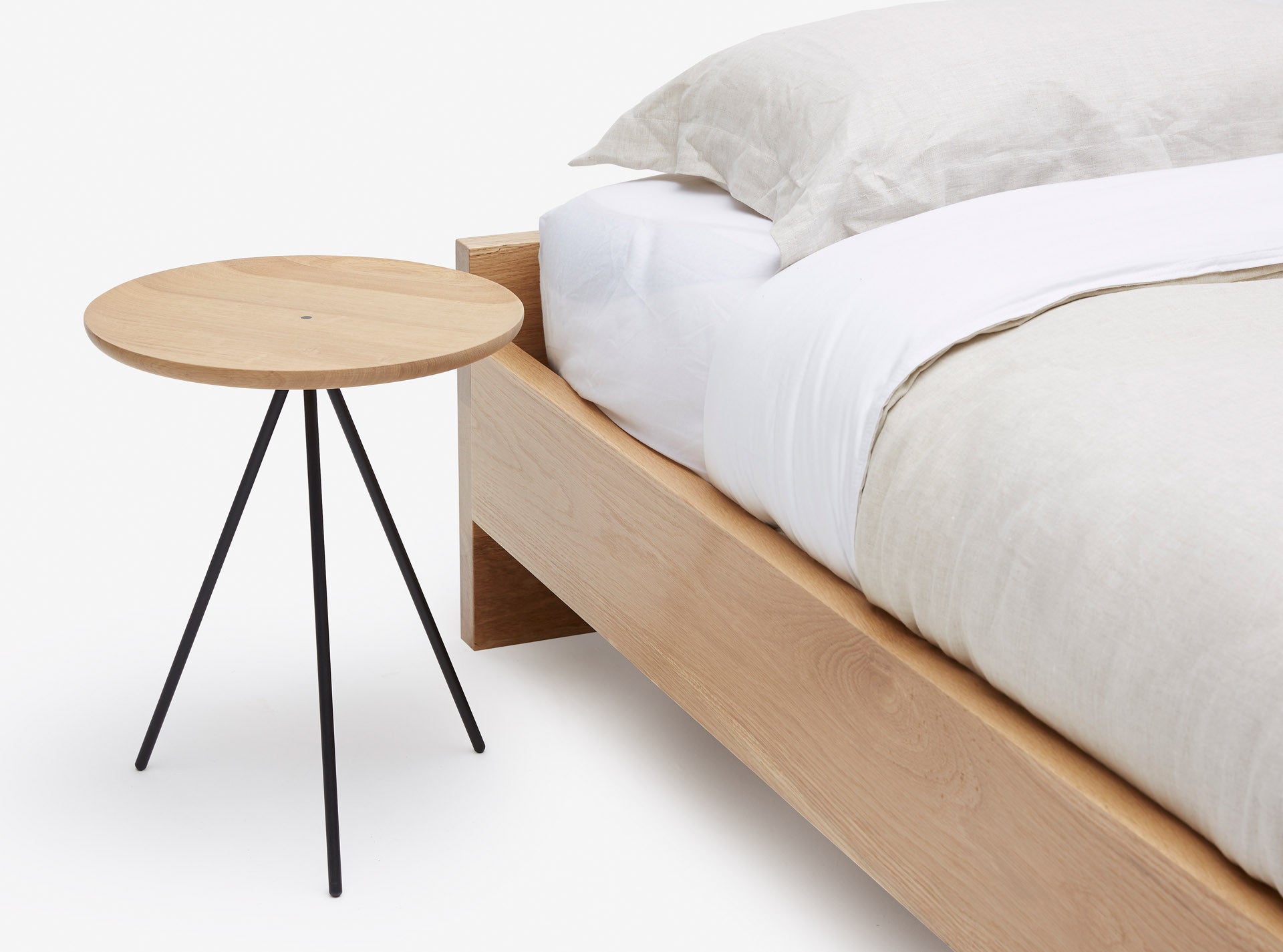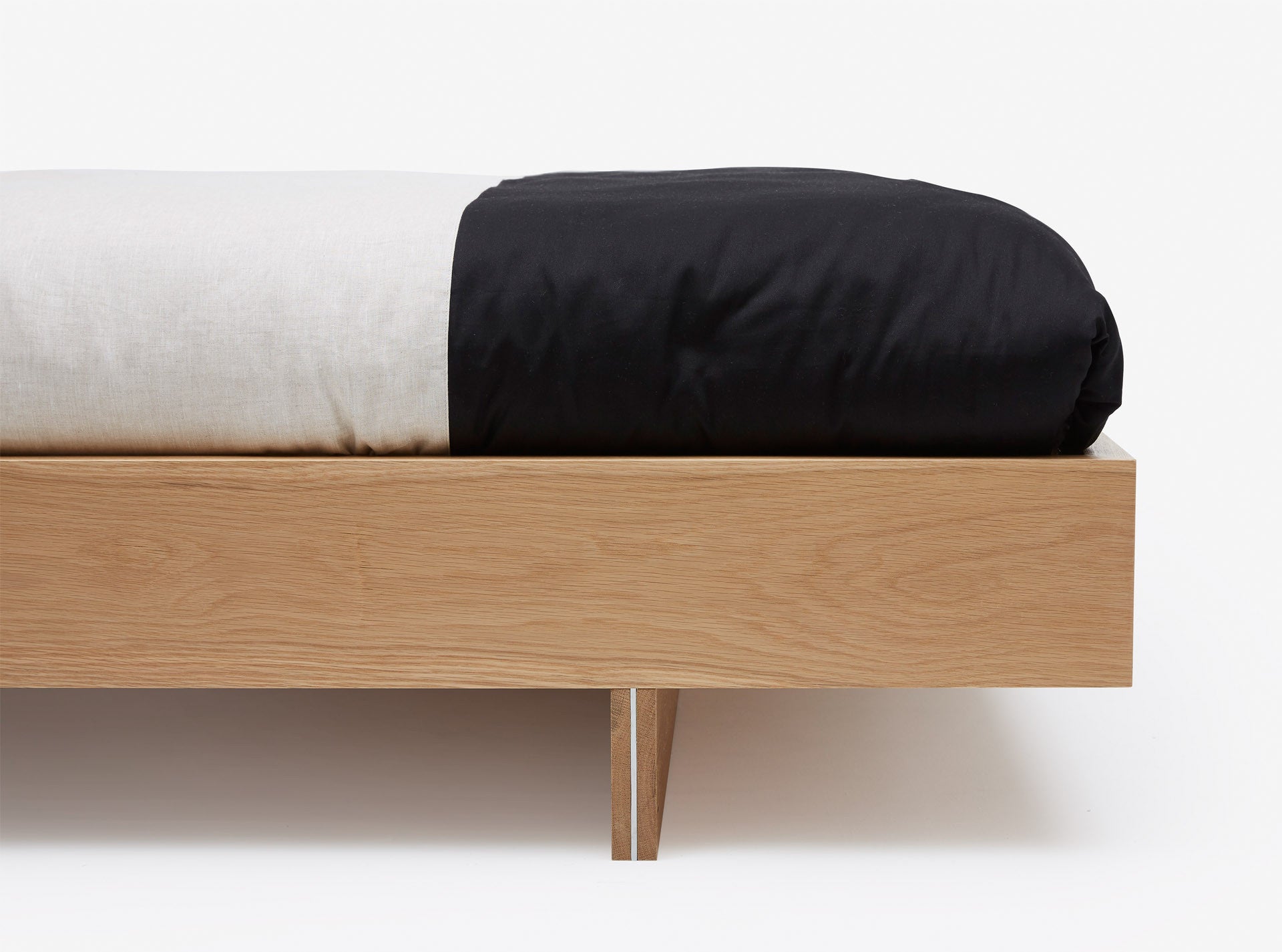 Design details and construction of the Fenton Bed have been carefully considered to create the bed with a miter join at the front corners, rather than the traditional butt join. Powder coated steel inlayed strips at the side of the legs and the end of the bed provide a distinct detail to contrast with the solid timber or HPL laminate.