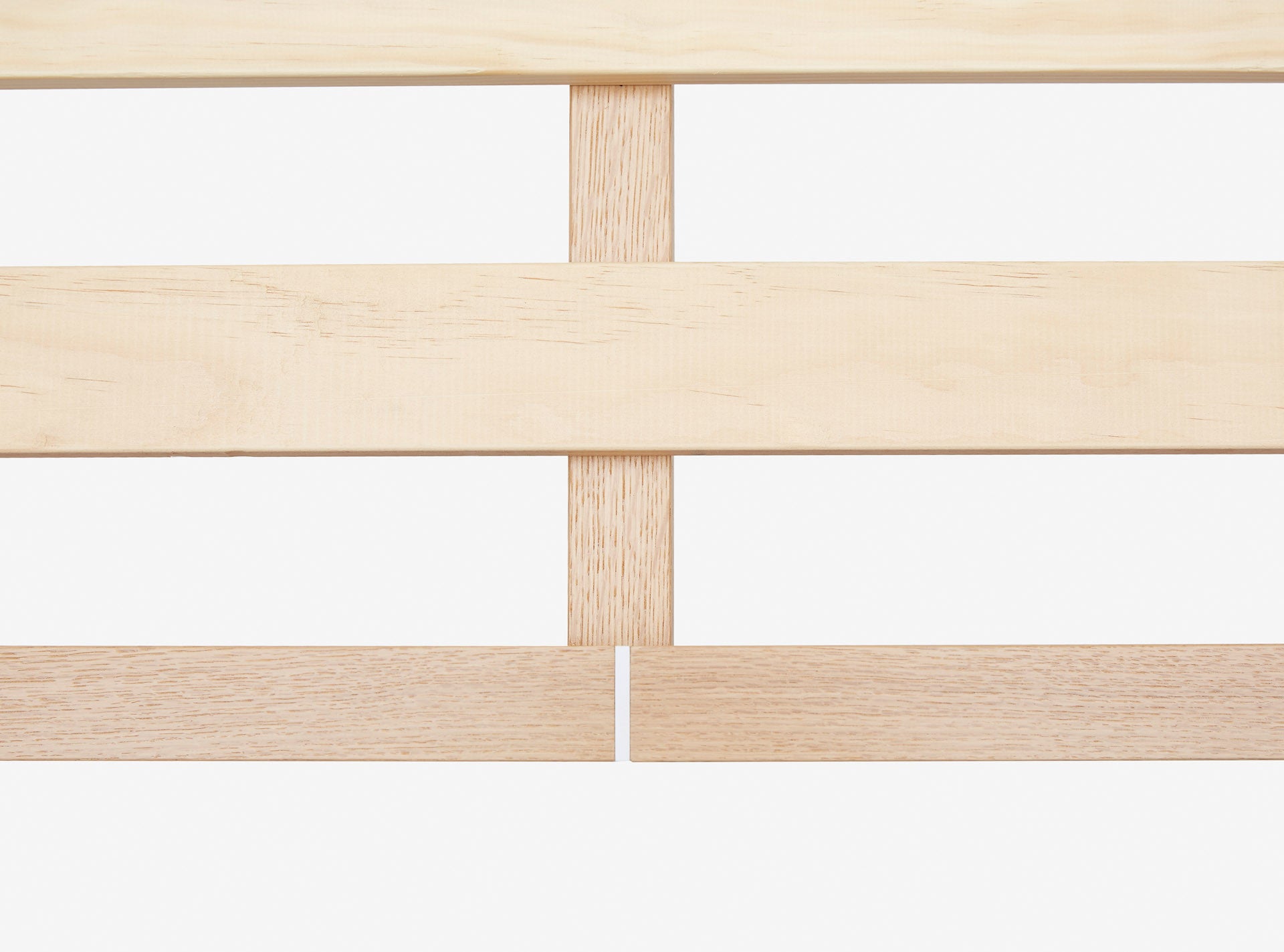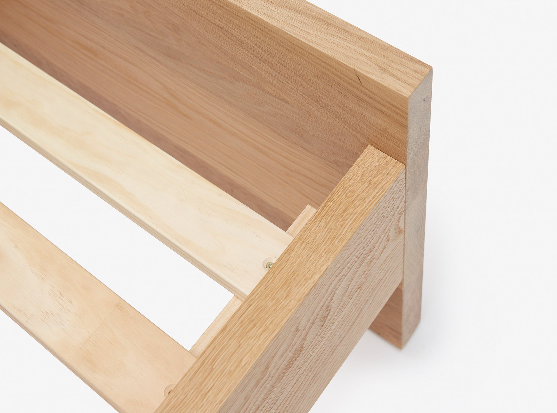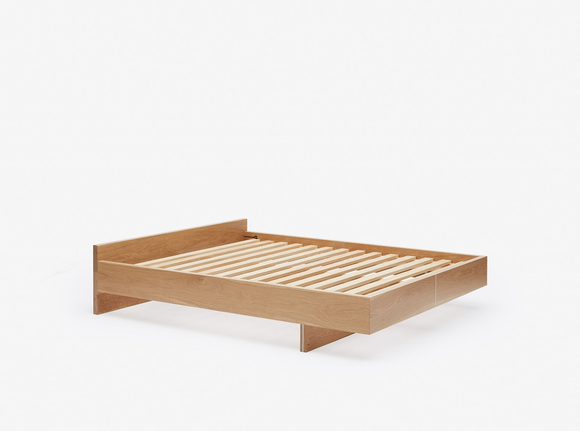 Design details and construction of the Fenton Bed have been carefully considered to create the bed with a miter join at the front corners, rather than the traditional butt join. Powder coated steel inlayed strips at the side of the legs and the end of the bed provide a distinct detail to contrast with the solid timber or HPL laminate.