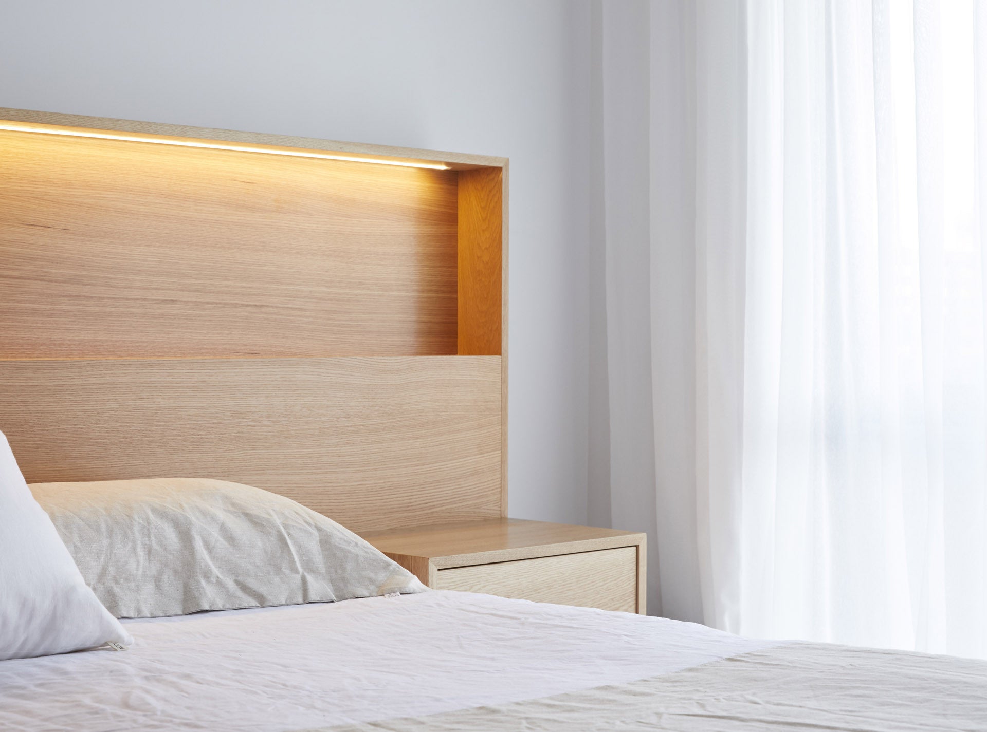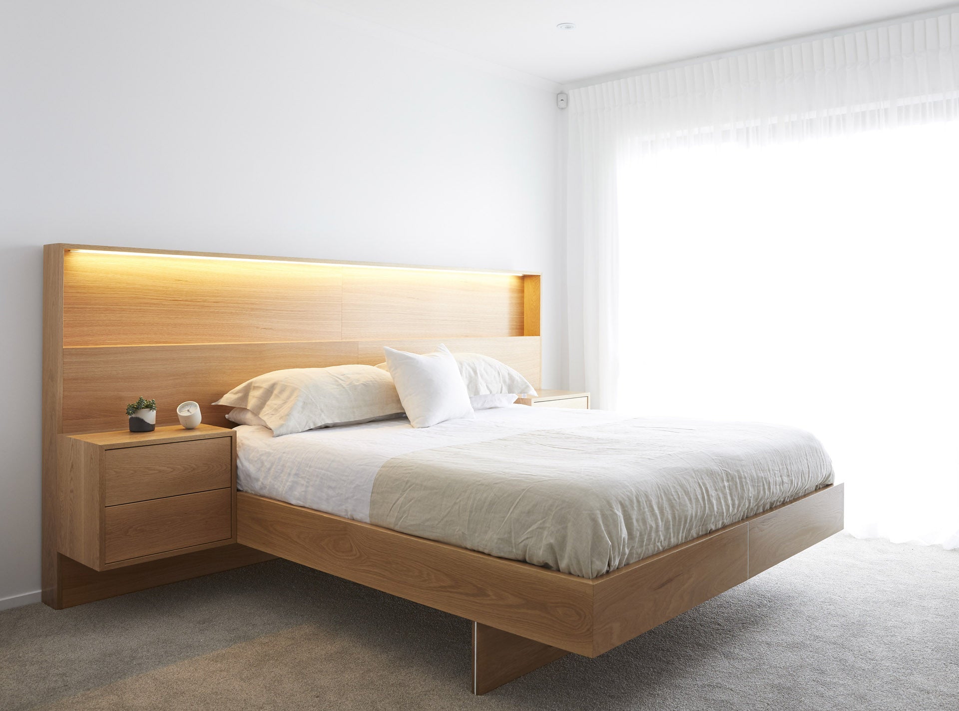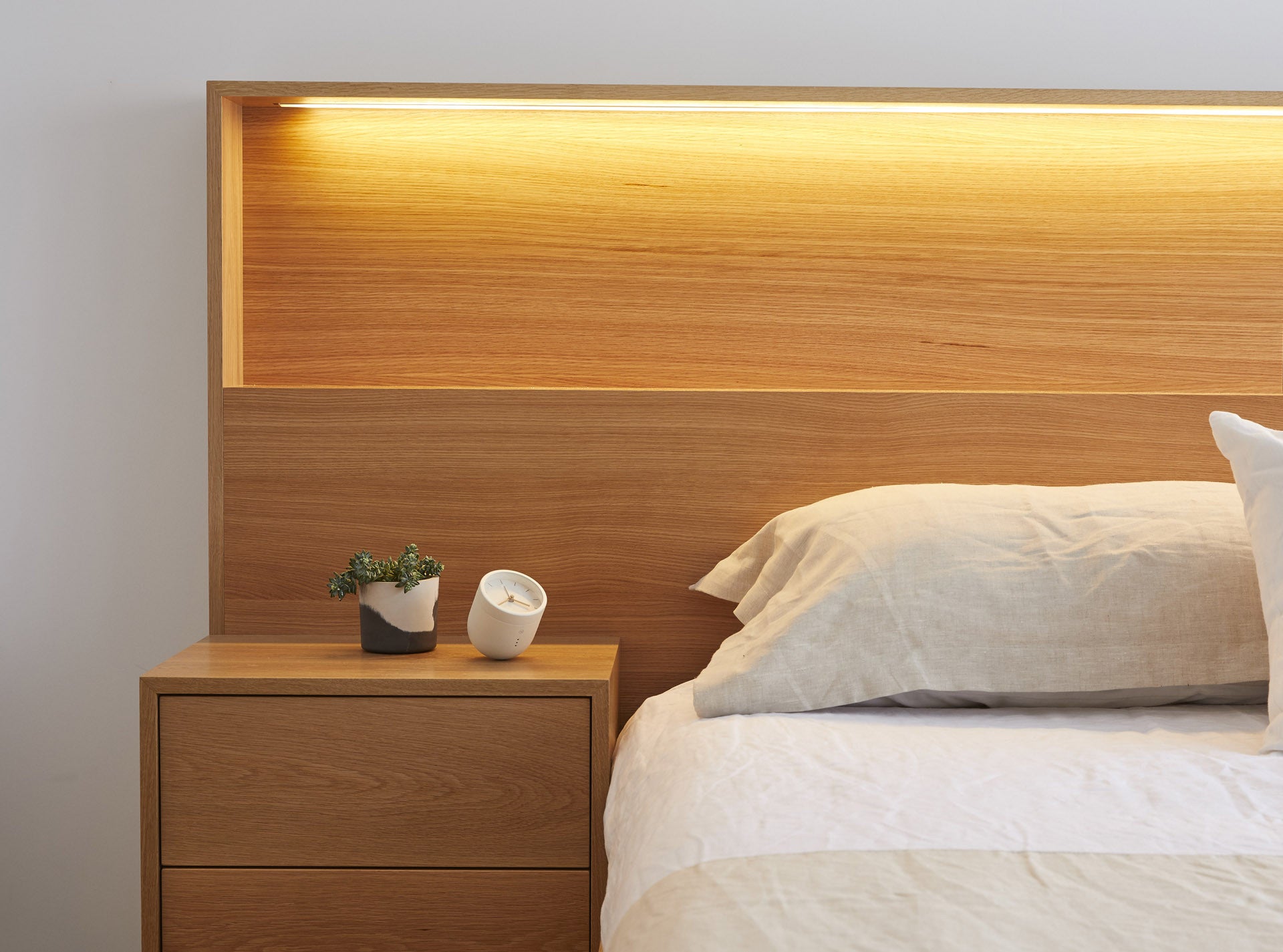 The headboard of the Fenton bed features a convenient recessed shelf, with warm ambient lighting supplied by a remote controlled LED.