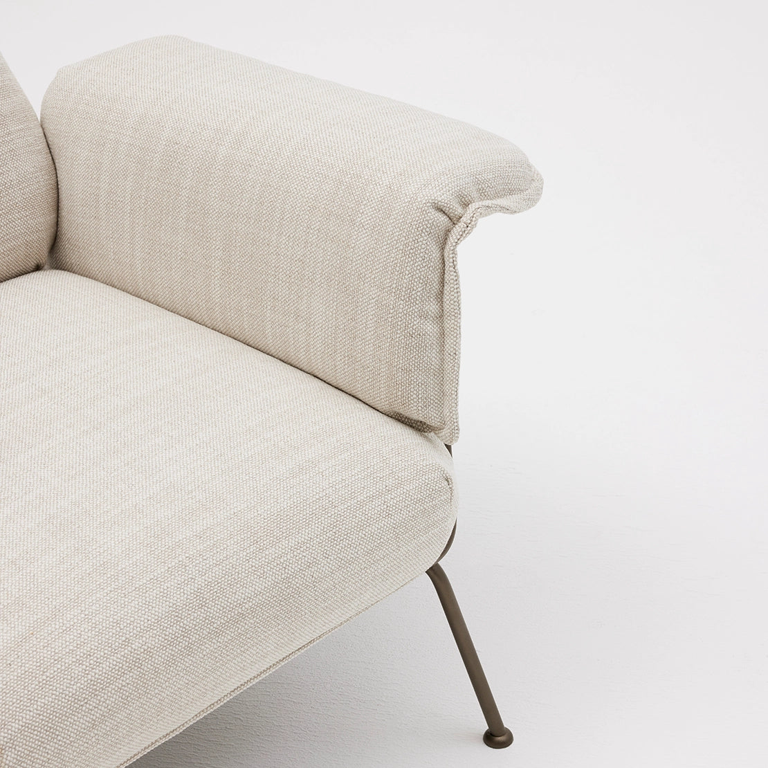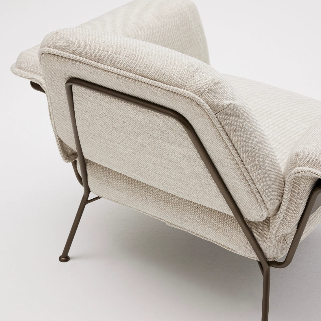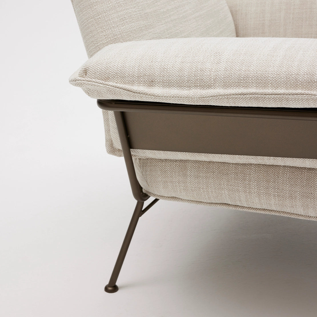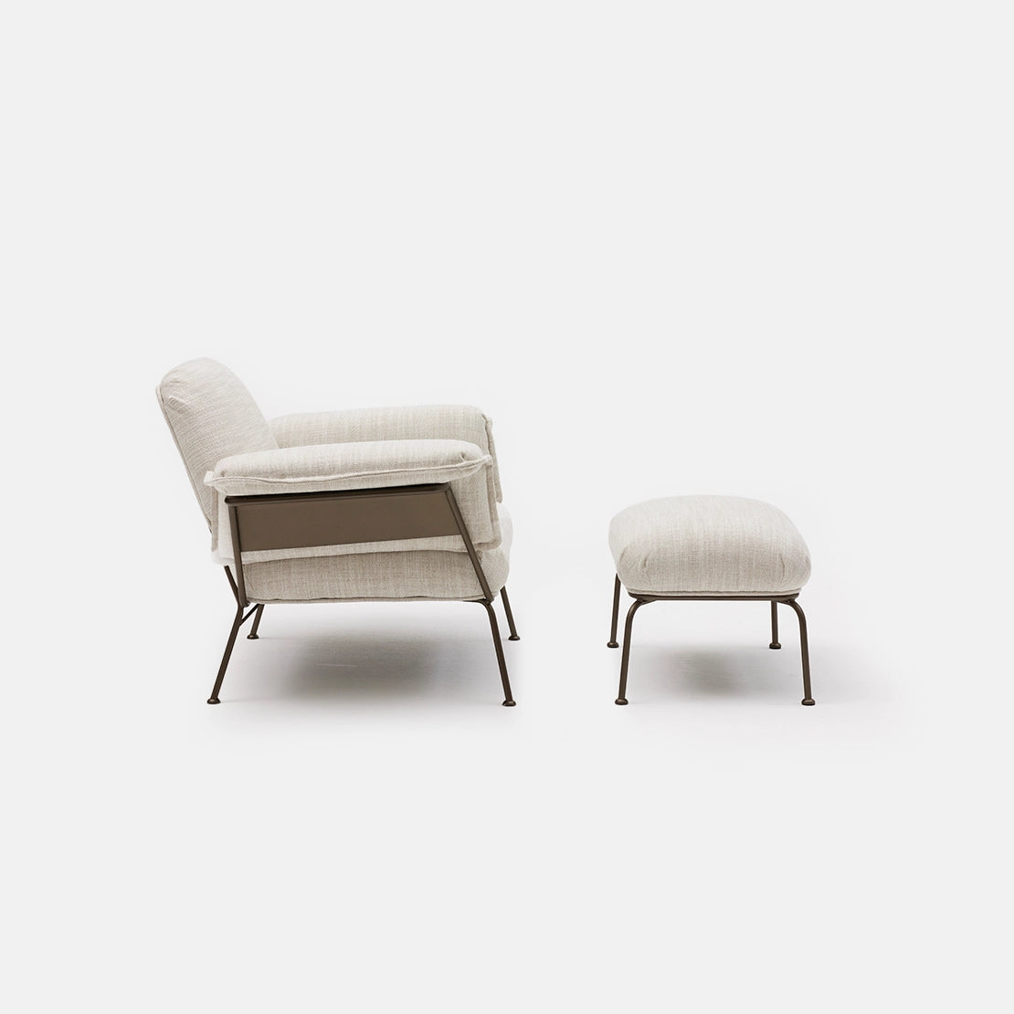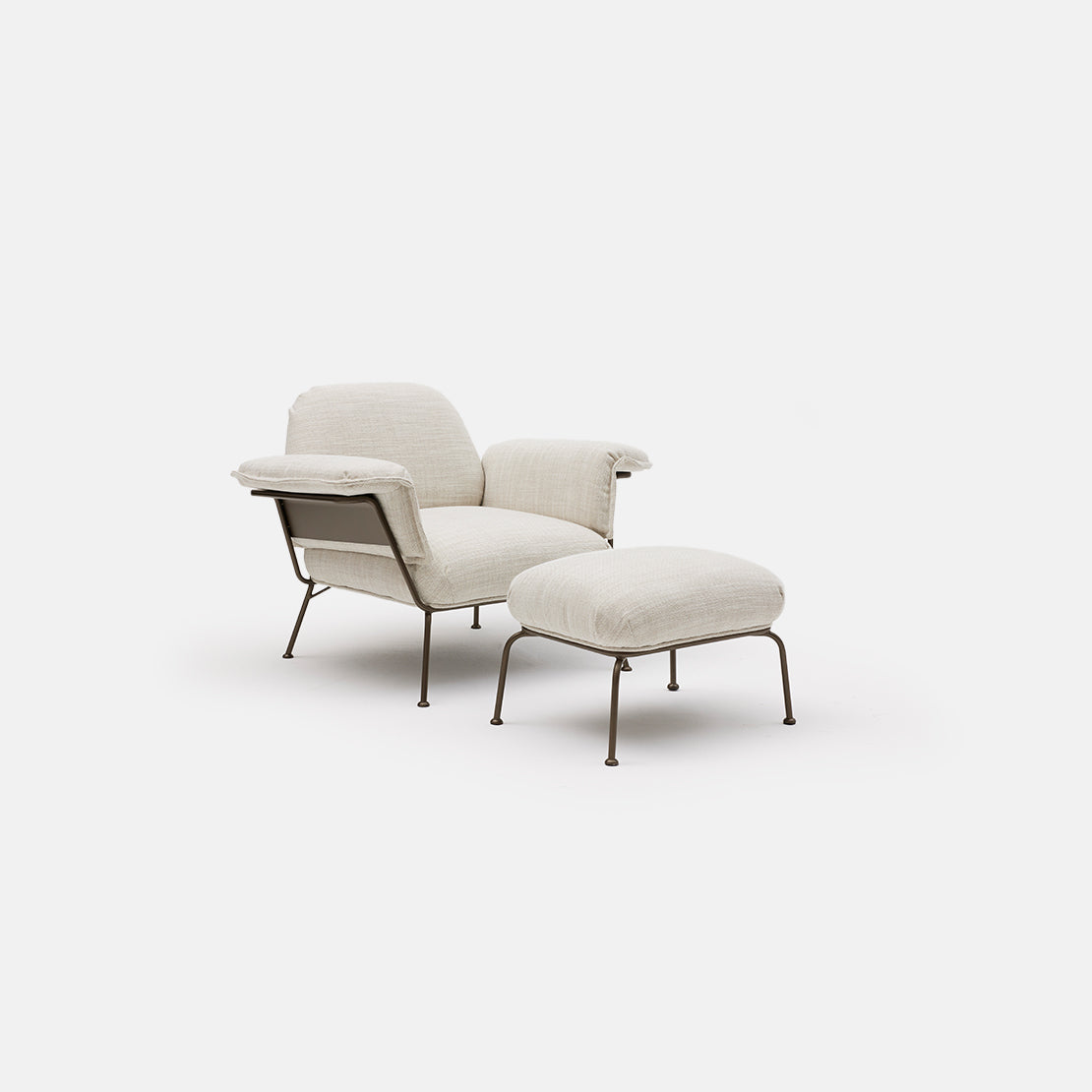 The Walker Chair and Footrest contrasts the strength of its slim bent steel frame with the large pillowy comfort of the seat cushions and arm rests. An inviting place to sit, be it lounge or reception area, the Walker Chair and Footrest offers customisable options for both frame and fabric.