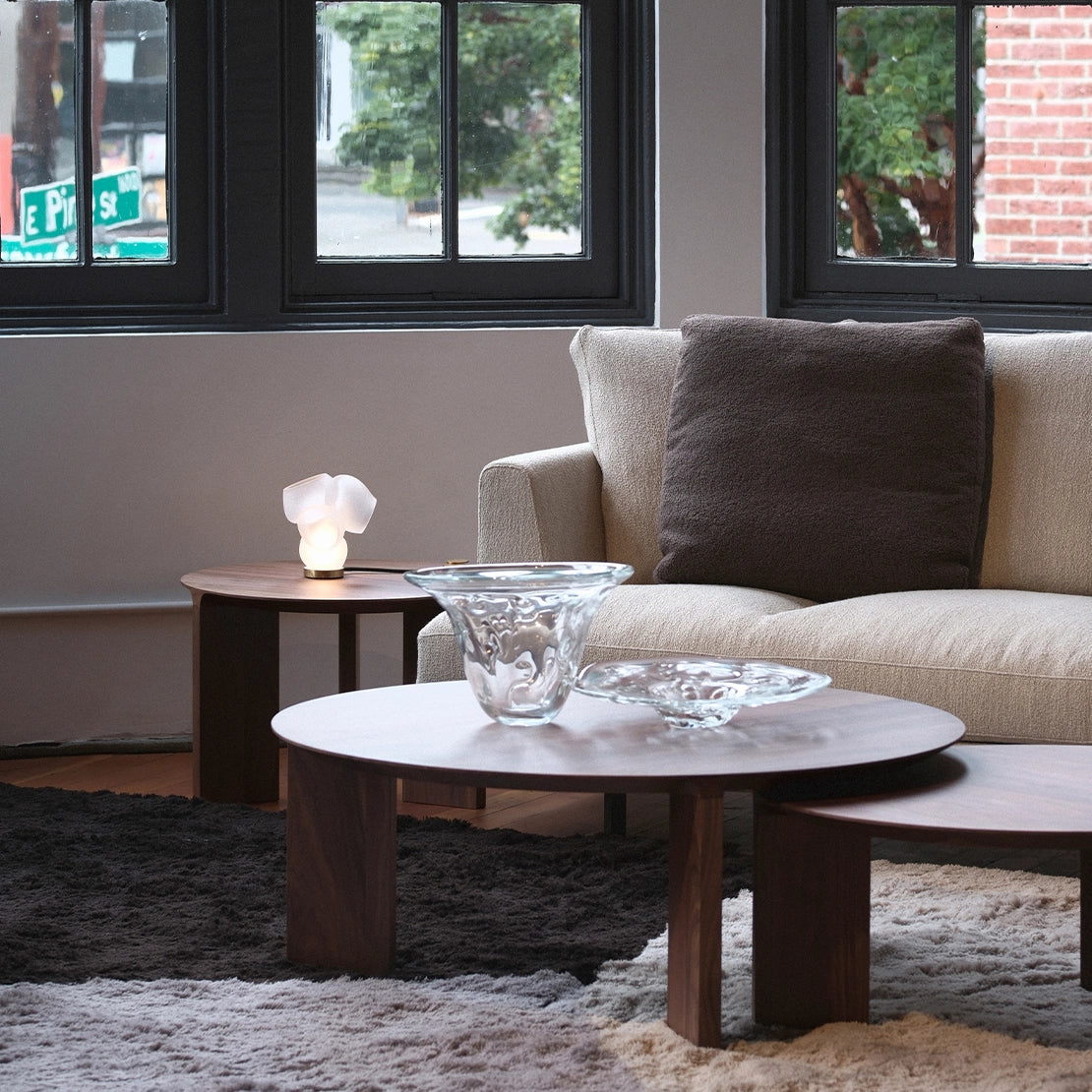 The coffee tables are crafted from solid Oak or Walnut with the signature beveled edge. They are available in three sizes (60cm, 80cm, and 100cm) and three heights (30cm, 35cm, and 40cm) so as to be able to nest together.
