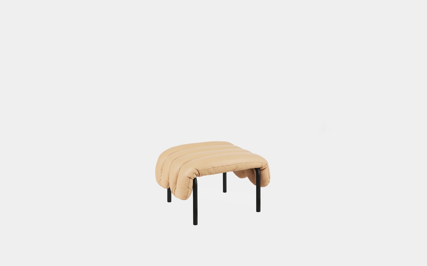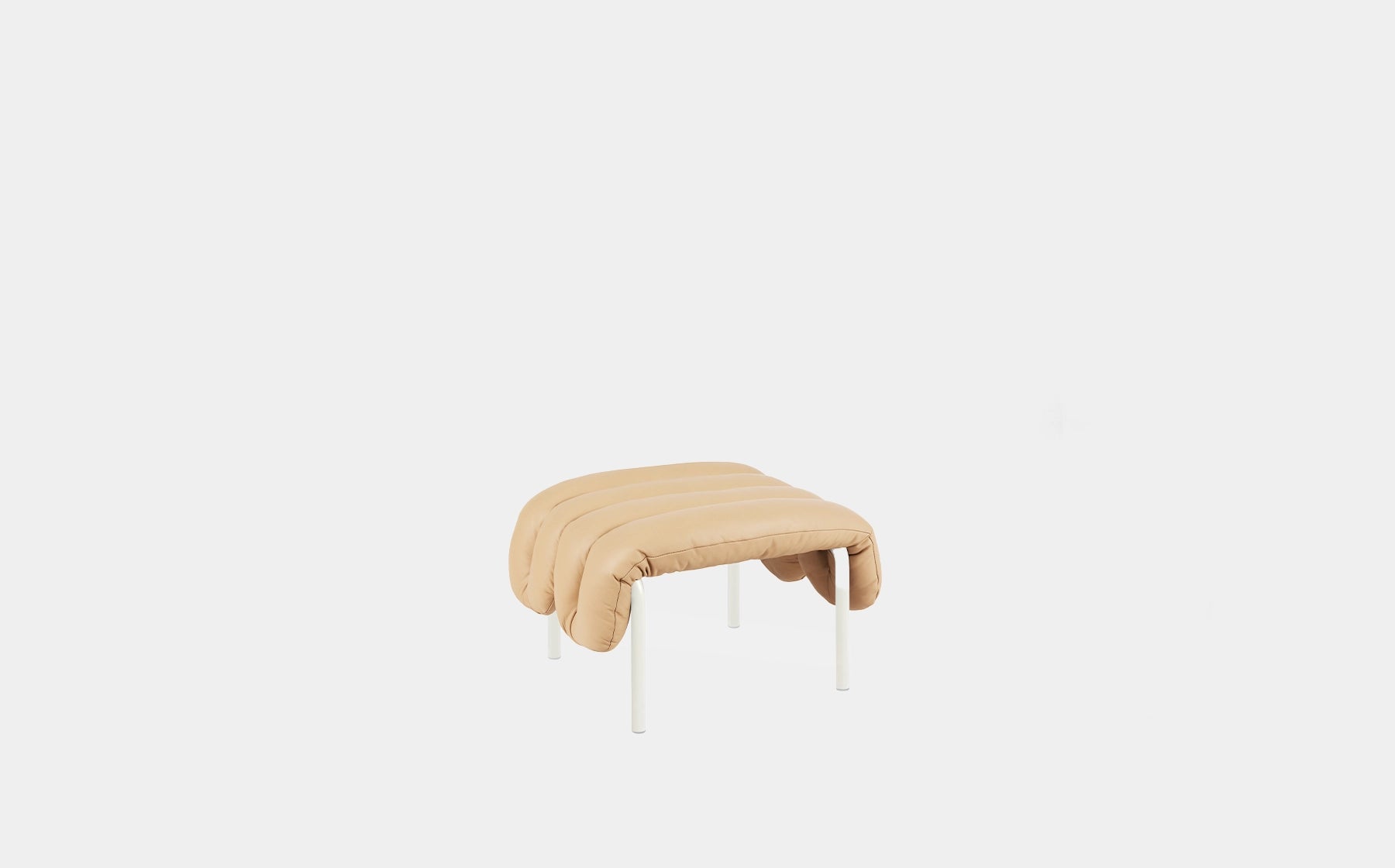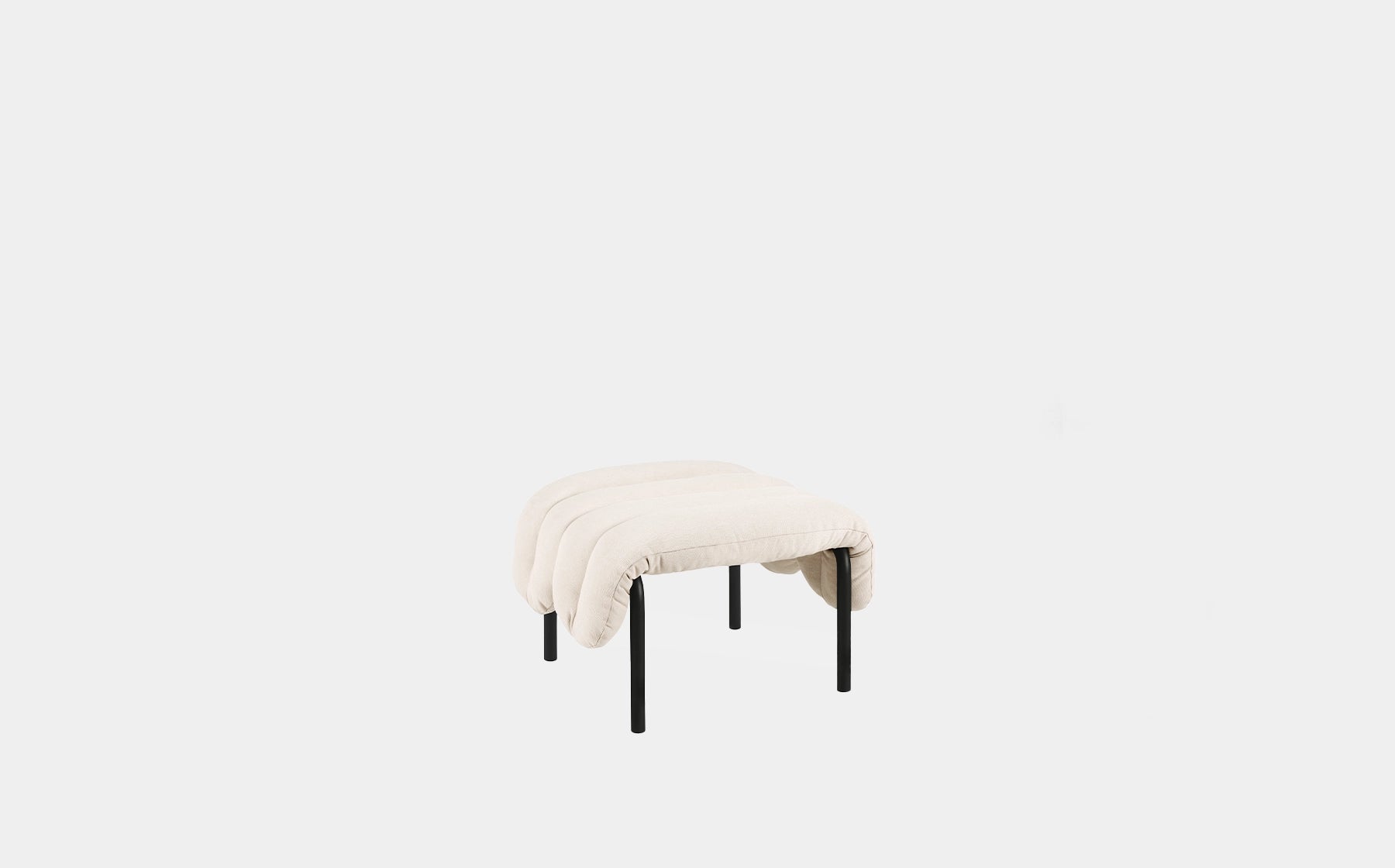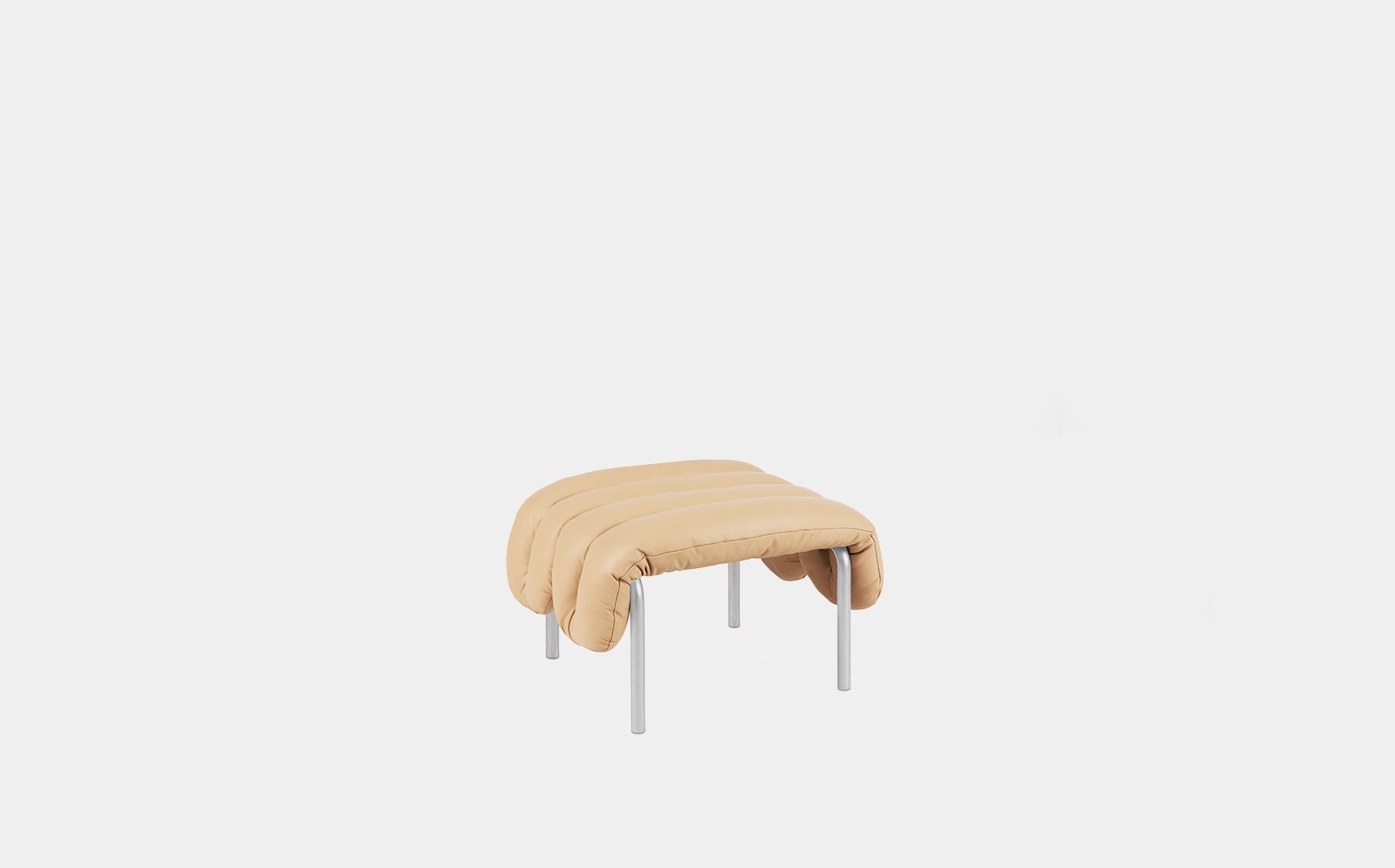 The detachable upholstery of the Puffy Ottoman is fat and plump, its generous shape spills freely over the sides of a tubular steel frame which, in stark contrast, is hard-lined and strong. The two key elements of this seating design by Faye Toogood are in purposeful and playful juxtaposition. The elementary frame is inspired by the rational structure of classic modernist design, whilst the extravagant quilt-like upholstery warmly embraces and envelopes, is comforting and reassuring. The Puffy Chair frame is available in powder-coated or sand-blasted steel finishes and a choice of thick canvas, chunky bouclé or luxurious leather upholstery.