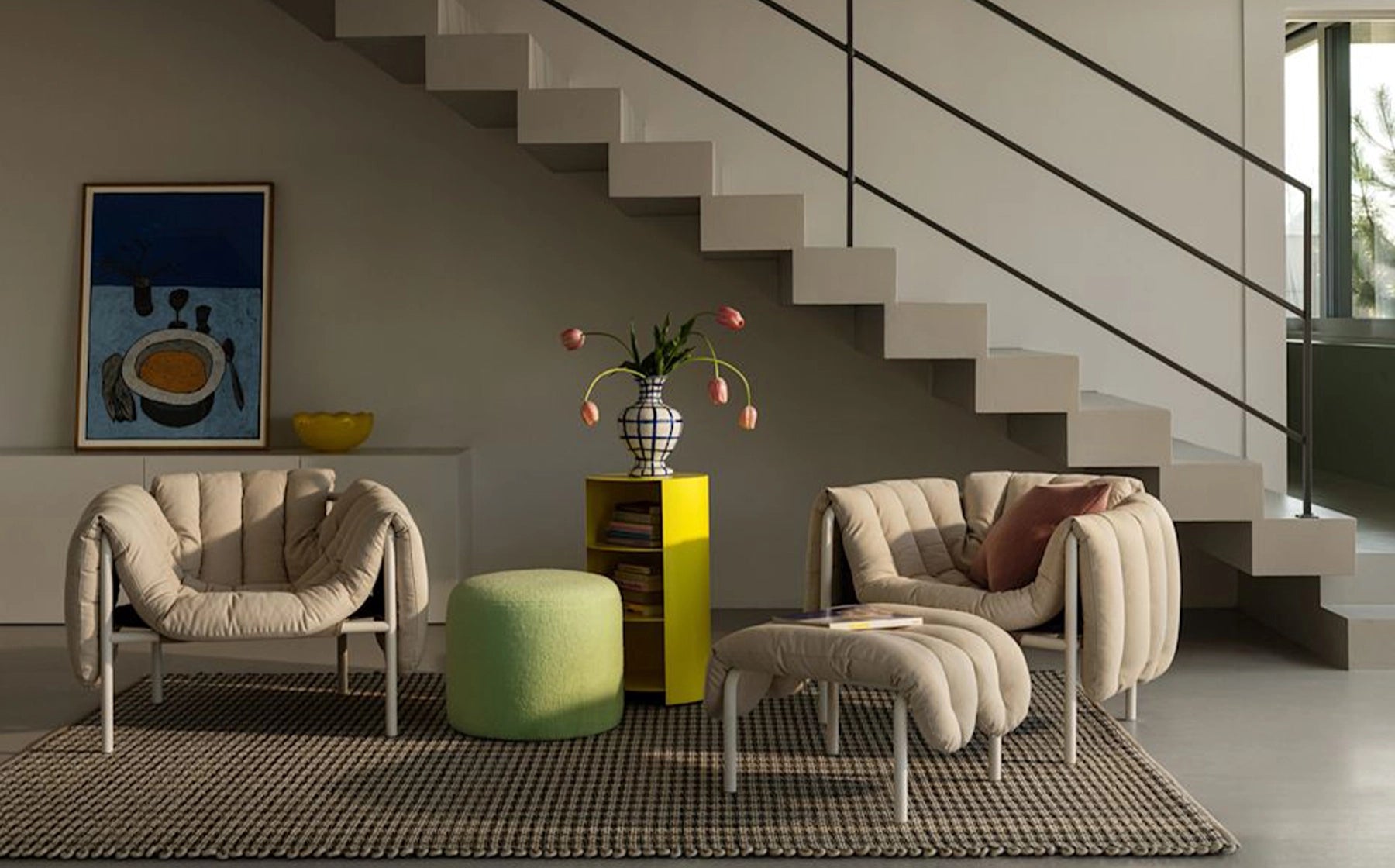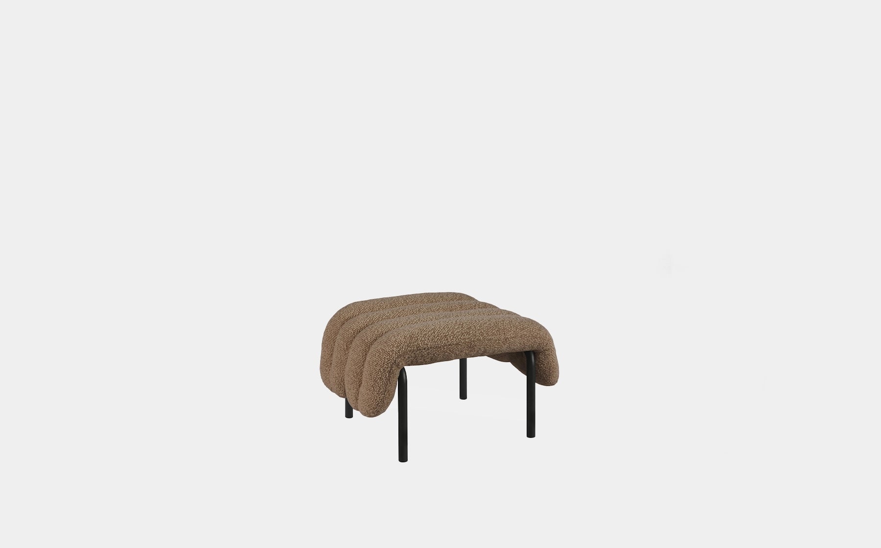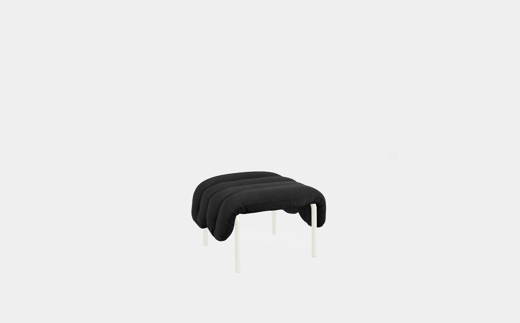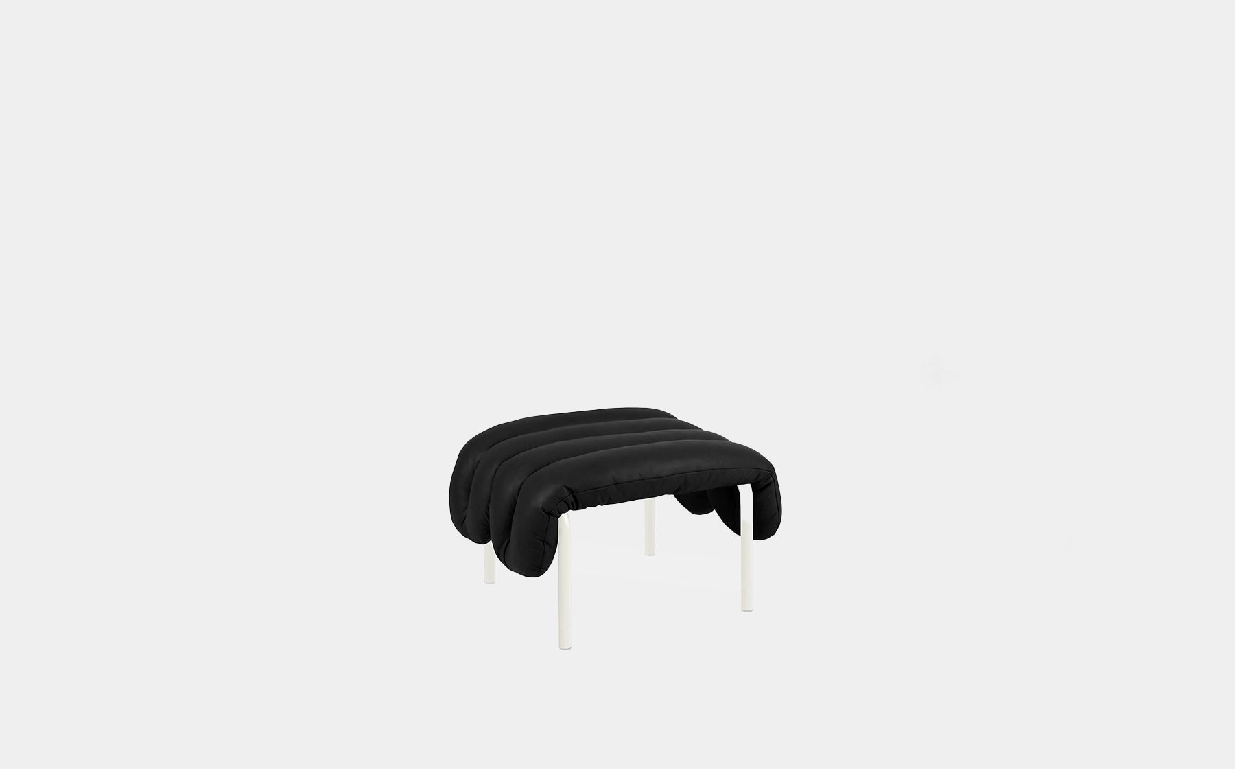 The detachable upholstery of the Puffy Ottoman is fat and plump, its generous shape spills freely over the sides of a tubular steel frame which, in stark contrast, is hard-lined and strong. The two key elements of this seating design by Faye Toogood are in purposeful and playful juxtaposition. The elementary frame is inspired by the rational structure of classic modernist design, whilst the extravagant quilt-like upholstery warmly embraces and envelopes, is comforting and reassuring. The Puffy Chair frame is available in powder-coated or sand-blasted steel finishes and a choice of thick canvas, chunky bouclé or luxurious leather upholstery.