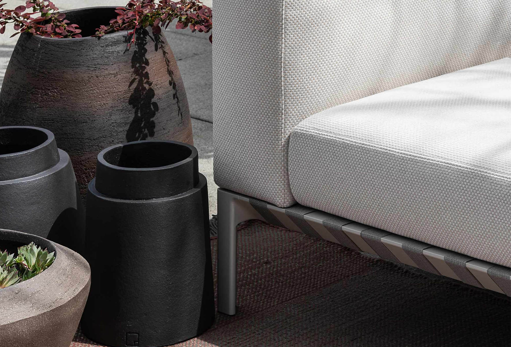 The generous, shapely upholstery of the exterior series ensures comfort while achieving a sense of visual lightness, supported by woven bands that wrap around the slender orthogonal frame. Each piece functions beautifully on its own, but they can also be combined as sectional elements, allowing for limitless unique compositions.