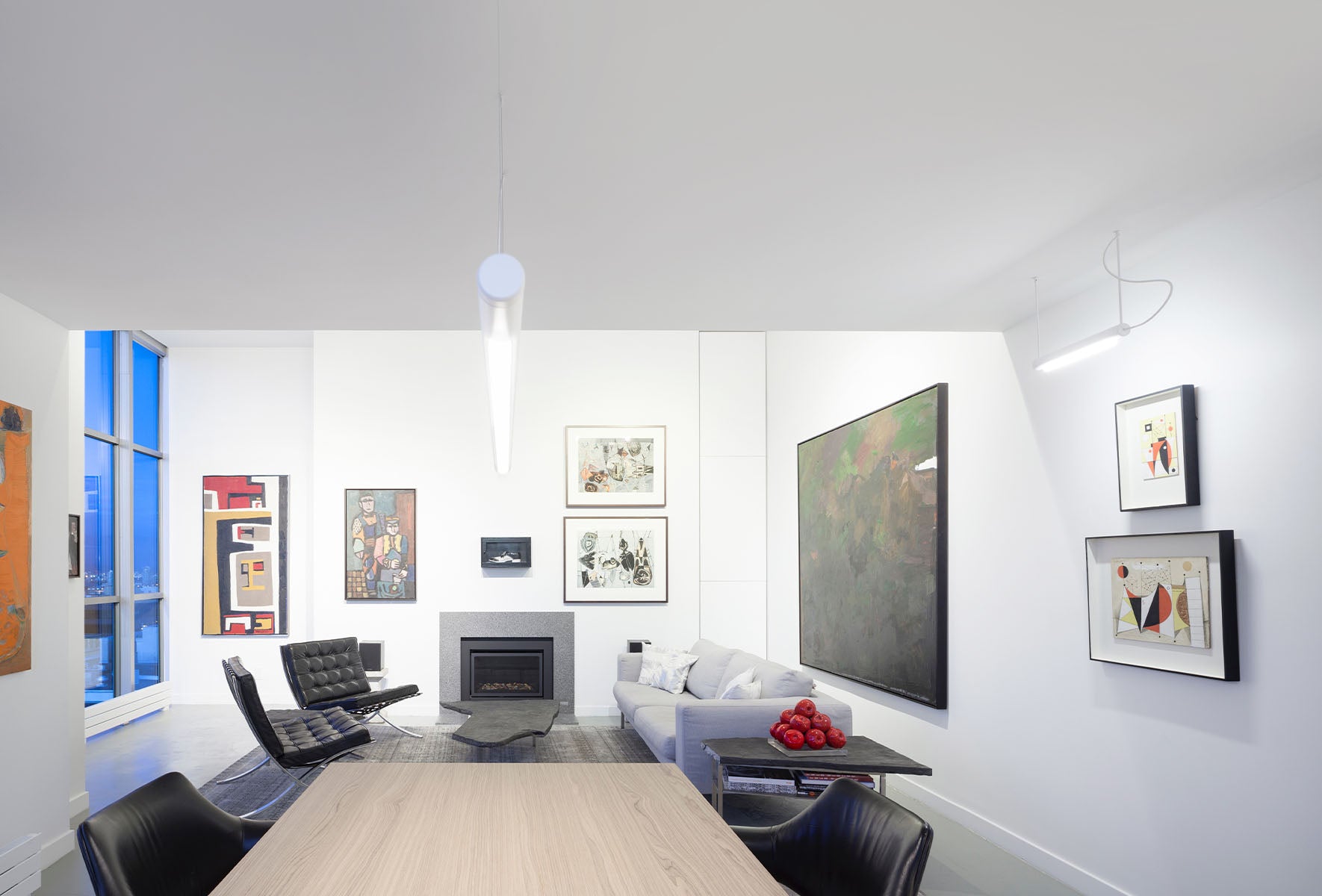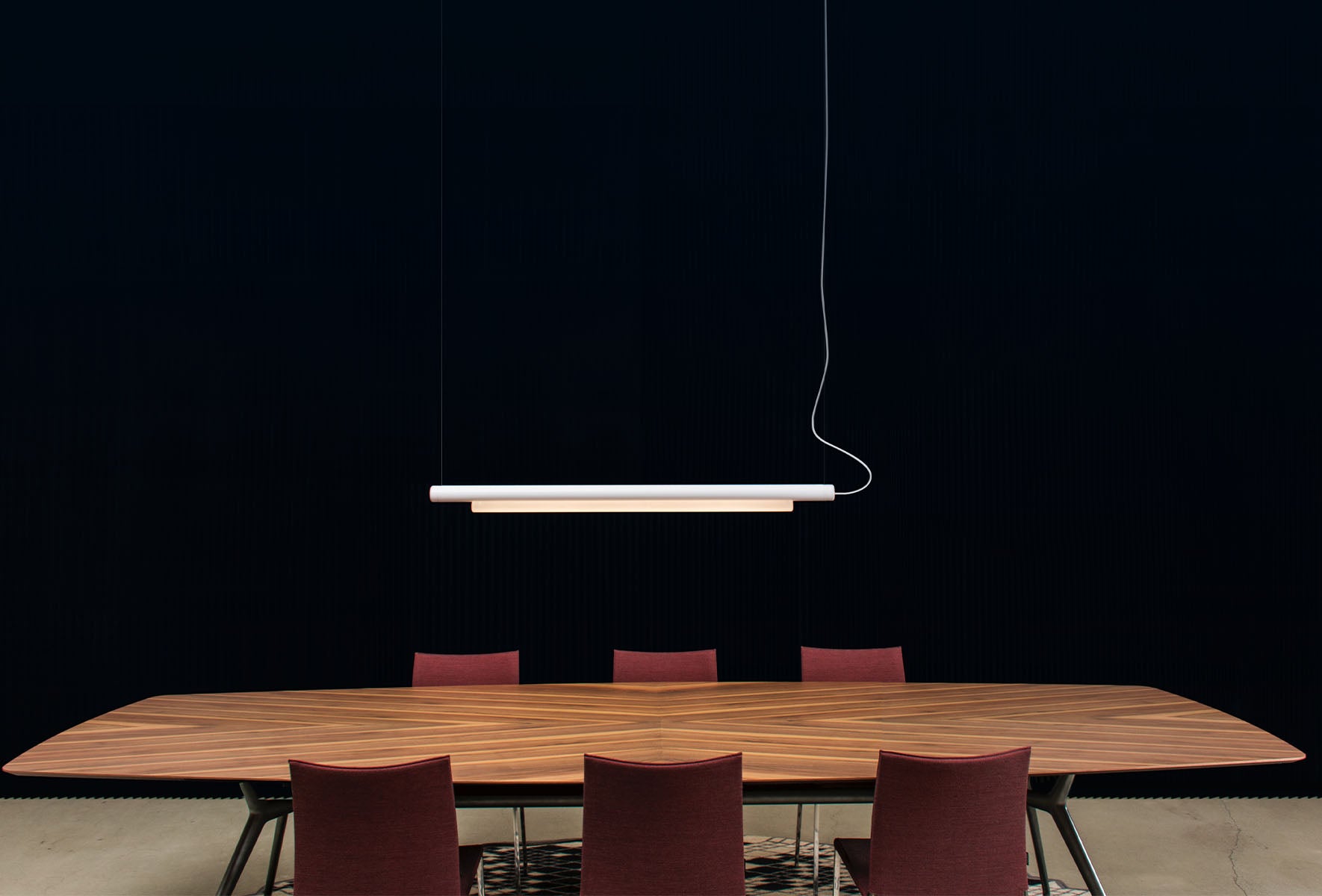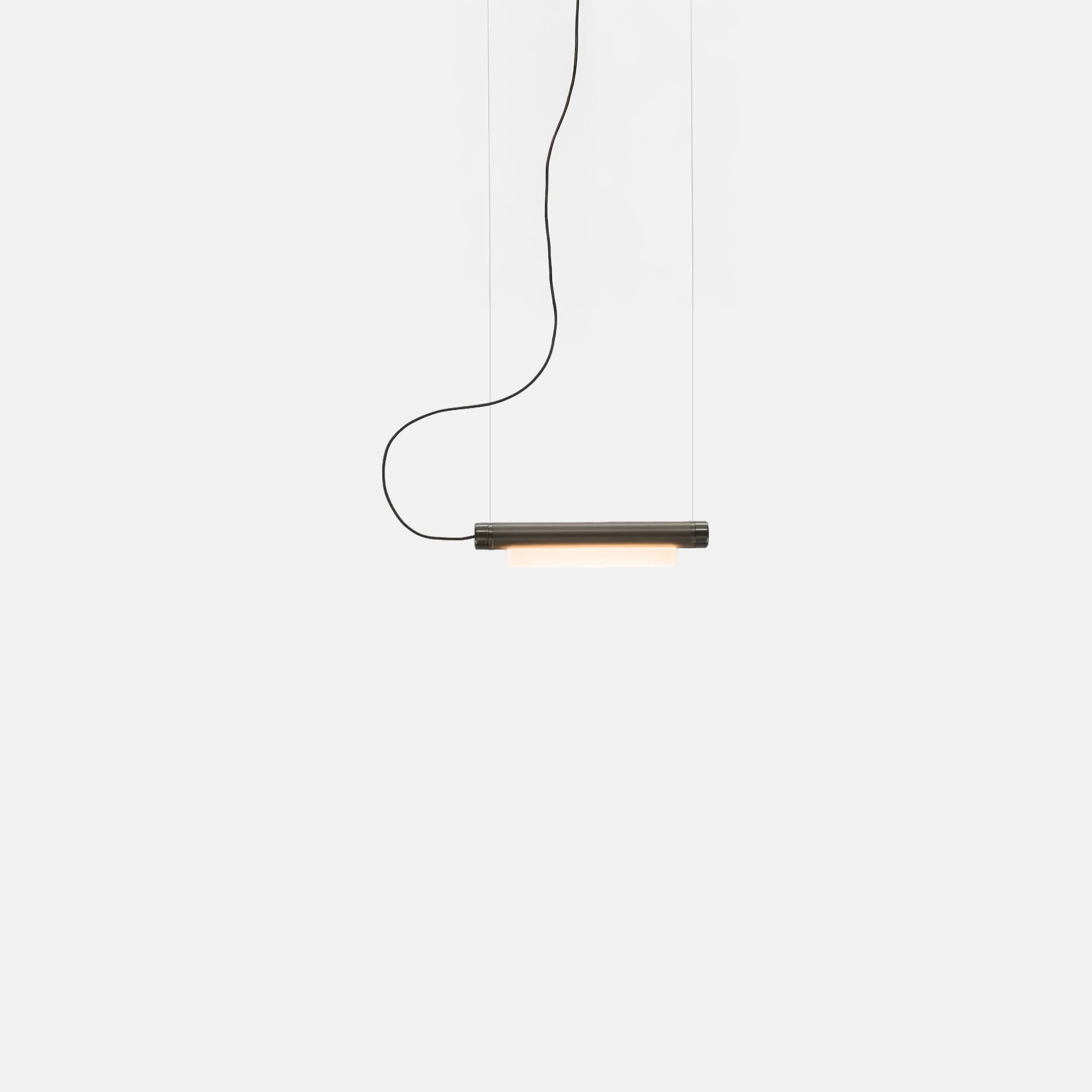 Stark, elegant, and resolute, The Pipeline 40 pendant lamp suspends horizontally from 1mm thin aircraft cables, creating the illusion of floating in air. A wide horizontal beam of light is emitted through a diffuser designed to soften the LED light while maximising output. The Pipeline pendant may suspend horizontally level or at an angle, individually or plurally and within the space it inhabits.