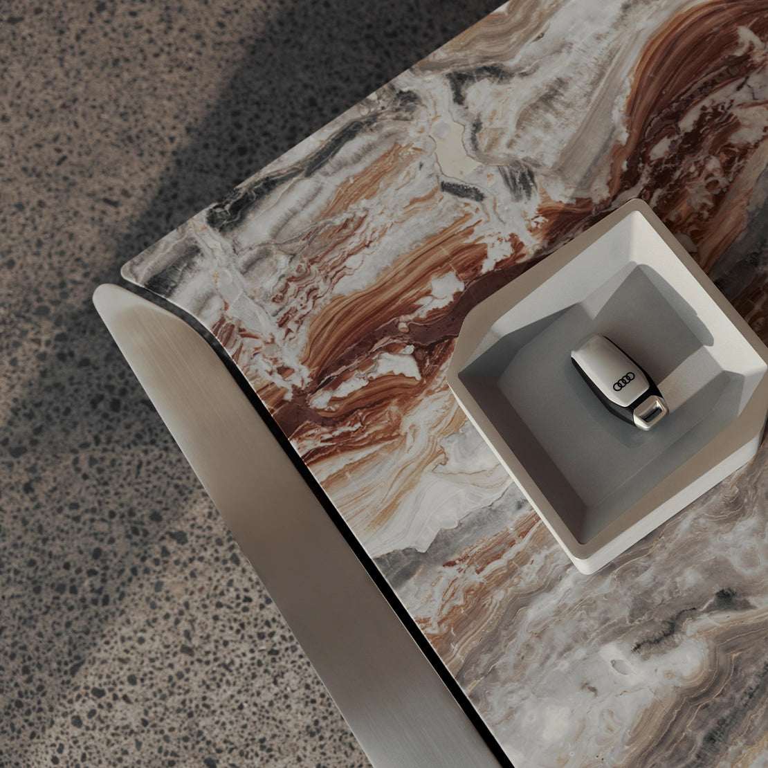 Crafted with polished stainless steel plinth legs and a softly contoured marble tabletop, Matter mirrors the car’s interplay of strength and fluidity. The table’s base echoes the structural poise and engineered finesse of Audi’s design language, while the marble top’s subtle curves reflect the vehicle’s aerodynamic silhouette.