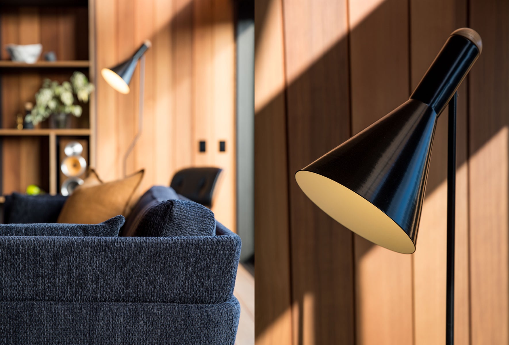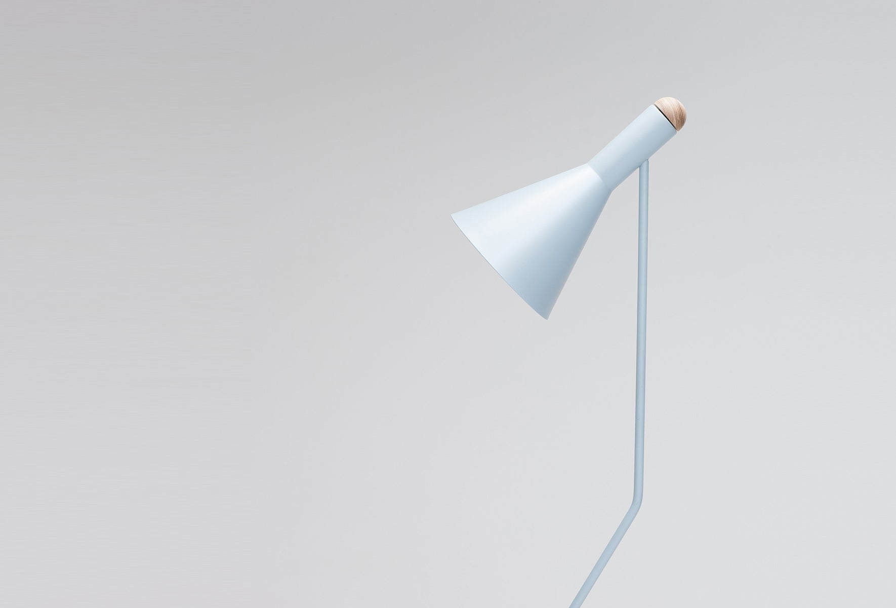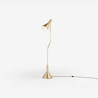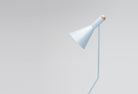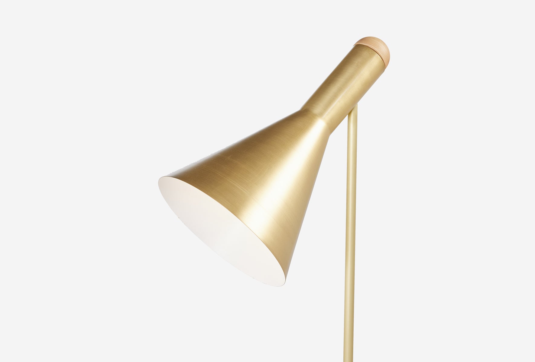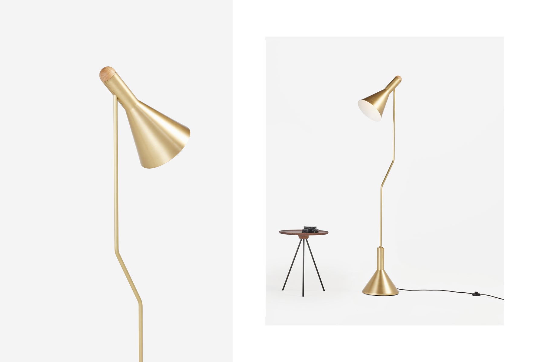 The Switch Floor Lamp is constructed from powder-coated spun aluminium or brushed brass with a domed American Ash fitting at the back of the shade. This feature softens the angular aesthetic of the piece.