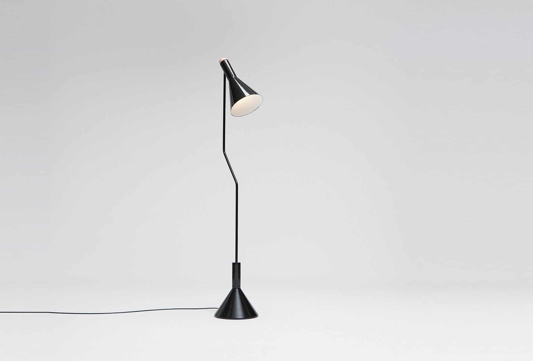 The Switch Floor Lamp's simple geometric shapes of the shade and base directly relate to each other while the 'kink' in the vertical stand allows the light shade to sit centered and balanced in relation to the base.